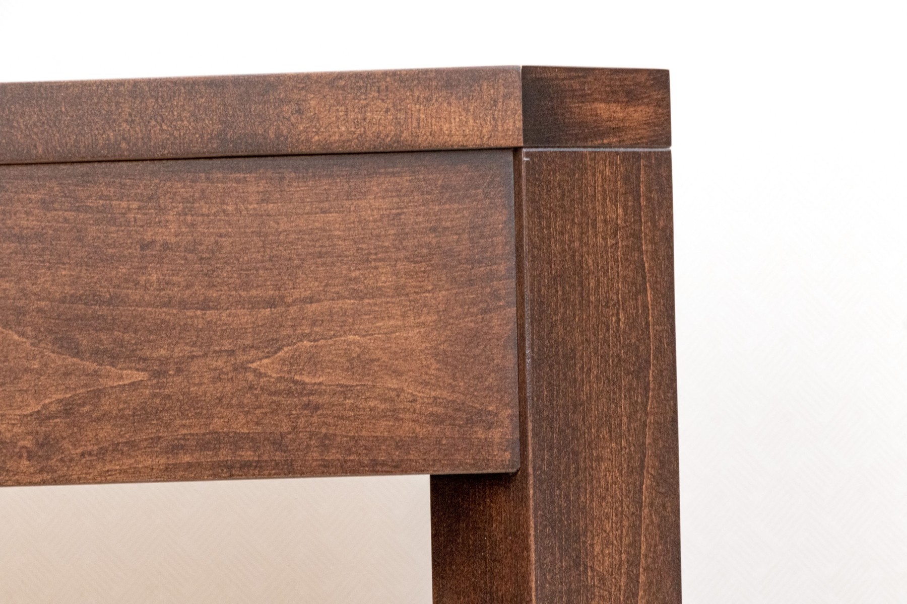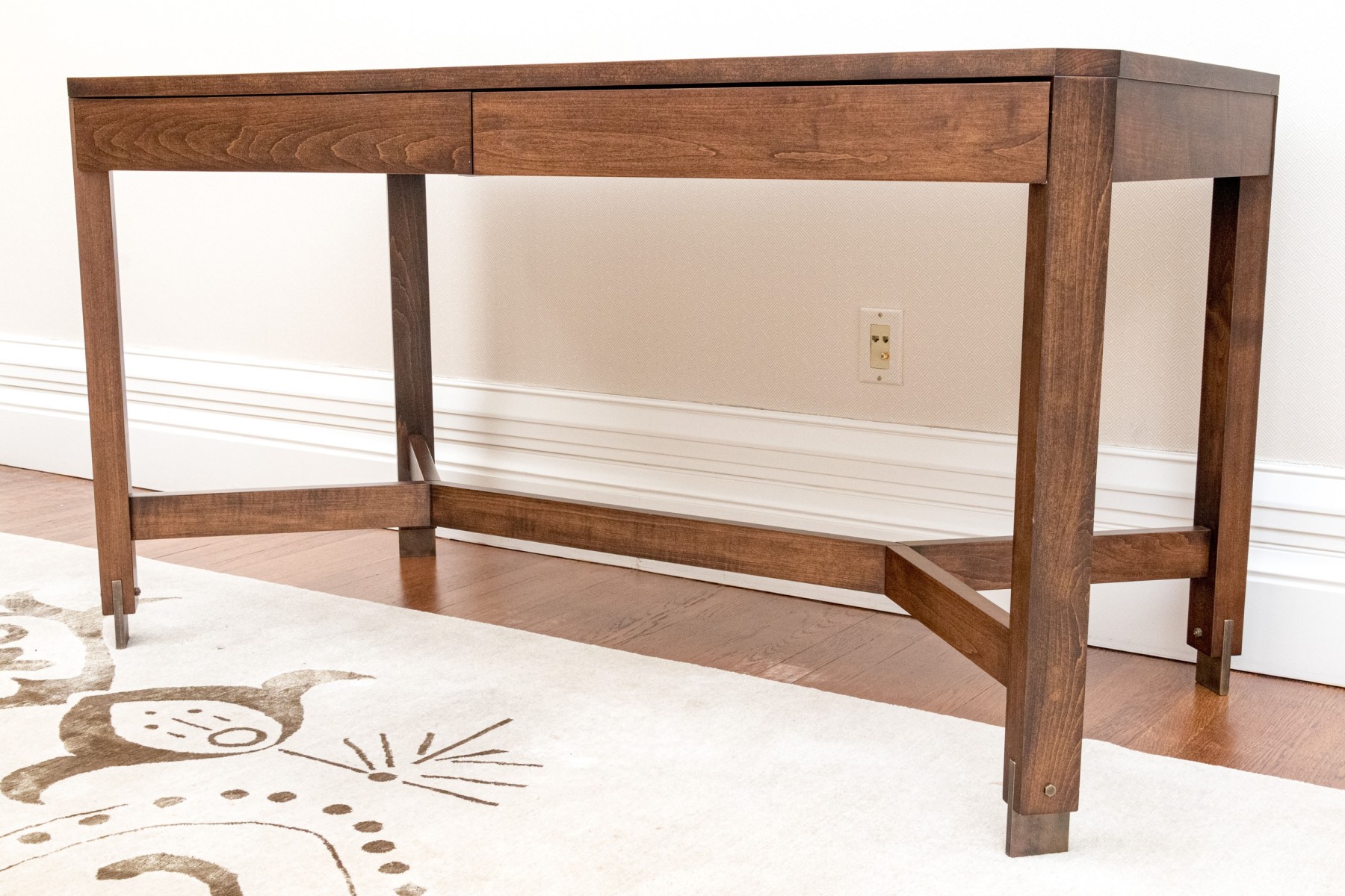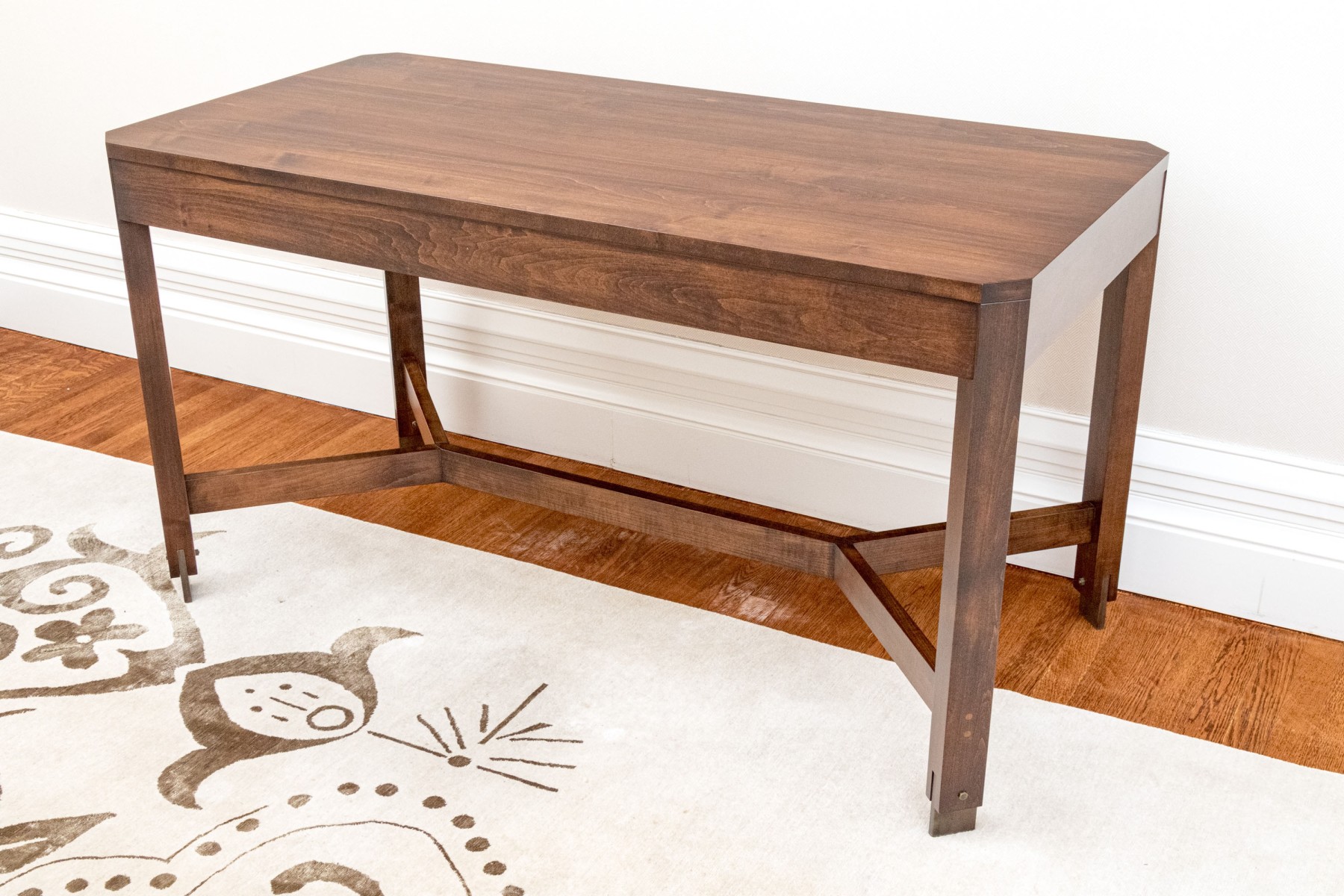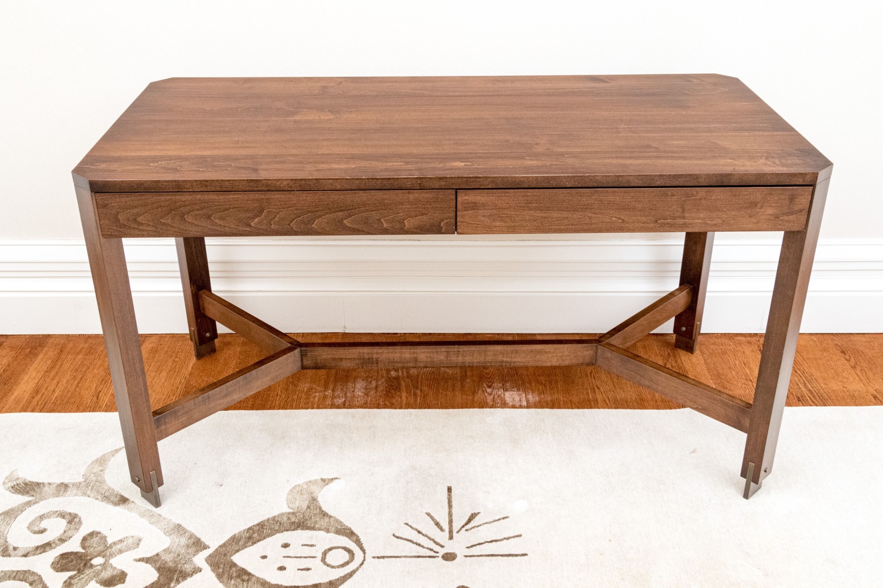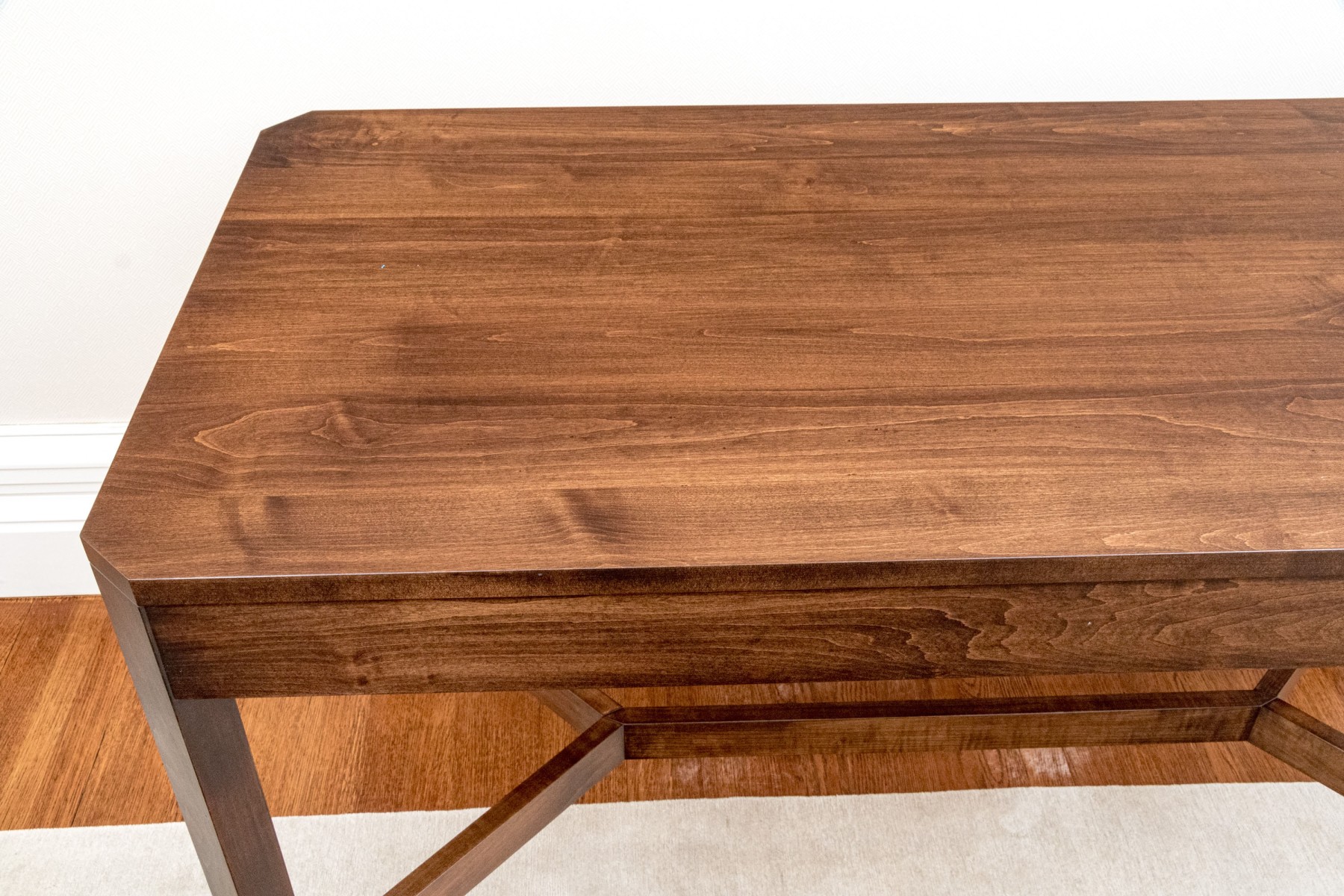 Brown maple wood. Two soft close dovetail drawers. Soft angled corners, contemporary stretcher and stunning modern bronze feet. Fine craftsmanship. Excellent condition!