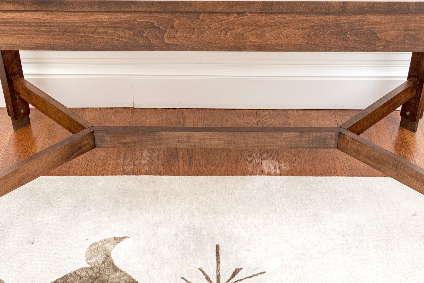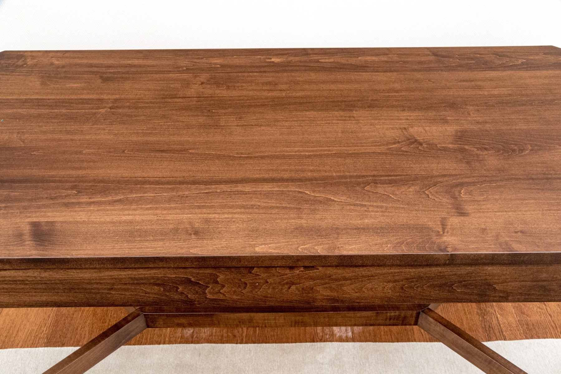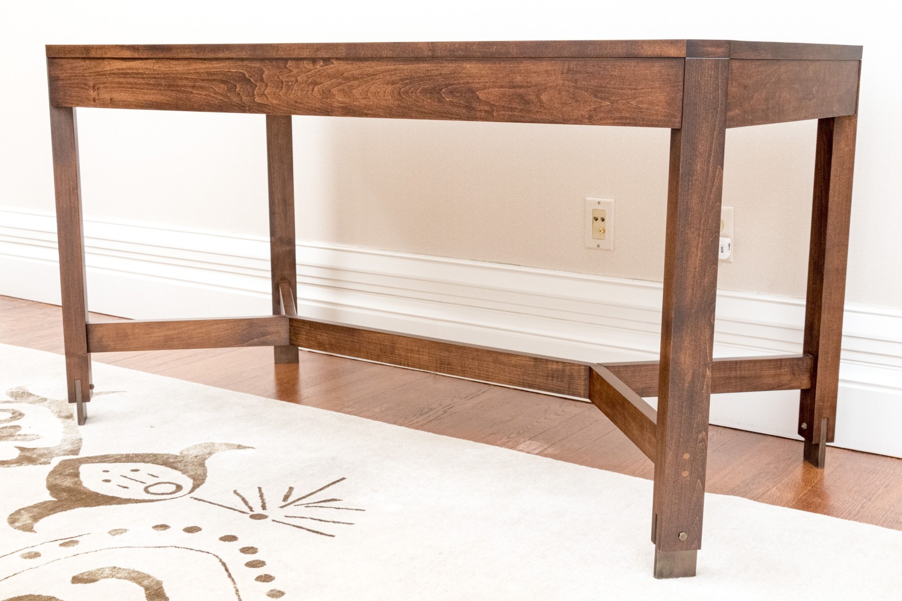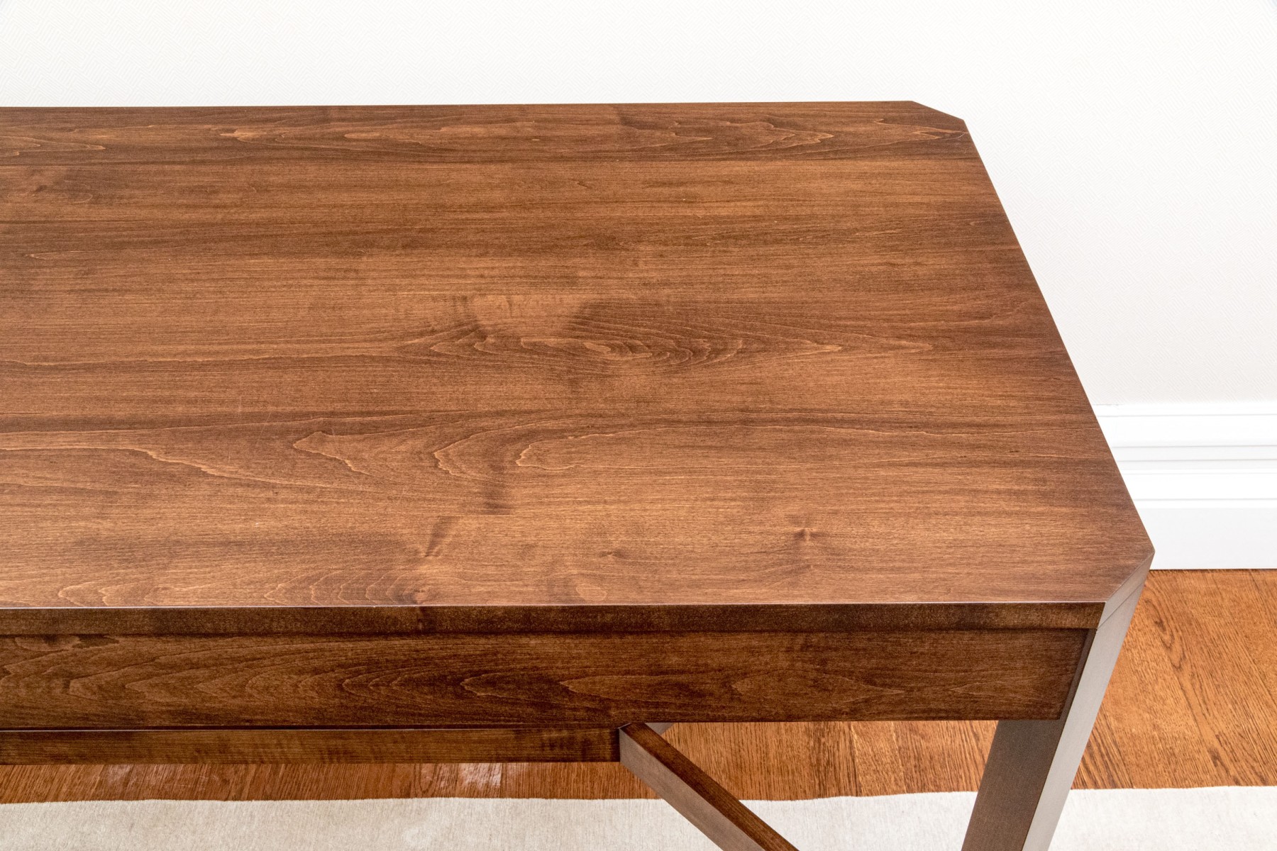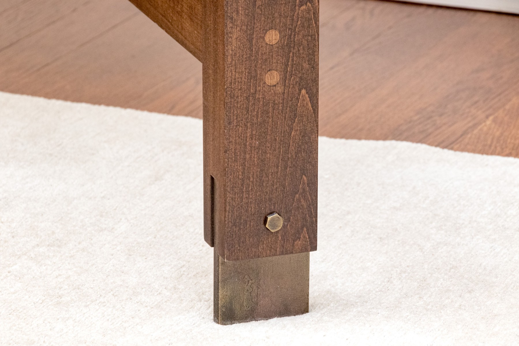 Brown maple wood. Two soft close dovetail drawers. Soft angled corners, contemporary stretcher and stunning modern bronze feet. Fine craftsmanship. Excellent condition!