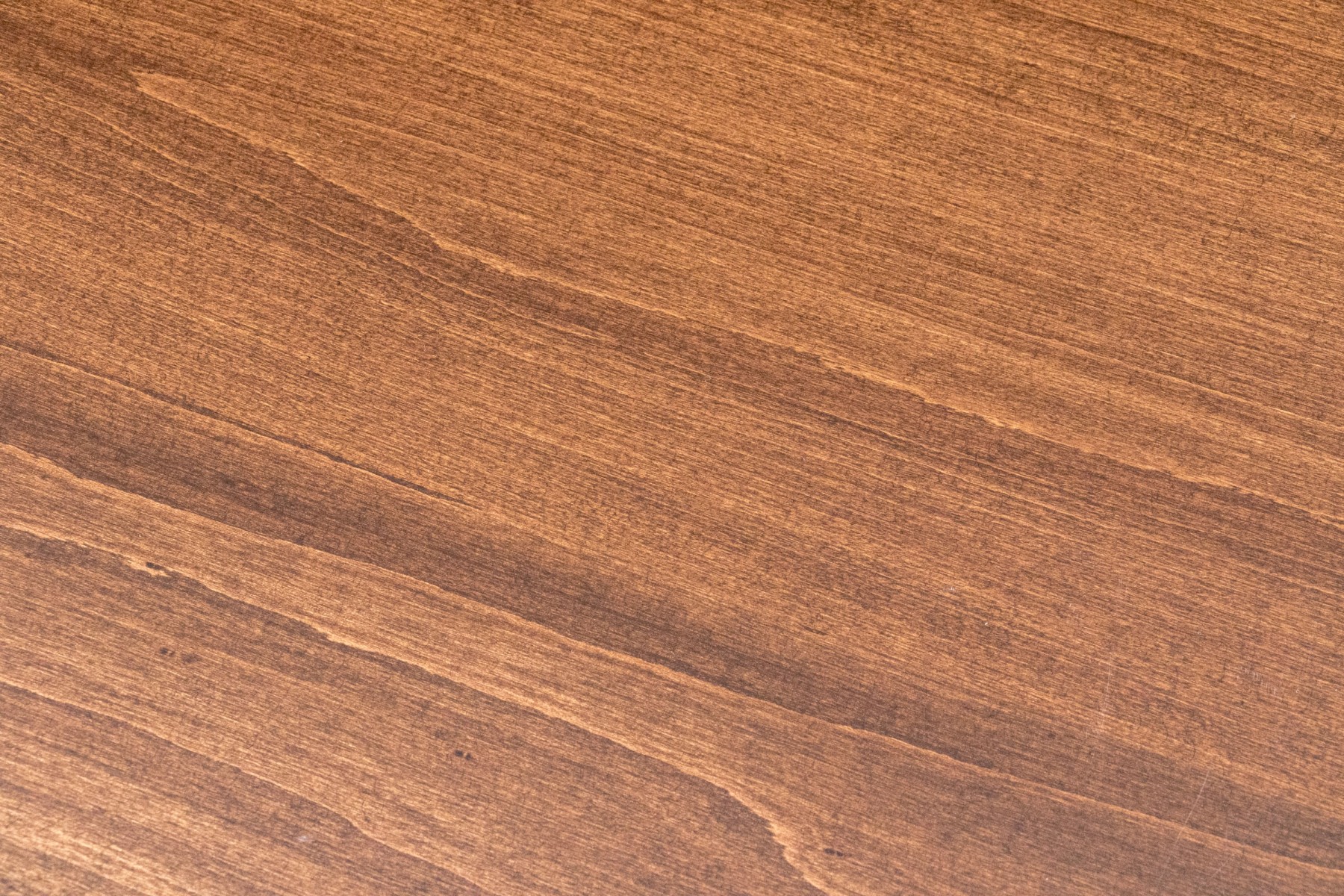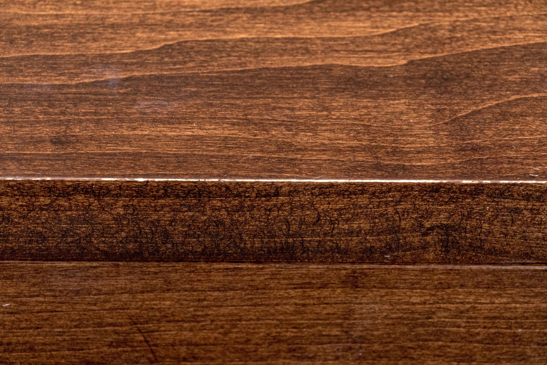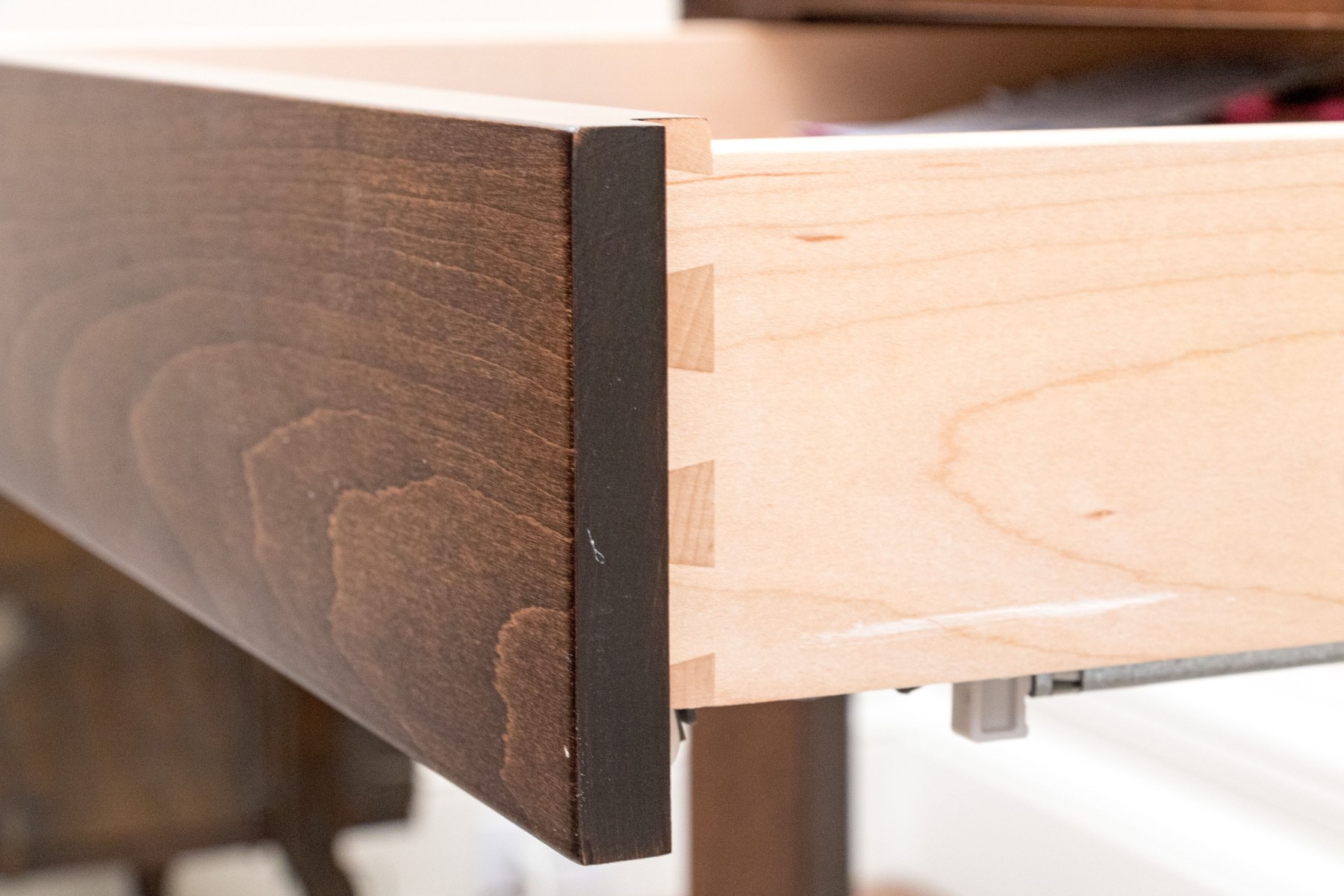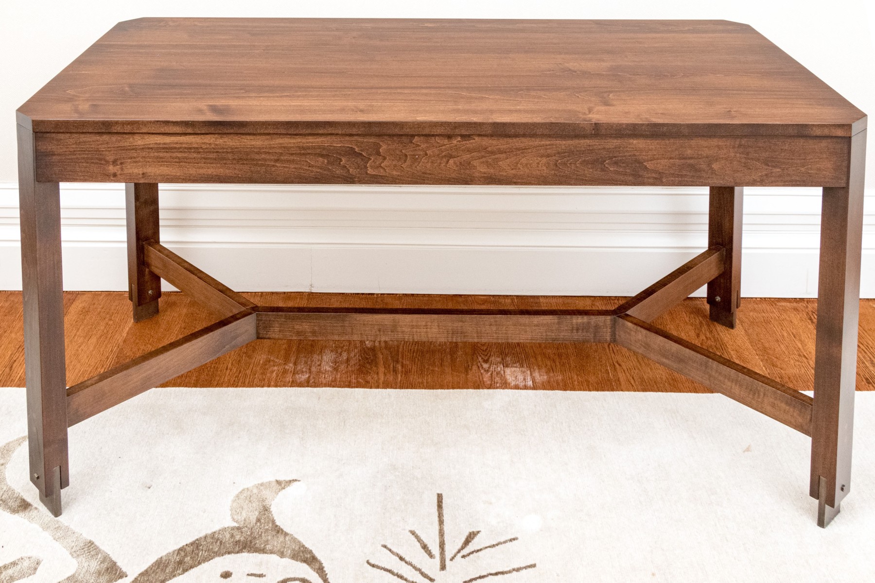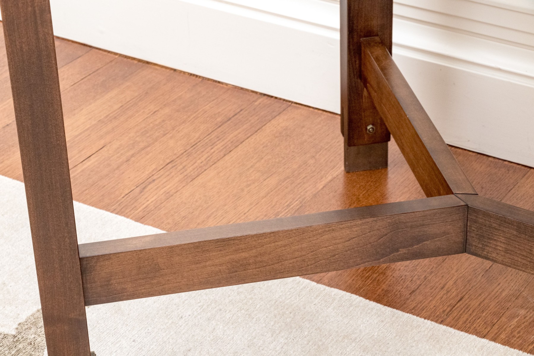 Brown maple wood. Two soft close dovetail drawers. Soft angled corners, contemporary stretcher and stunning modern bronze feet. Fine craftsmanship. Excellent condition!