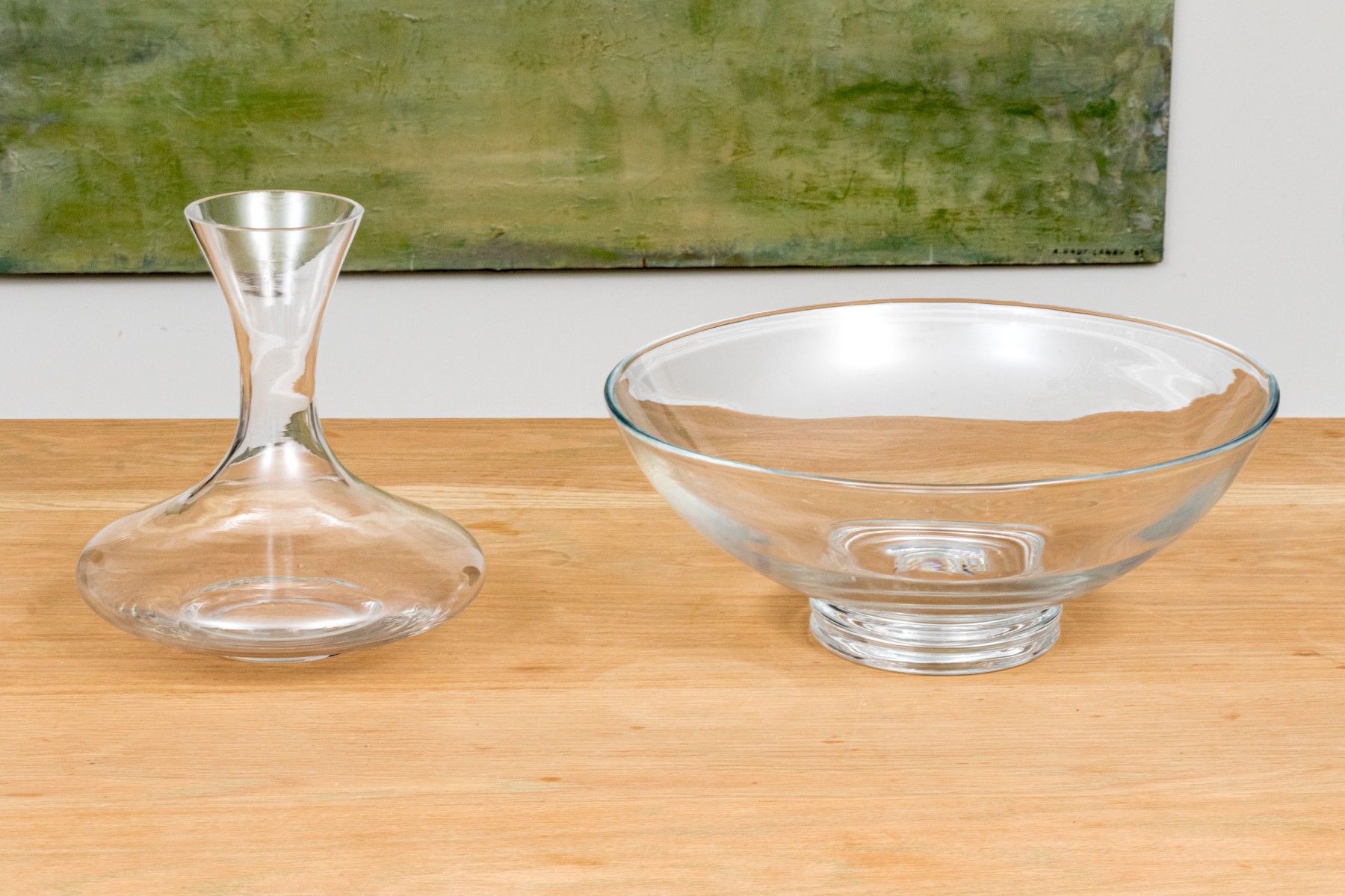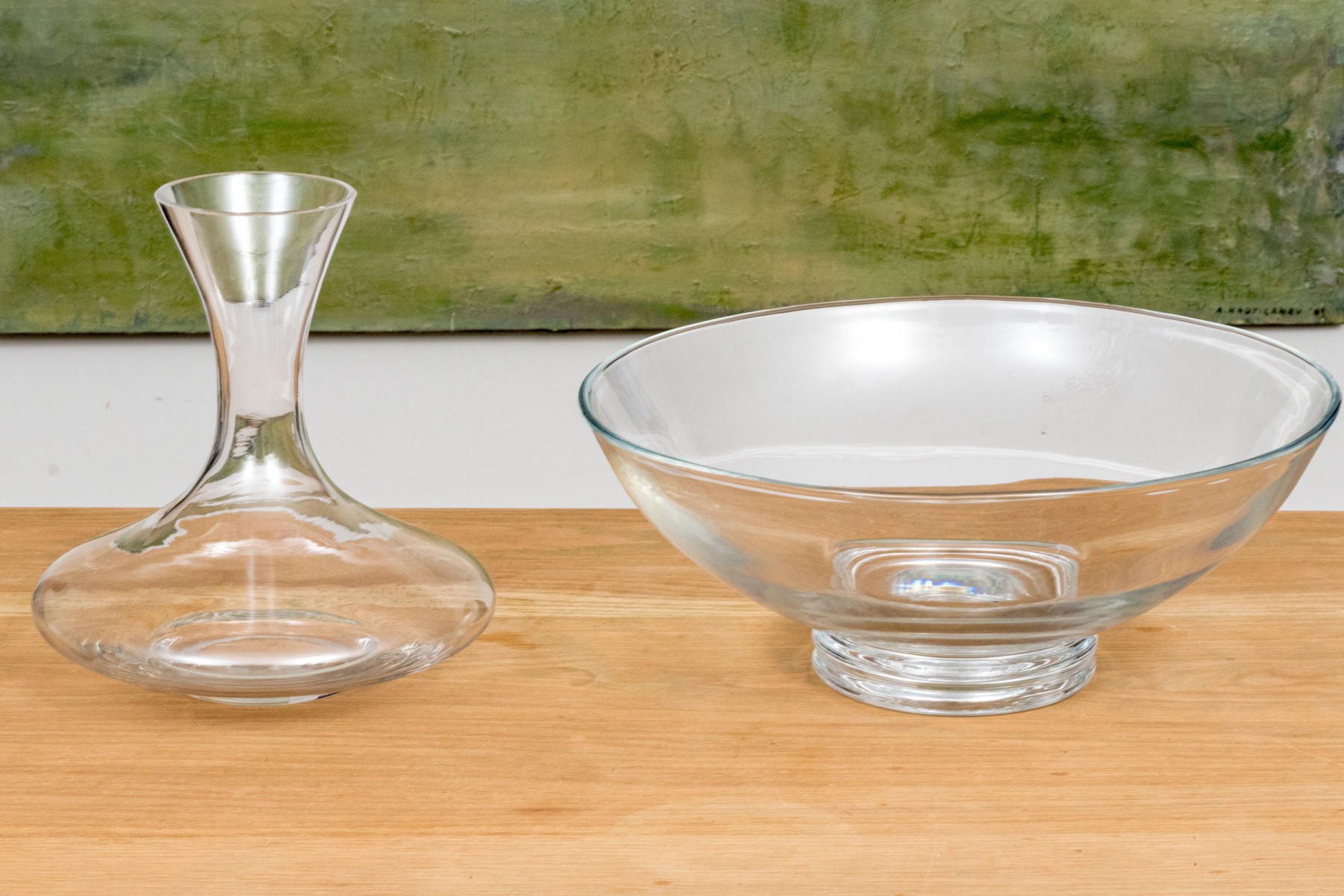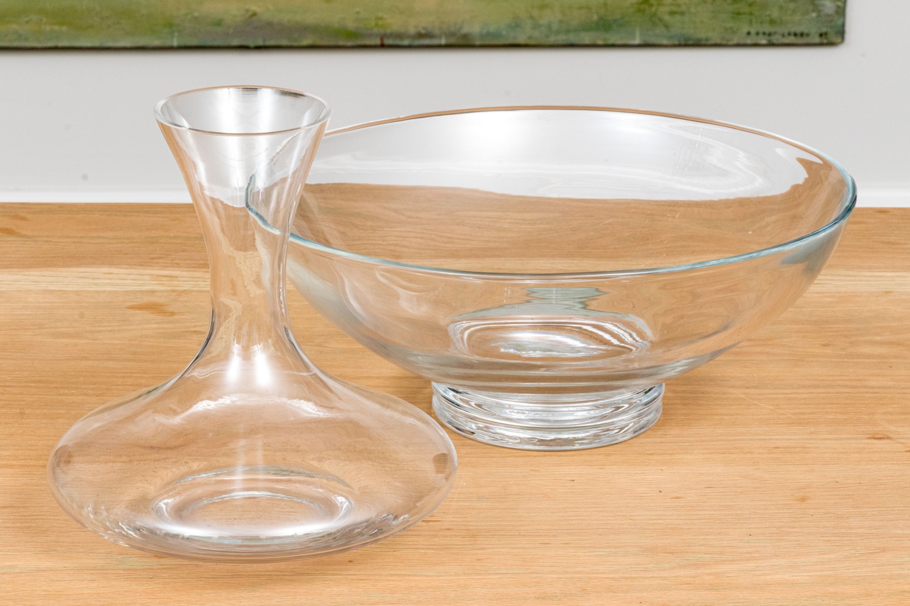 Includes the footed glass centerpiece bowl together with a lovely hand blown glass decanter.