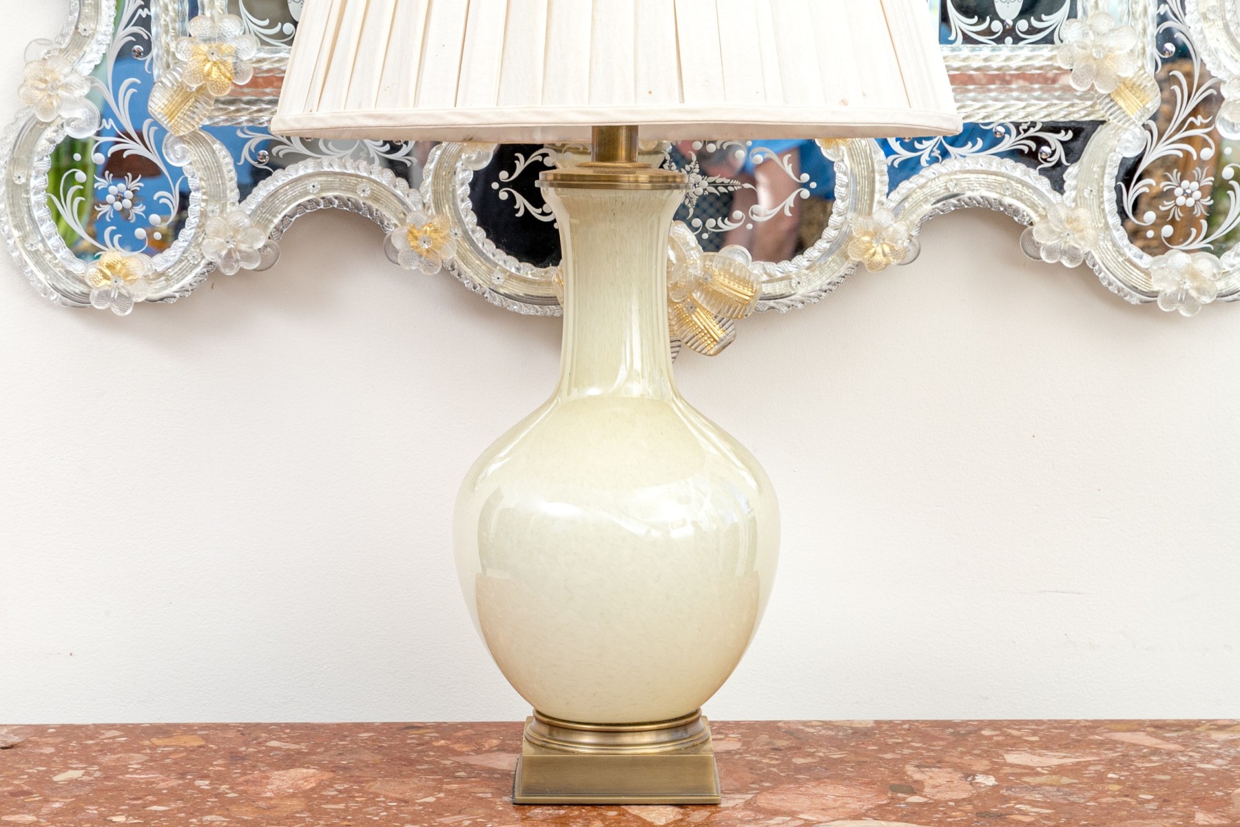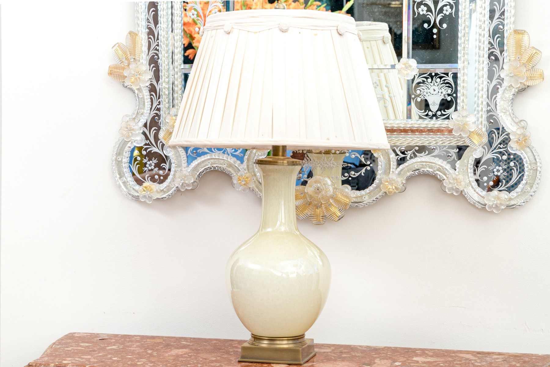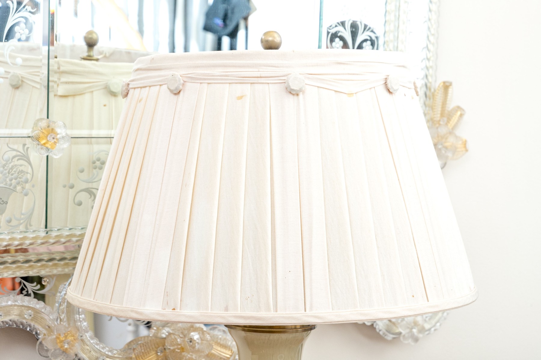 A gorgeous Decorative Crafts Inc. table lamp sporting a cream opaline glass vase form body raised on a brass pedestal style base, surmounted with a white pleated shade with a simple sphere finial. The shade is decorated with a lovely garland of pleated fabric and floral medallions, adding an elegant touch.