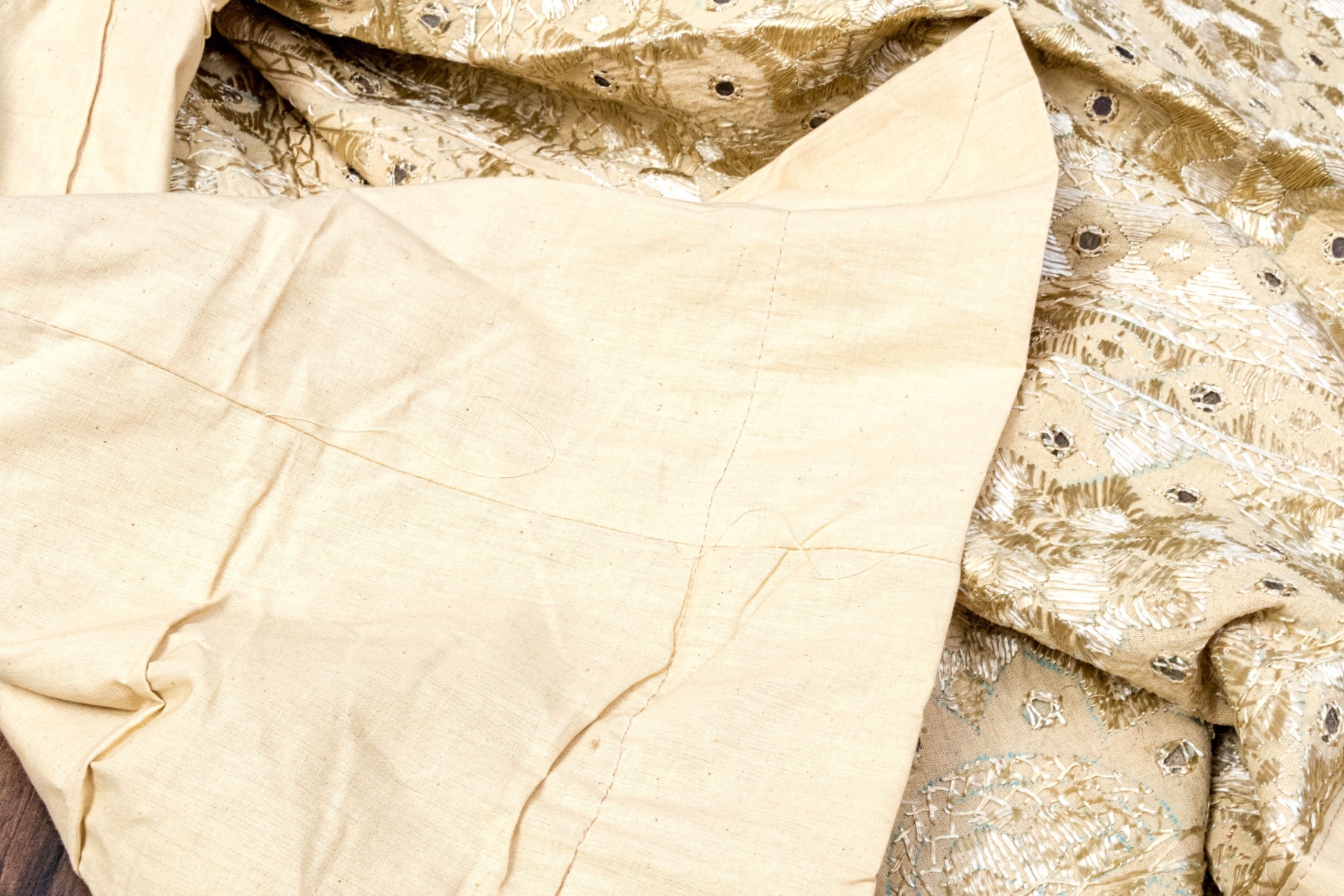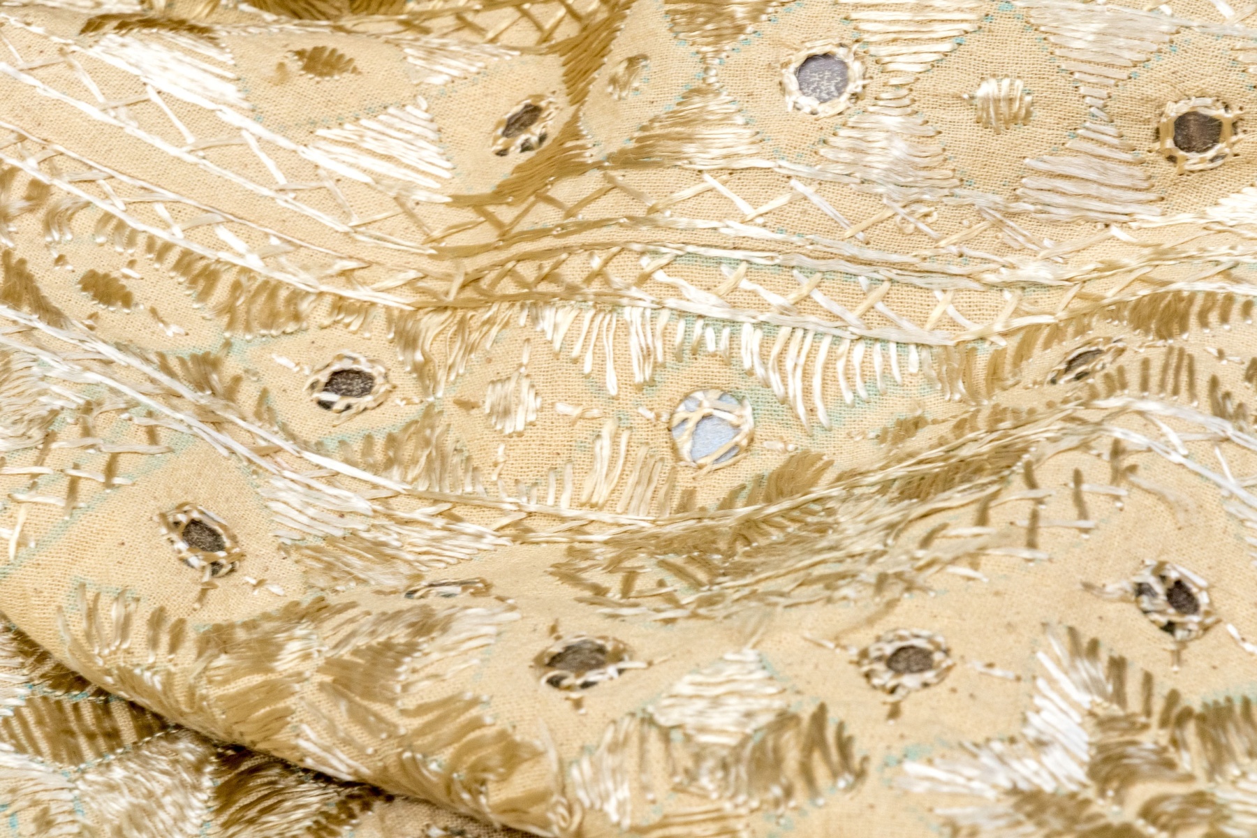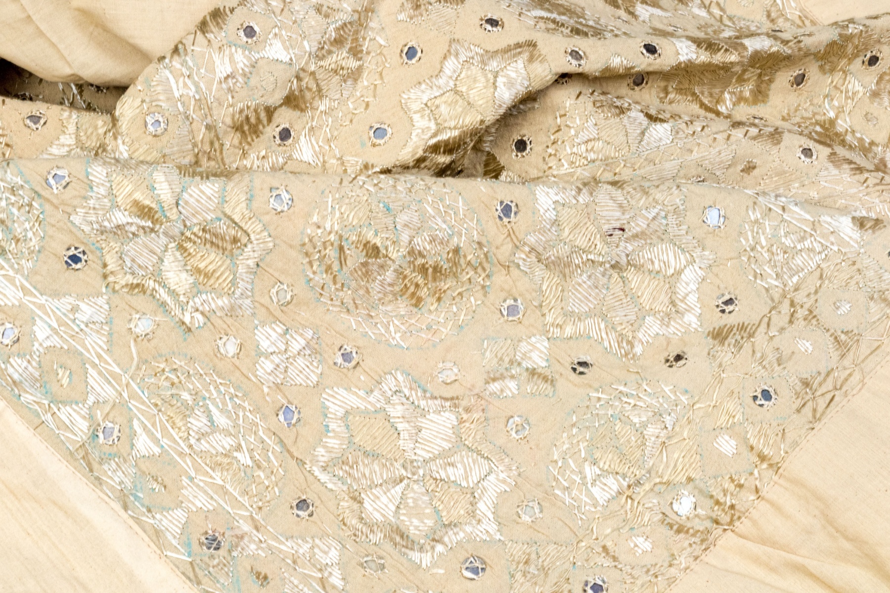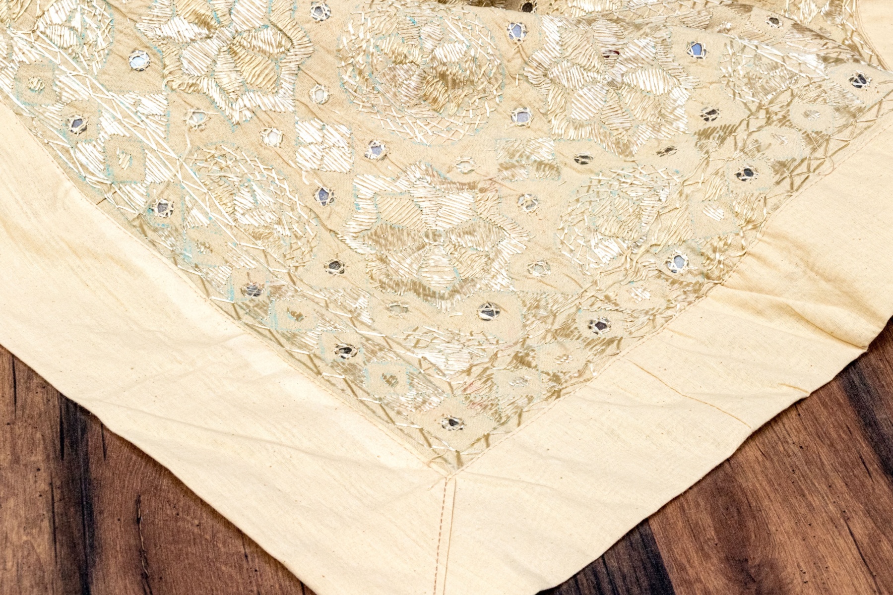 A beautiful tablecloth hand-embellished with circular medallions and shimmery threadwork creating eye-catching geometric borders.