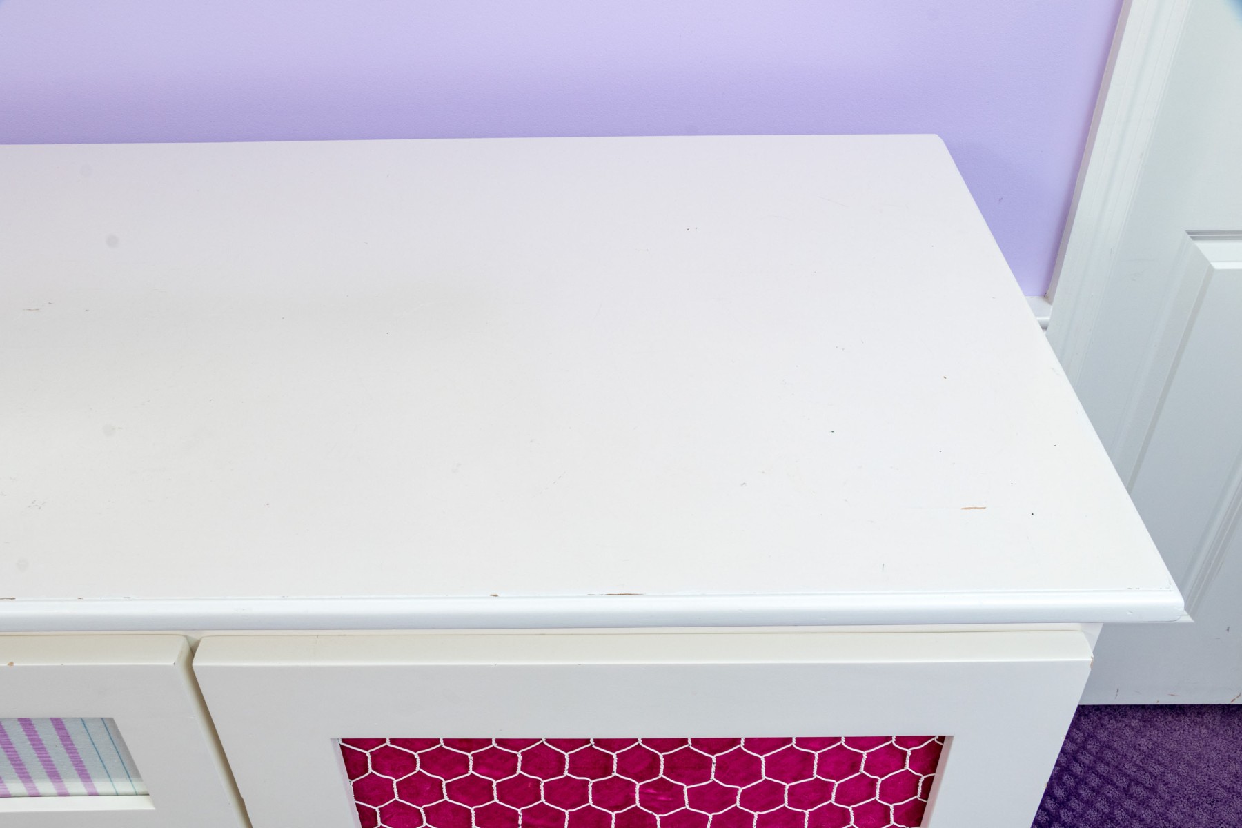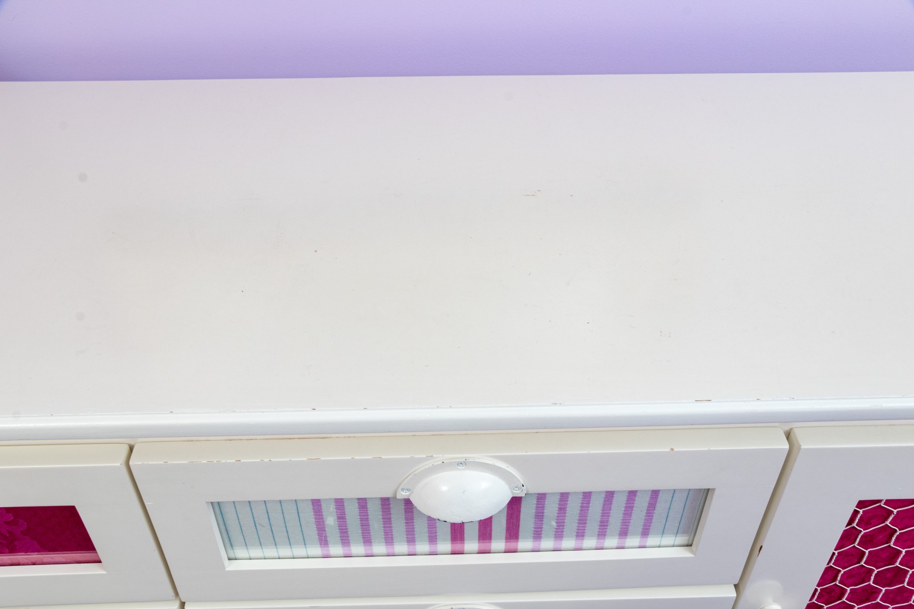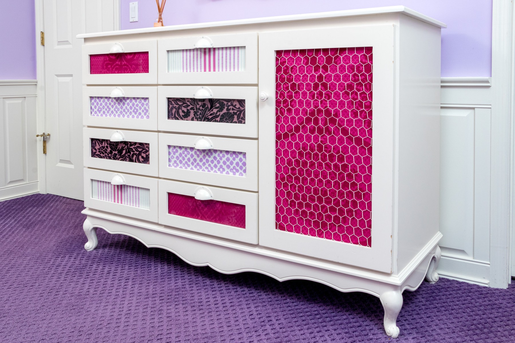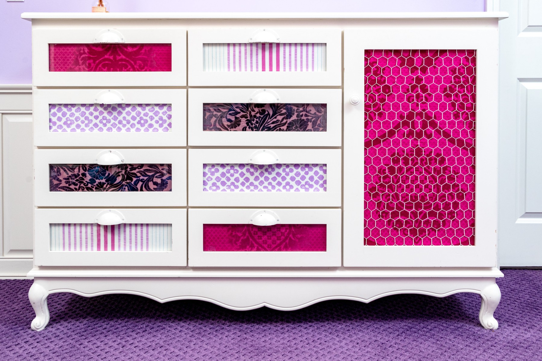 A fabulous farmhouse chic dresser chest in a white finish. Features two columns of four drawers to the left, and one cabinet door to the right. The drawers are inset with stylish patterned panels in pink and purple, complimenting a pink panel on the cabinet beneath chicken wire mesh. Finished with a serpentine apron raised on cabriole legs for an elegant flare.
