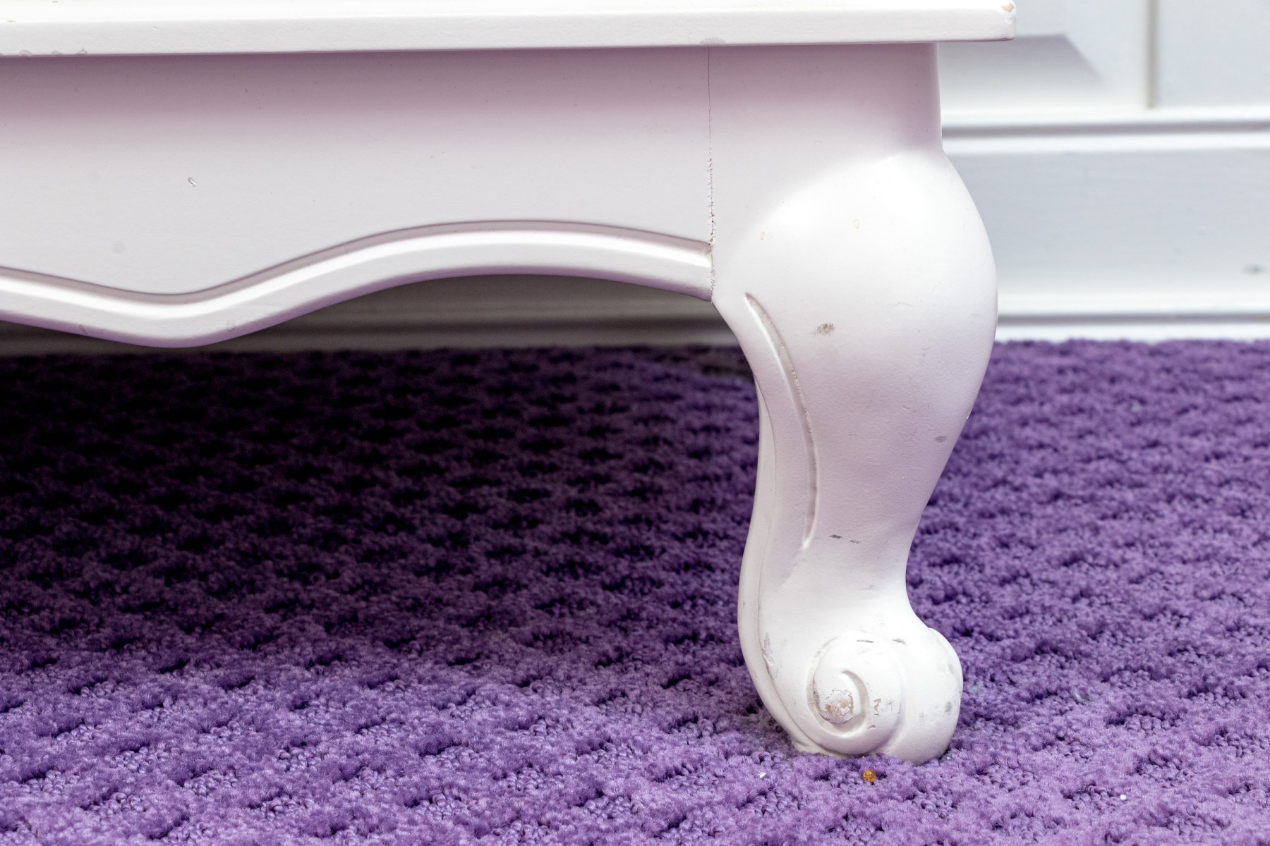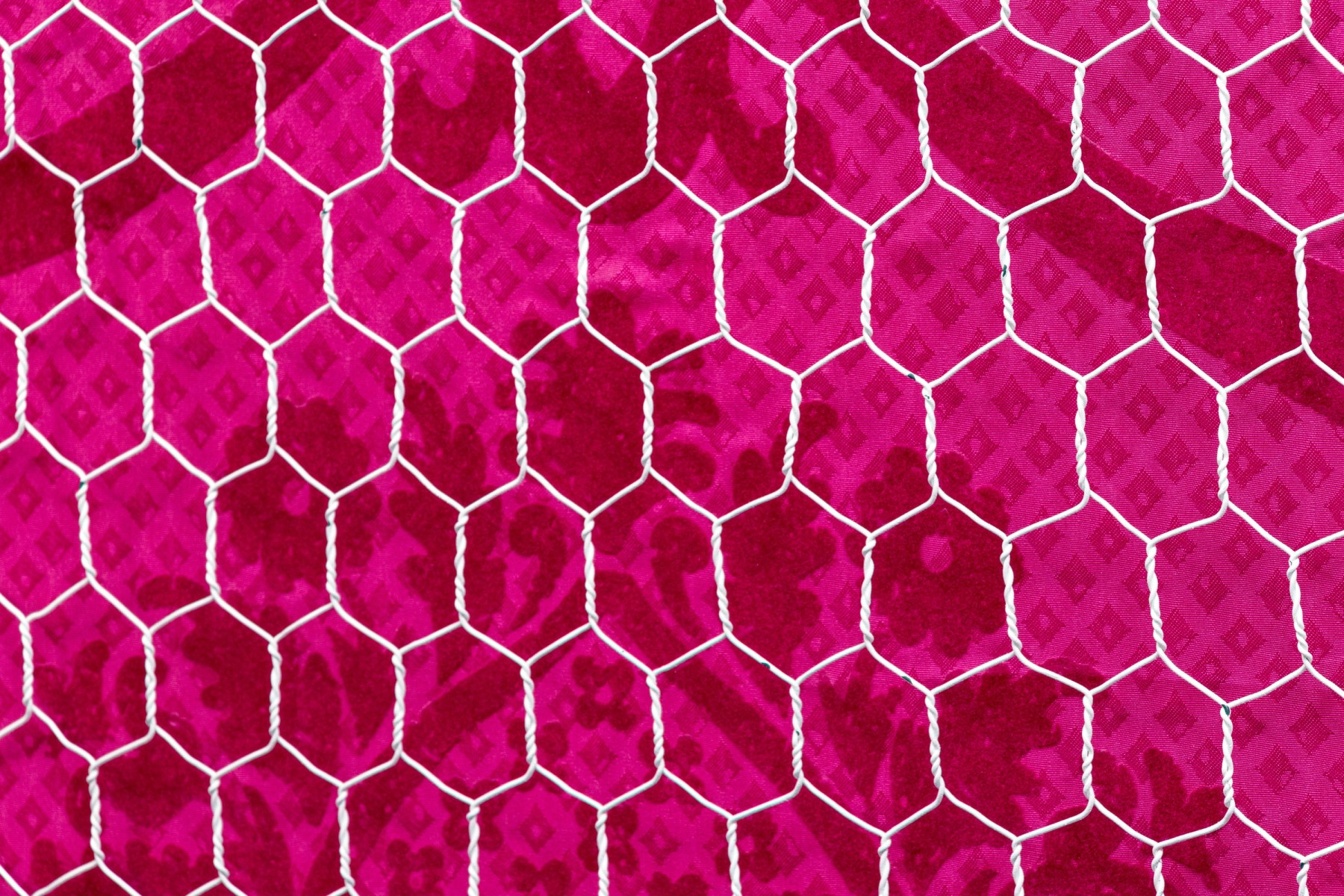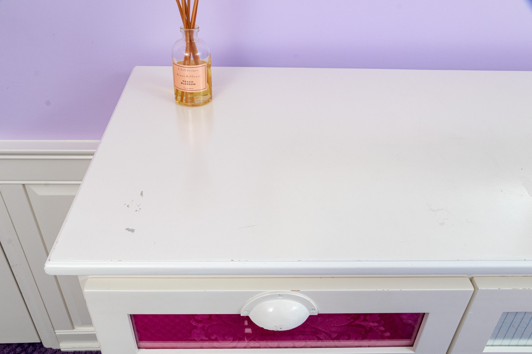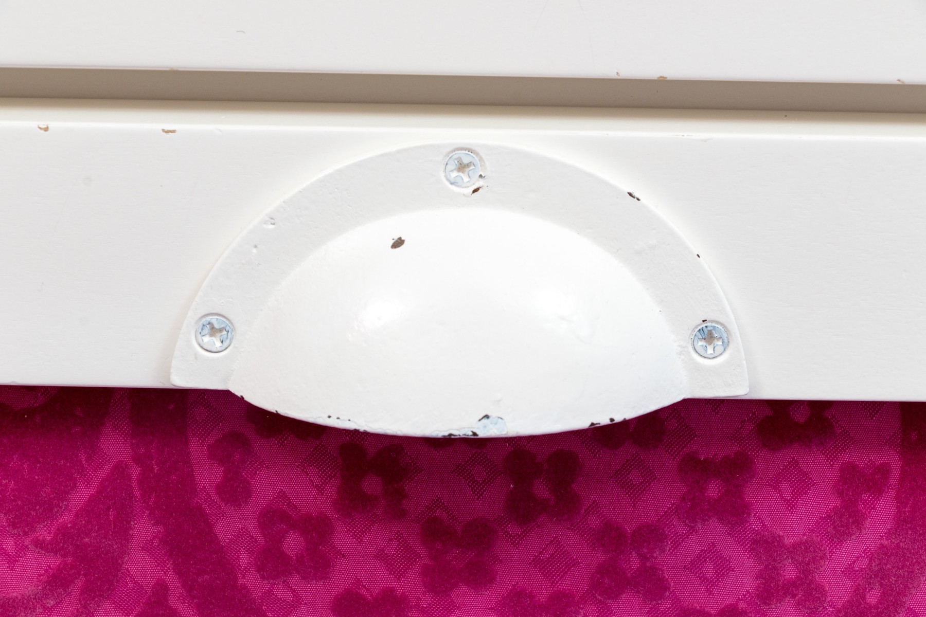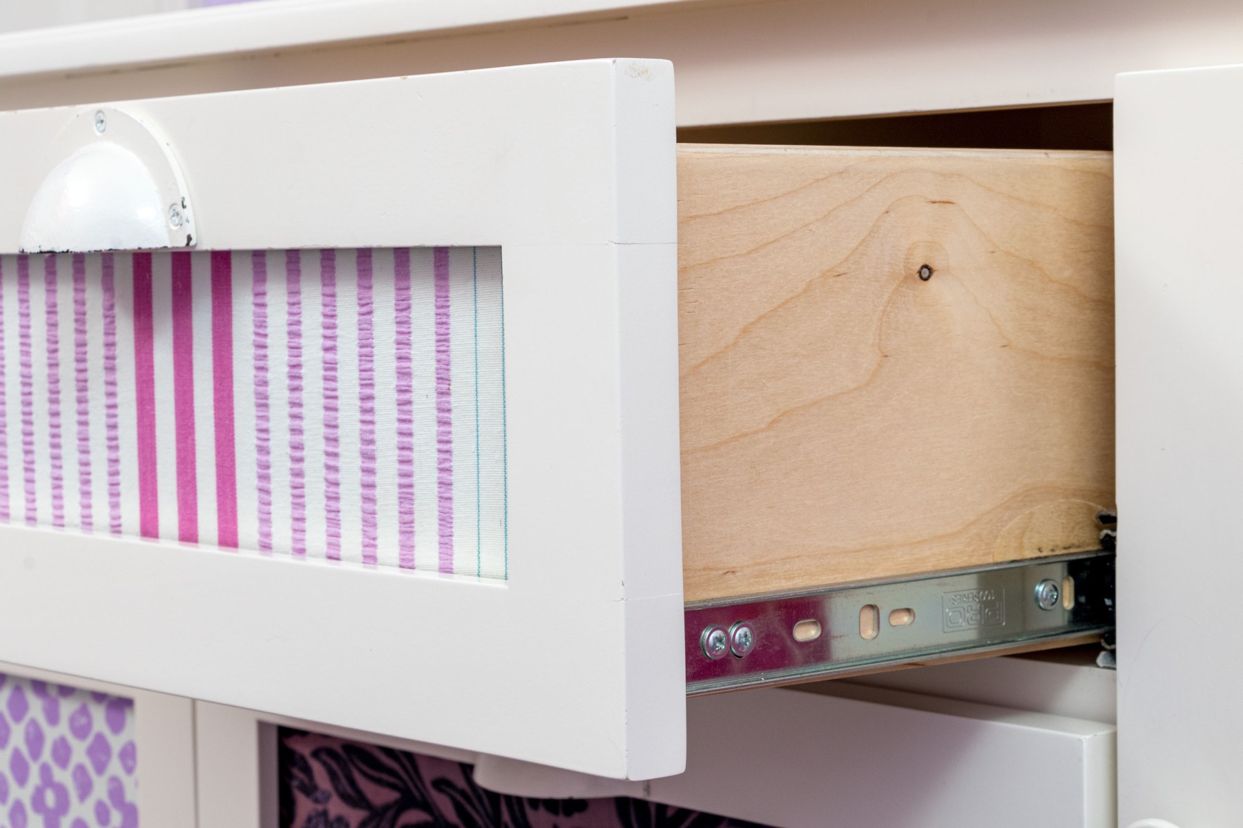 A fabulous farmhouse chic dresser chest in a white finish. Features two columns of four drawers to the left, and one cabinet door to the right. The drawers are inset with stylish patterned panels in pink and purple, complimenting a pink panel on the cabinet beneath chicken wire mesh. Finished with a serpentine apron raised on cabriole legs for an elegant flare.