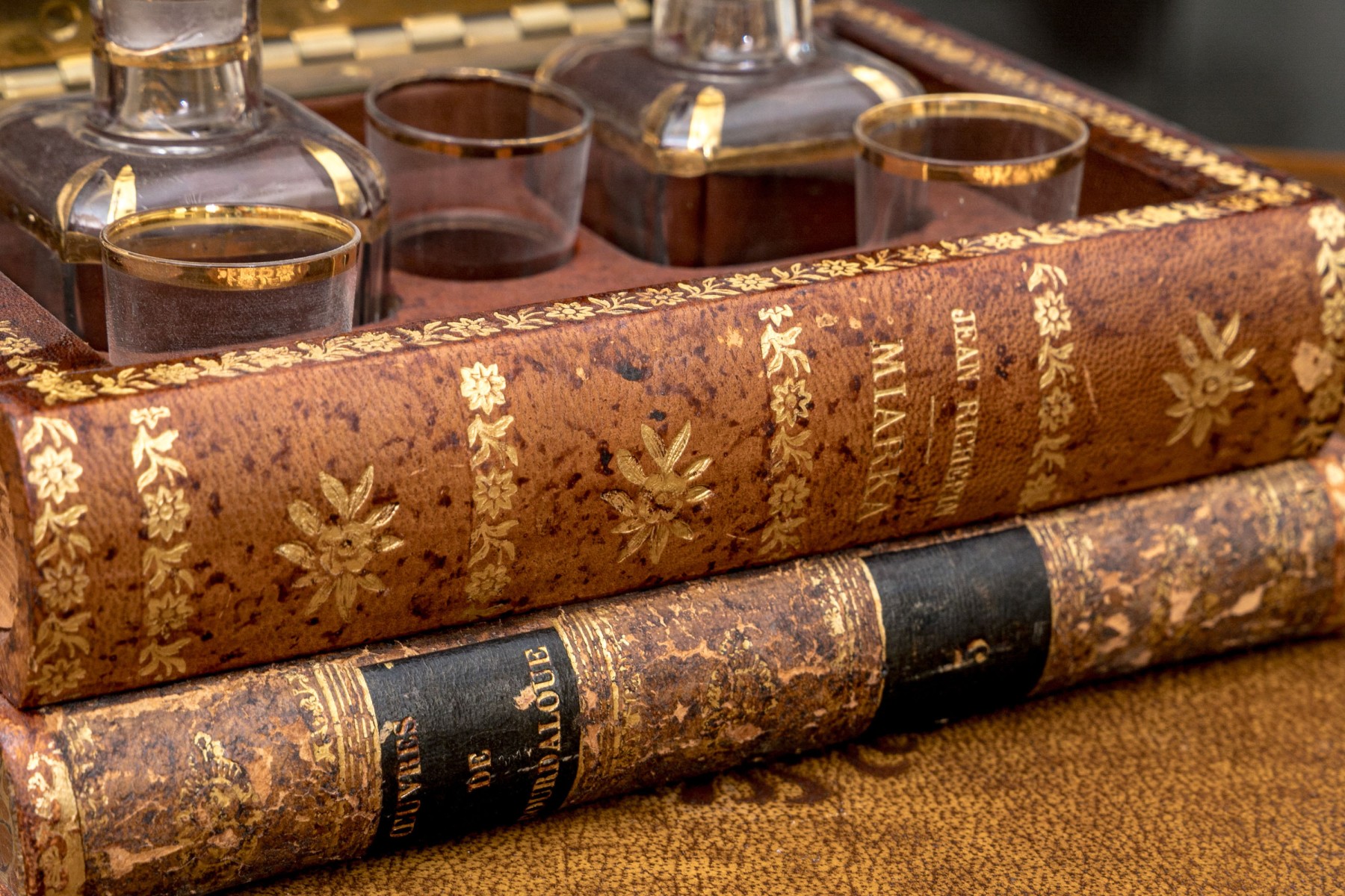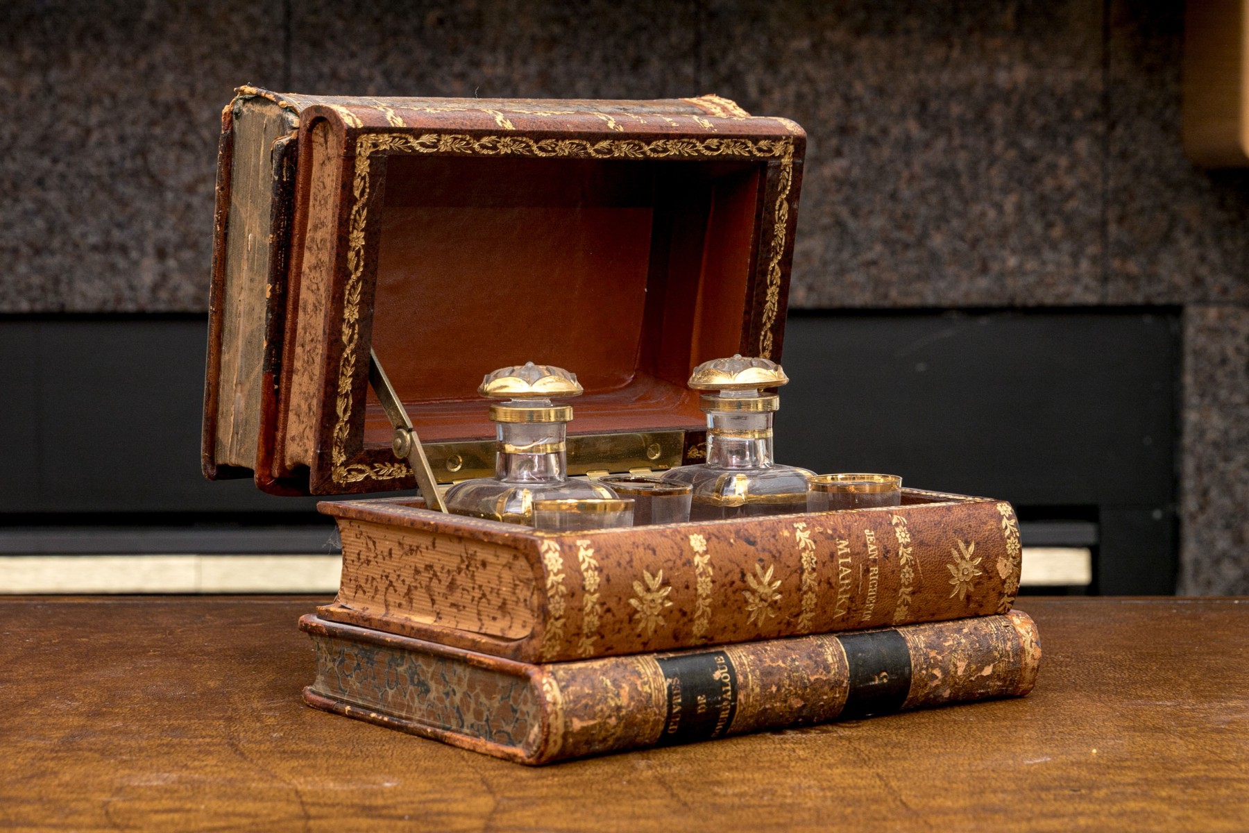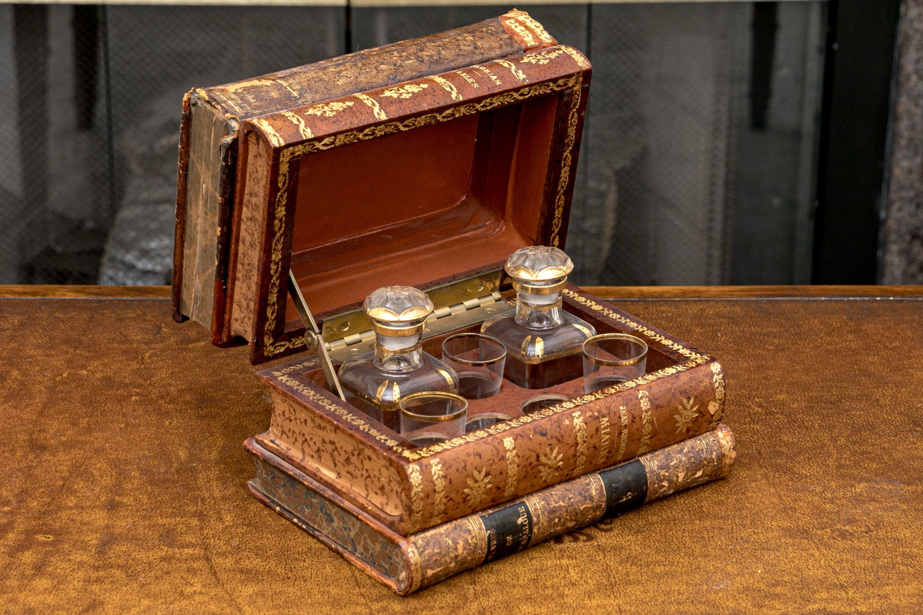A fabulous and nicely aged French tantalus in the form of faux stacked books with gilt embellishments along the spines. Opens with a hinged lid to an interior with fitted slots for decanters and glasses. Includes two decanters with stoppers, and three shot glasses.