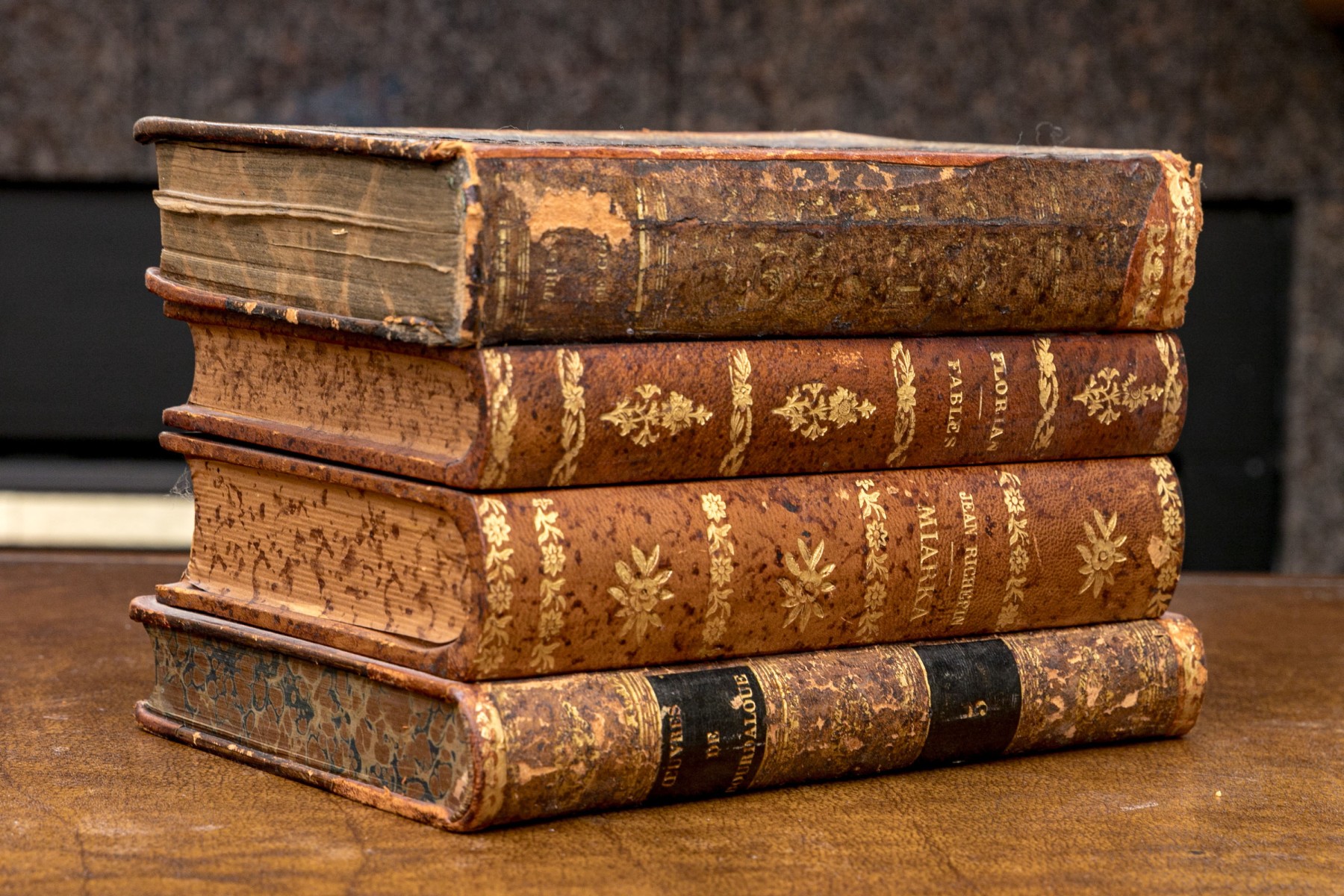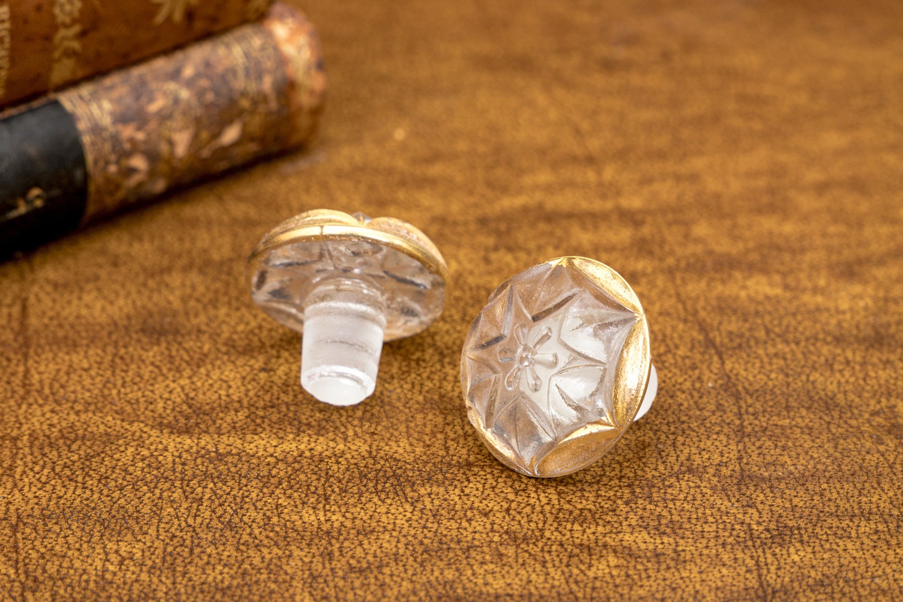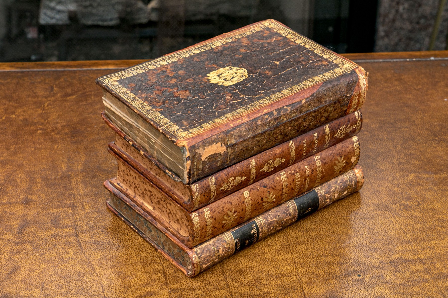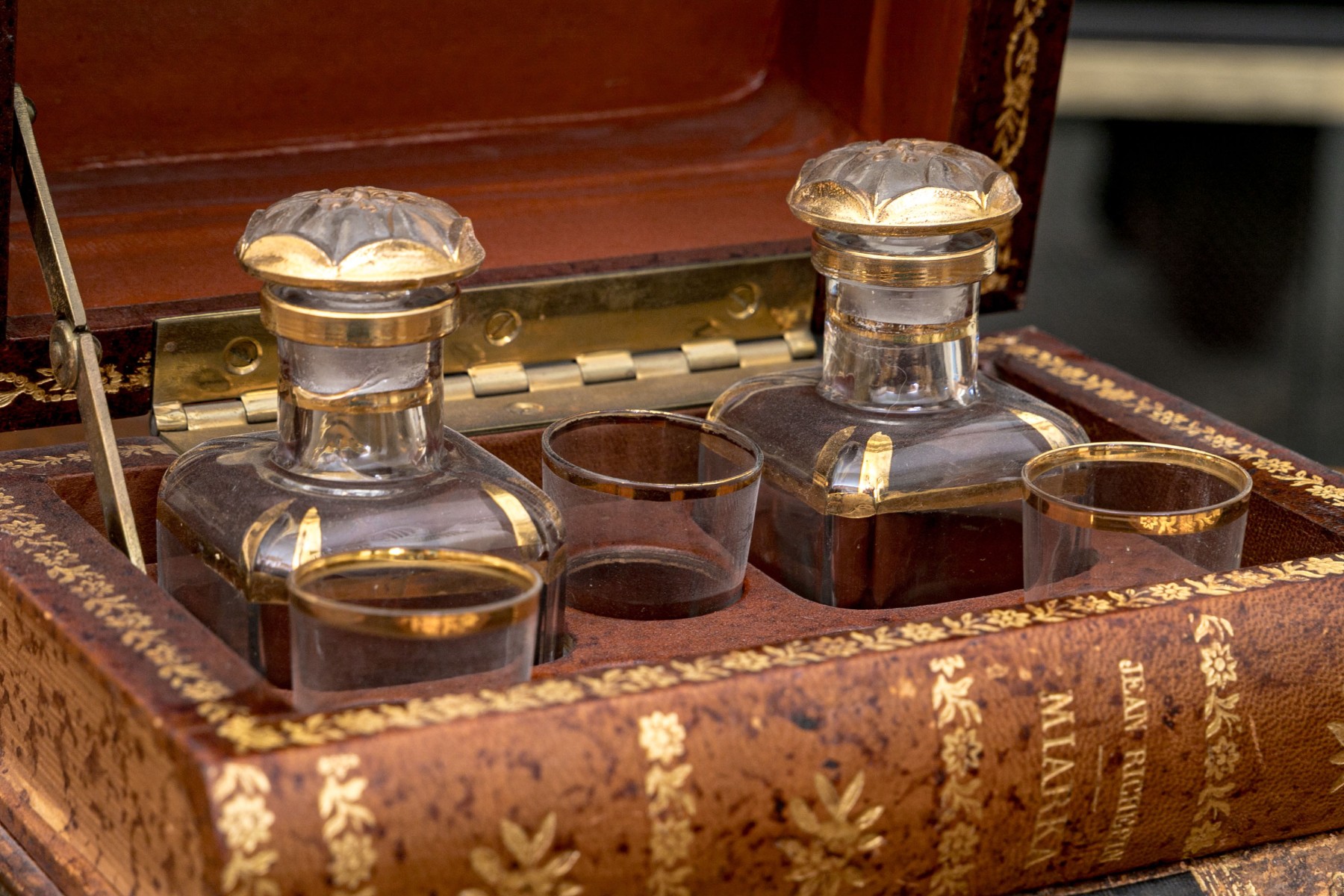 A fabulous and nicely aged French tantalus in the form of faux stacked books with gilt embellishments along the spines. Opens with a hinged lid to an interior with fitted slots for decanters and glasses. Includes two decanters with stoppers, and three shot glasses.