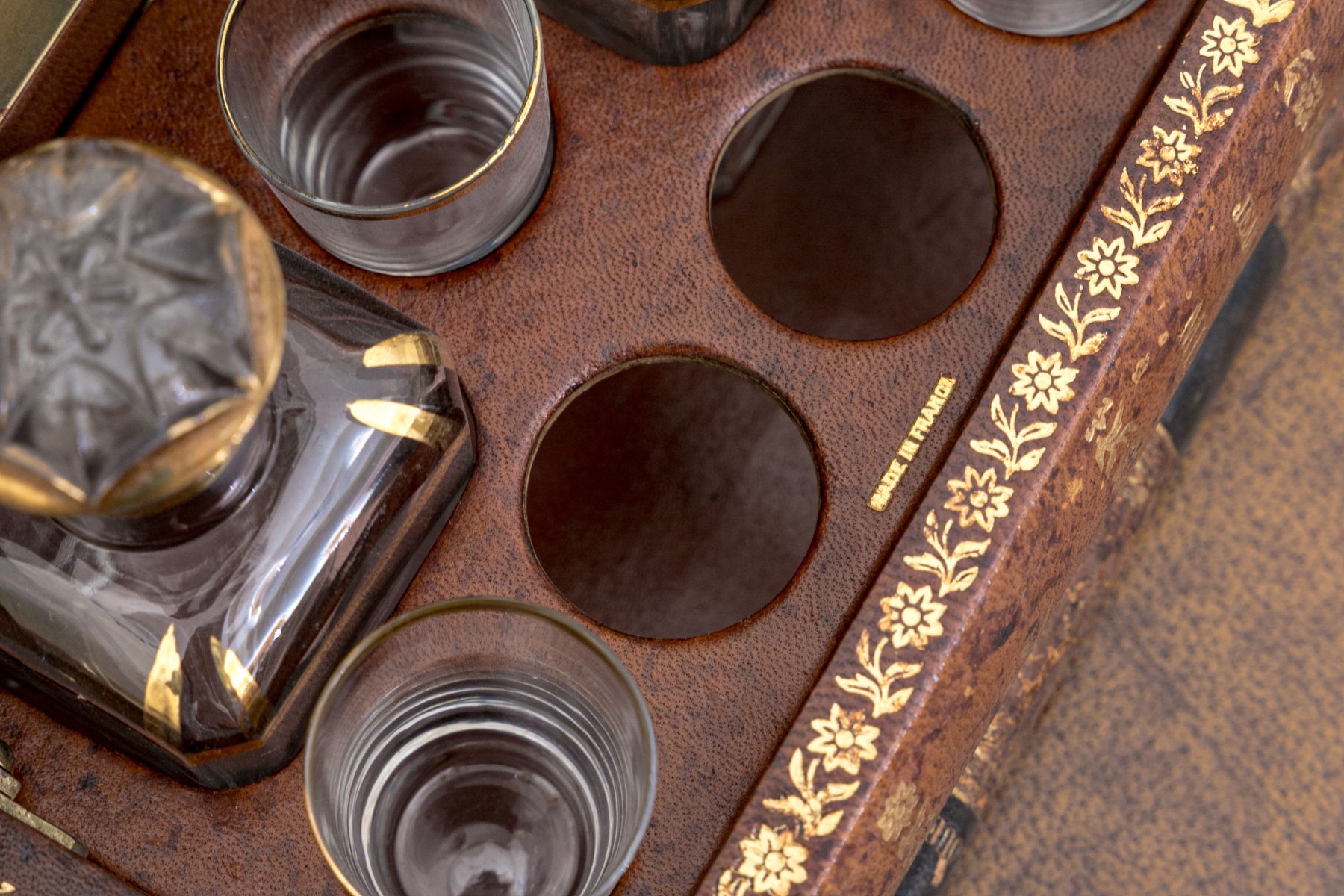 Two shot glasses missing in the spots.