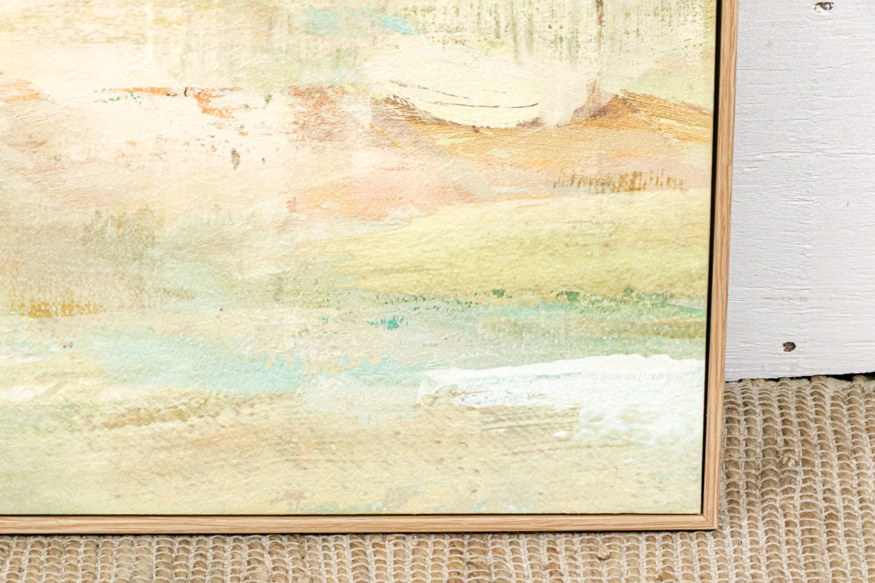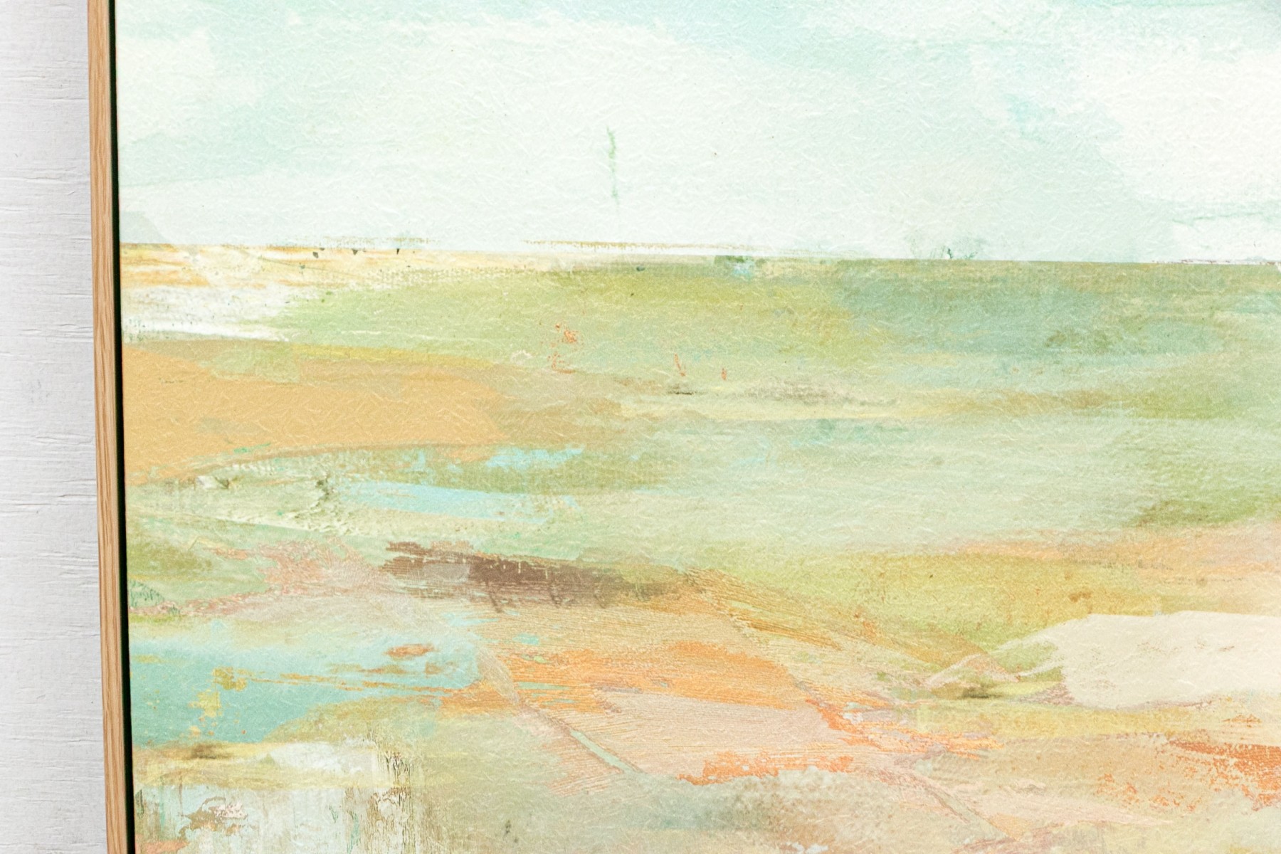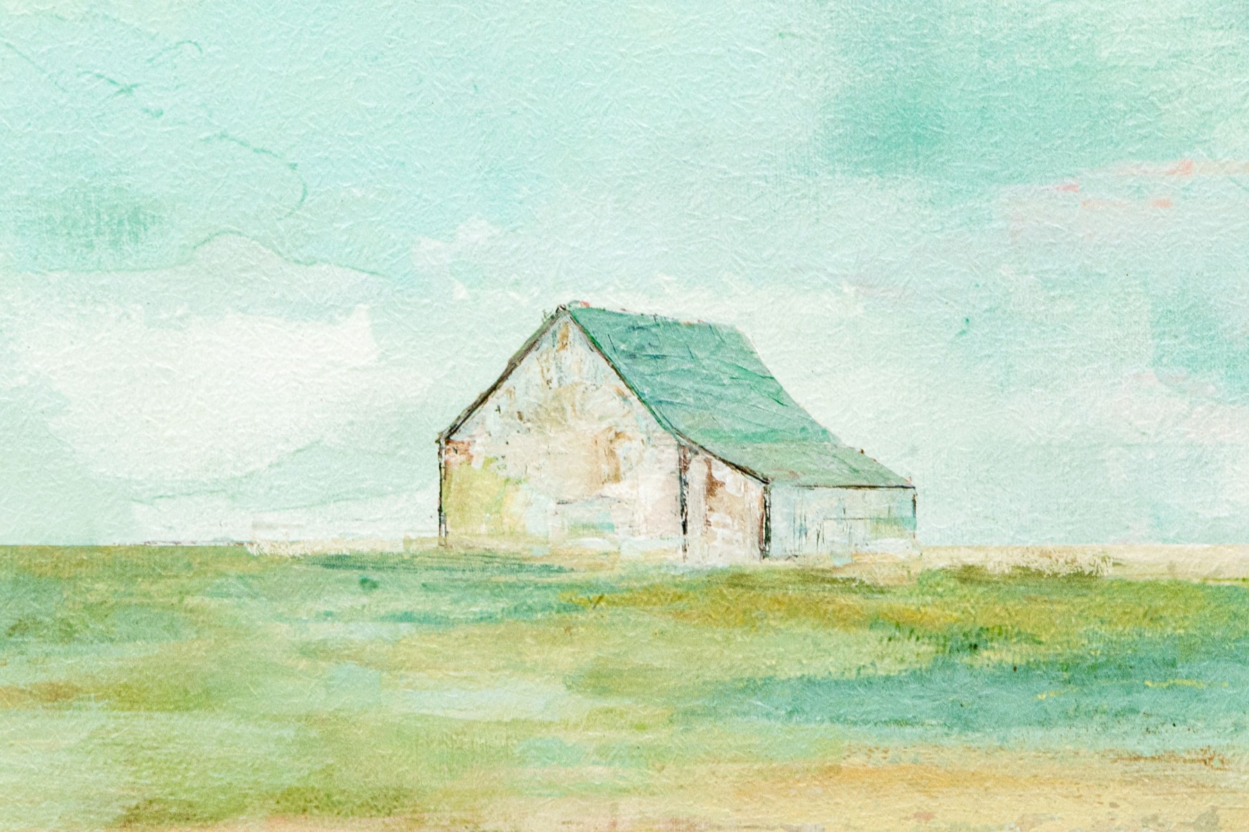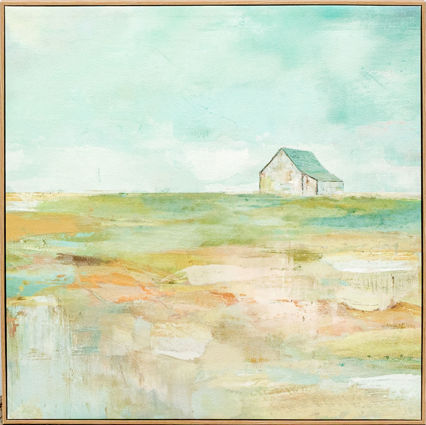 A handsome landscape with giclee print depicting a single cottage in the landscape with blue sky above and the land below. A wonderful textural effect of the work lends depth and an artisanal quality.