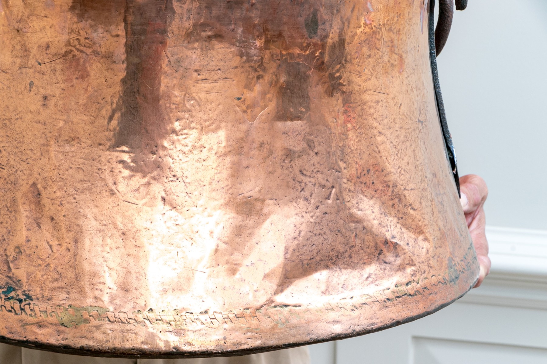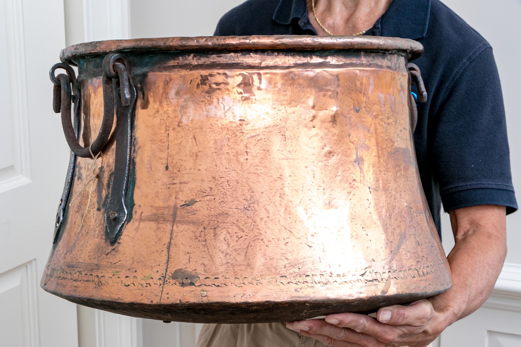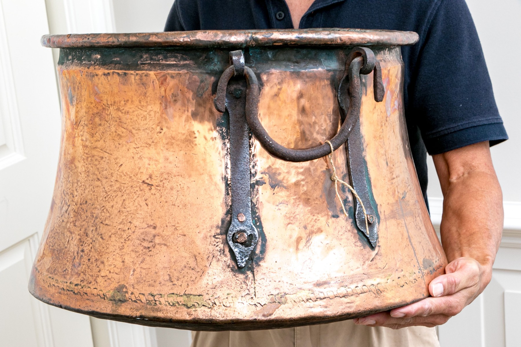 A fabulous and large copper cauldron with a rustic form sporting a rolled rim over a gently tapering cylindrical body with a hammered texture and a subtle concave curve along the sides, flanked by iron handles.