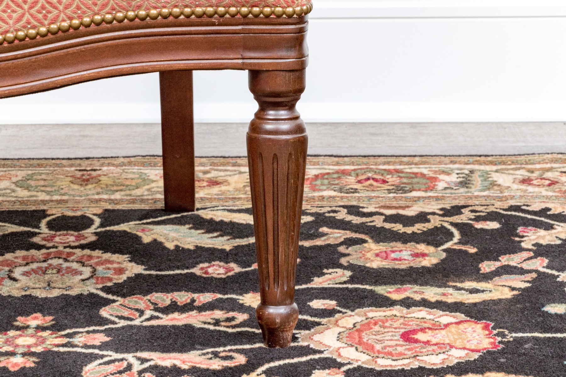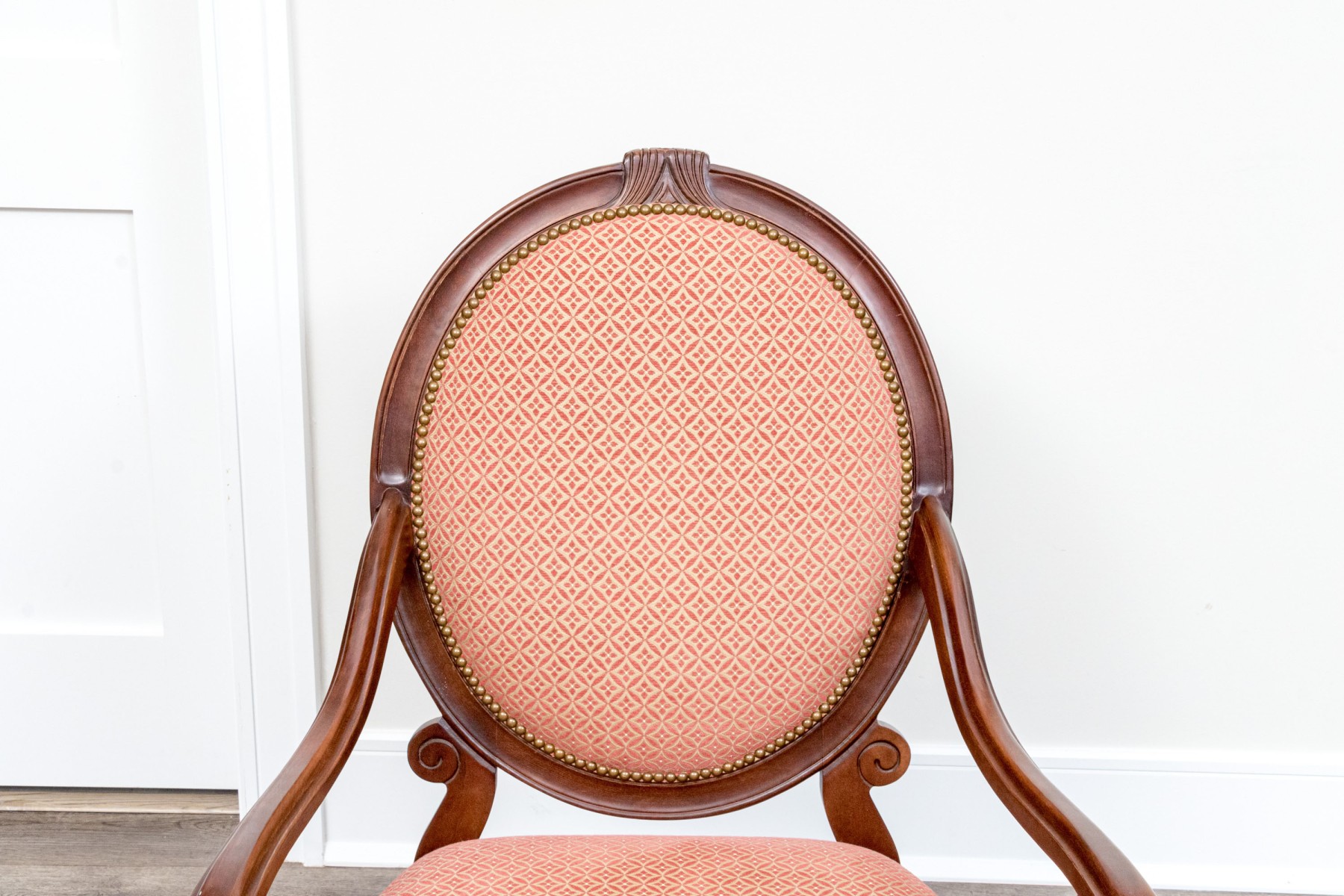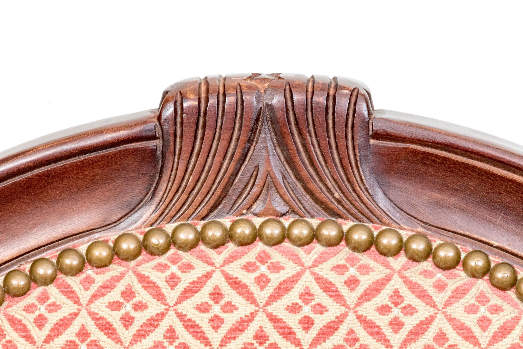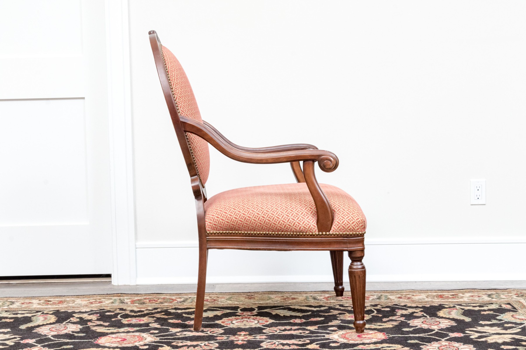 Raised on tapered and fluted legs with scalloped base rail. The oversized armchair has a handsomely upholstered seat cushion, with upholstered seat back cushion with trim of brass tack nailhead trim. Carved accents to the to of the oval back. Wonderful scrolled arms finish the beautiful chair.