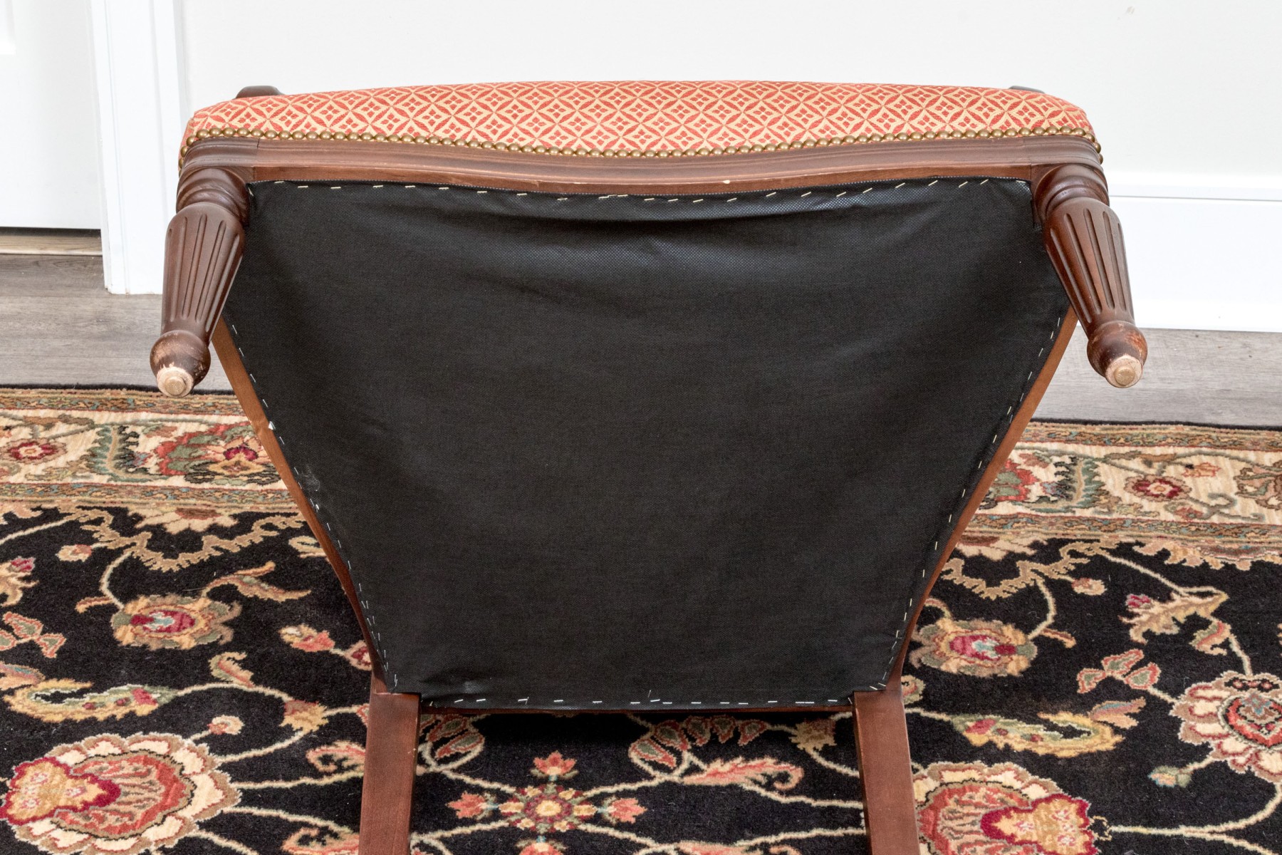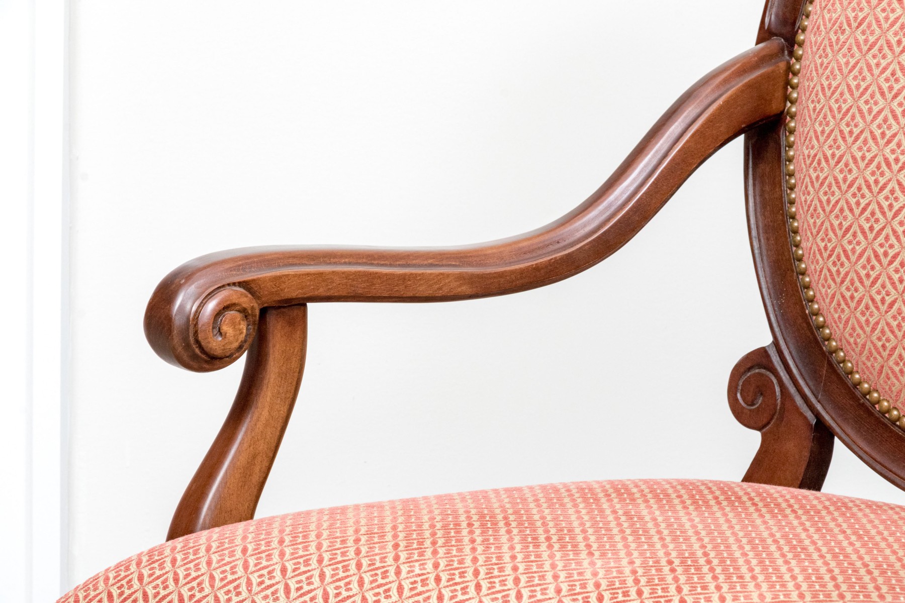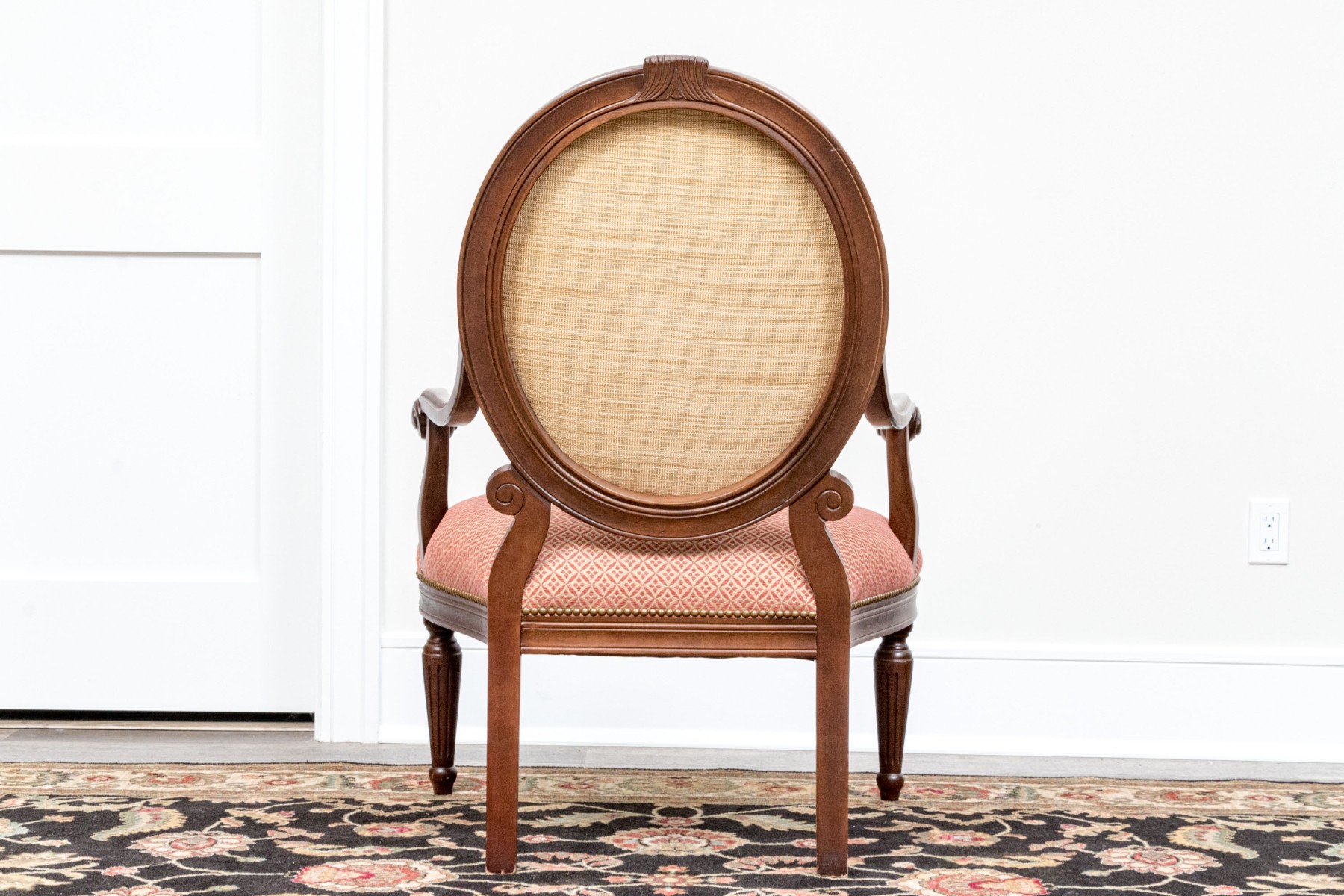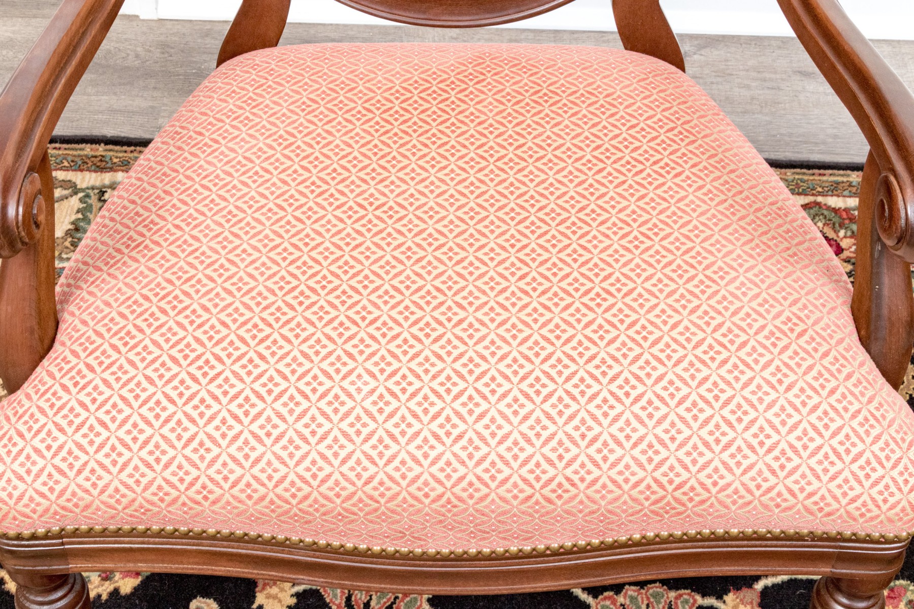 Raised on tapered and fluted legs with scalloped base rail. The oversized armchair has a handsomely upholstered seat cushion, with upholstered seat back cushion with trim of brass tack nailhead trim. Carved accents to the to of the oval back. Wonderful scrolled arms finish the beautiful chair.