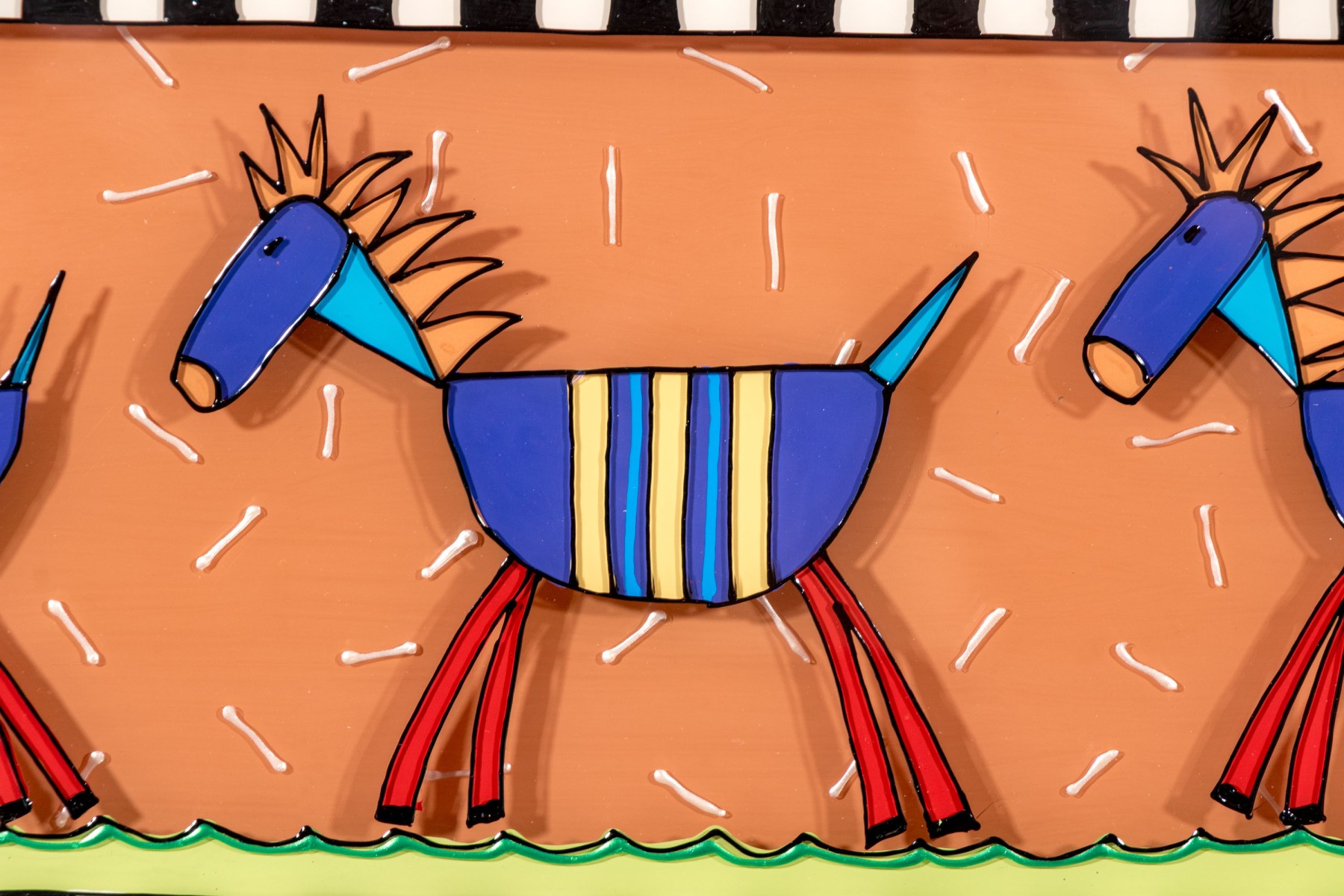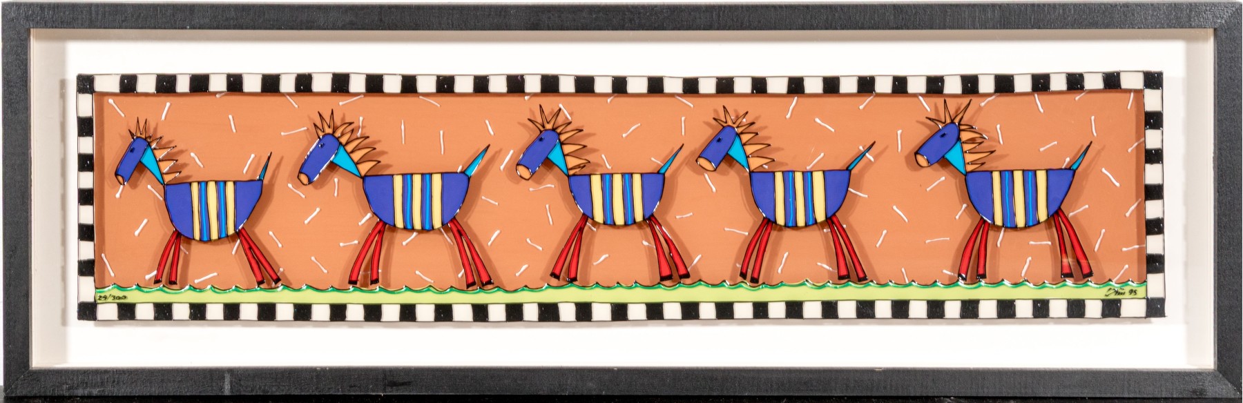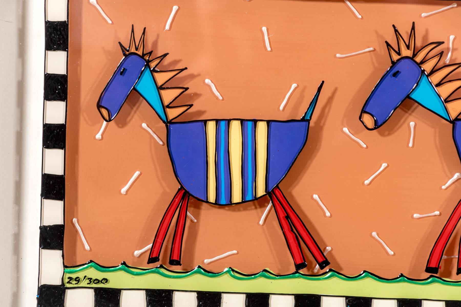 Signed and dated '95 lower right and numbered '29/300' lower left. The horses are wonderfully vibrant with striped bodies and red legs on green grass with a black and white checkered trim. Presented in a black frame and glazed. Dimensions: 9 1/2 x 33 1/2" W, sight // 11 1/8 x 35 1/8" W x 2" D, frame