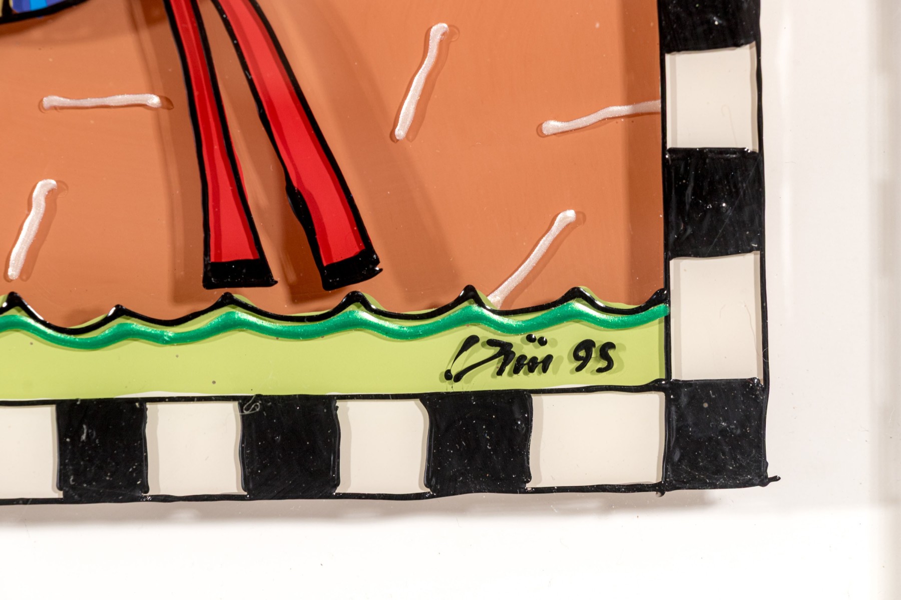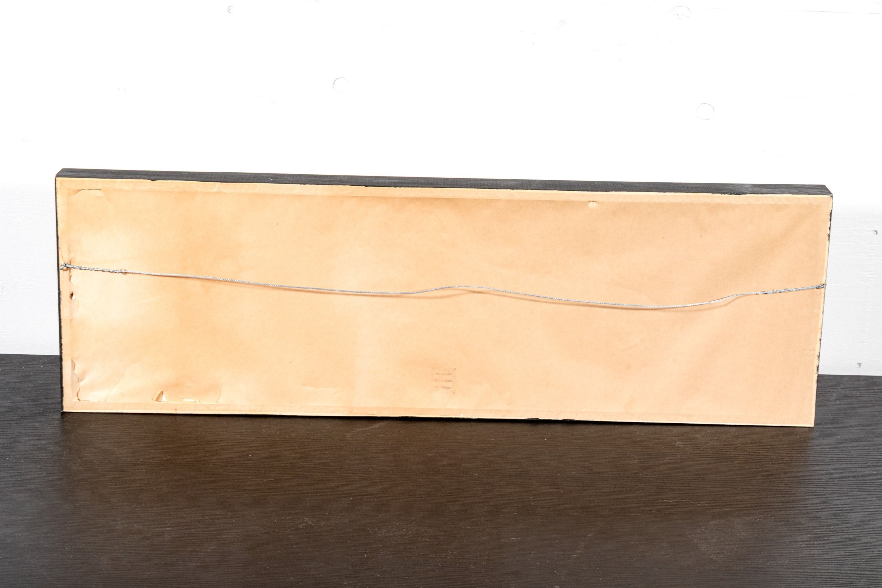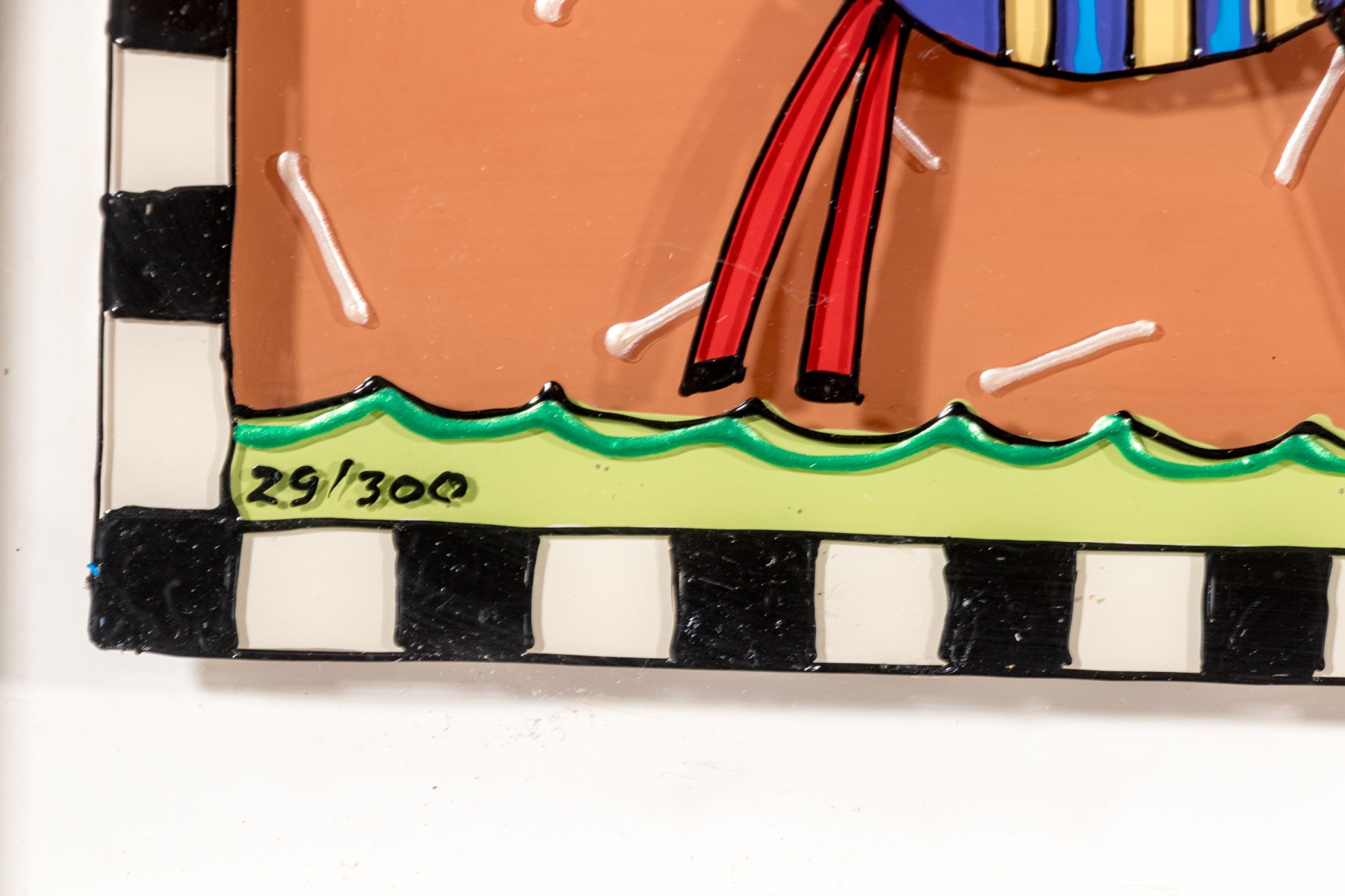 Signed and dated '95 lower right and numbered '29/300' lower left. The horses are wonderfully vibrant with striped bodies and red legs on green grass with a black and white checkered trim. Presented in a black frame and glazed. Dimensions: 9 1/2 x 33 1/2" W, sight // 11 1/8 x 35 1/8" W x 2" D, frame