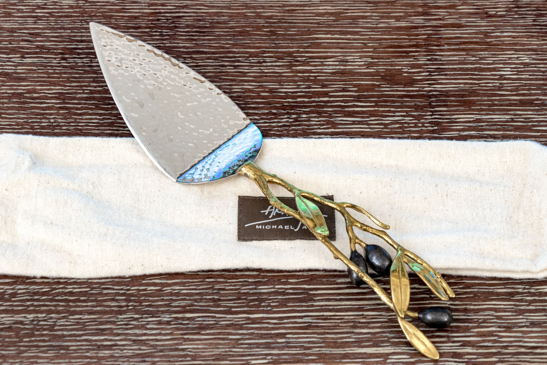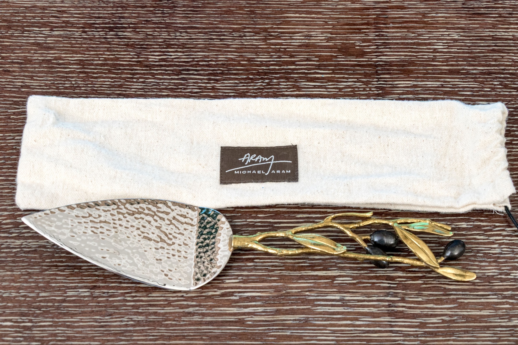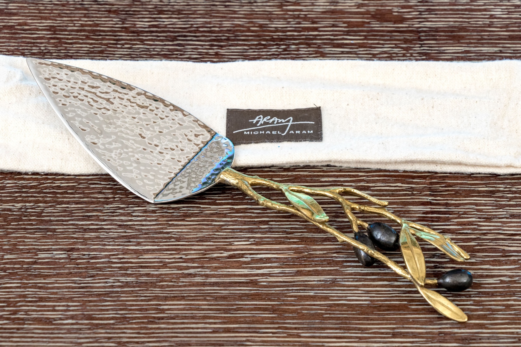 A fabulous Michael Aram hand-crafted cake or pie slice server. The handle is magnificent in the form of olives on olive branches with gilt and black finish with stainless finish to spade server. With dustbag.