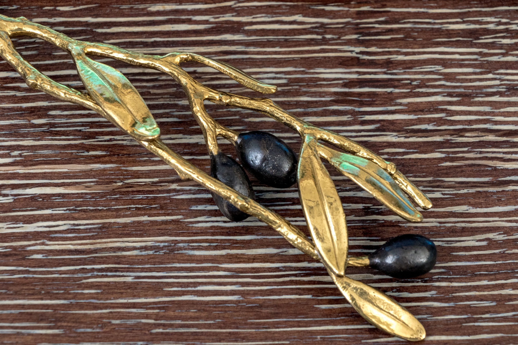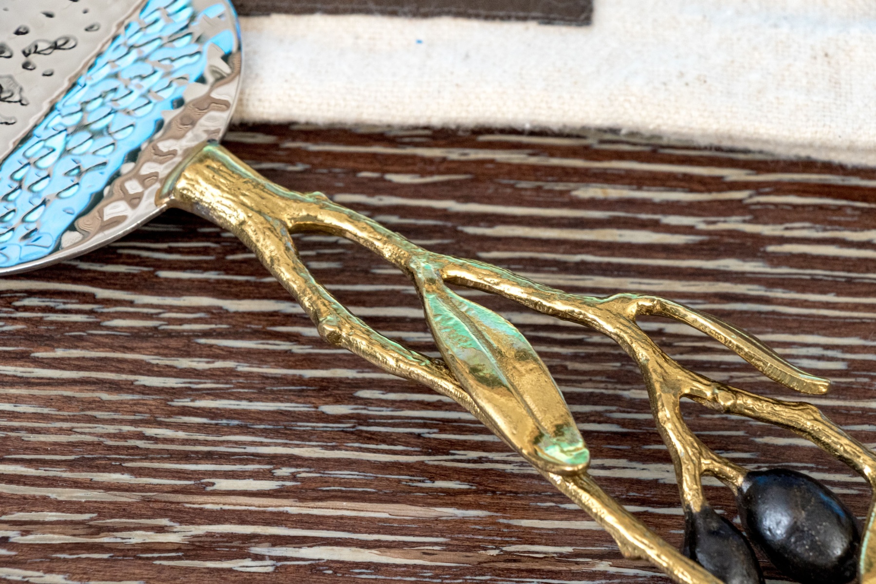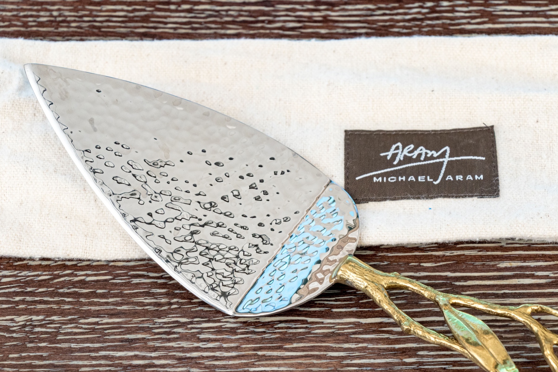 A fabulous Michael Aram hand-crafted cake or pie slice server. The handle is magnificent in the form of olives on olive branches with gilt and black finish with stainless finish to spade server. With dustbag.