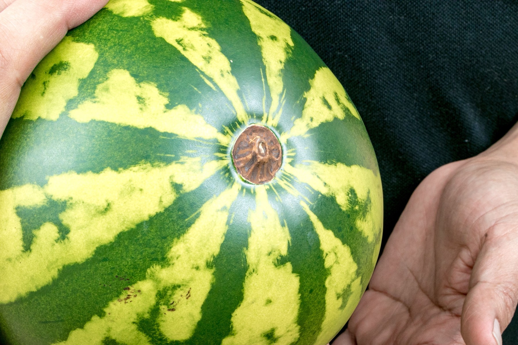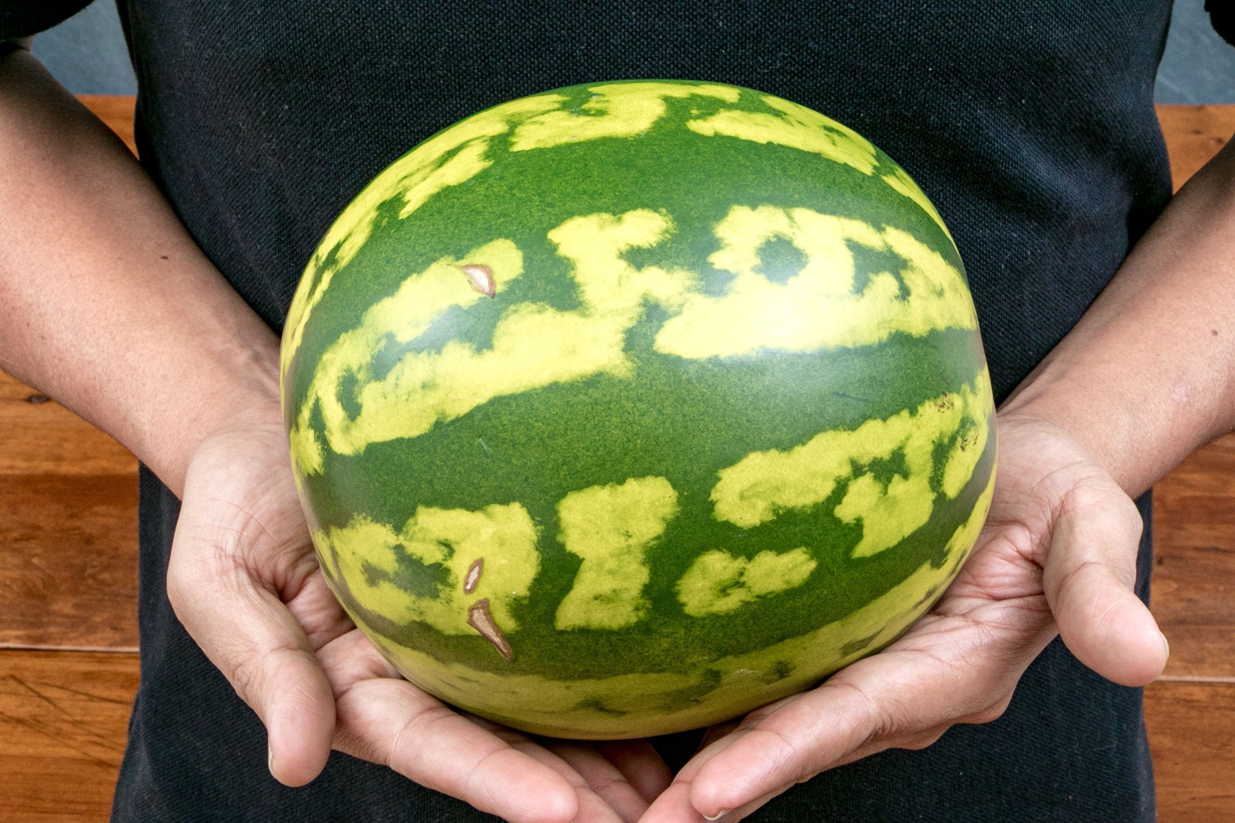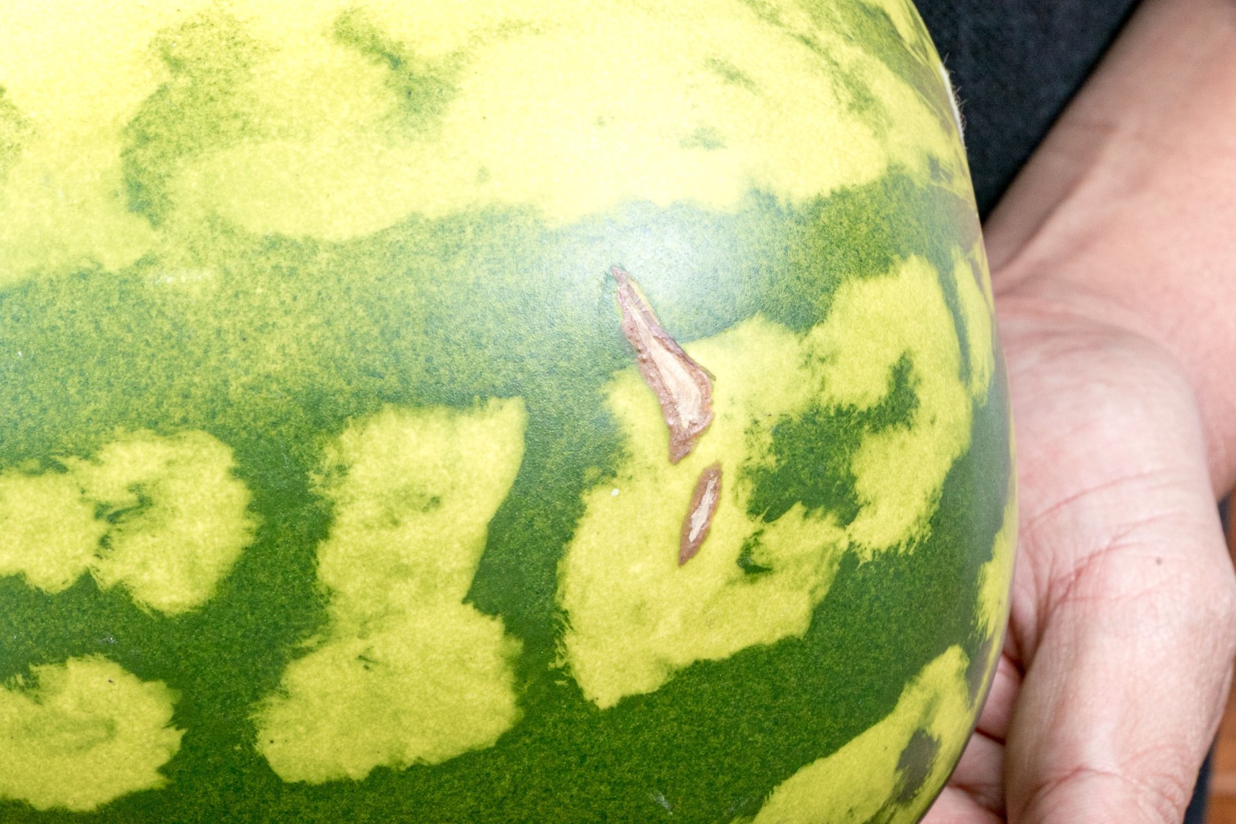 A fantastic ceramic figurine of a watermelon with delightful trompe l'oeil appeal, hand-painted in meticulous detail for a convincing, naturalistic appearance.