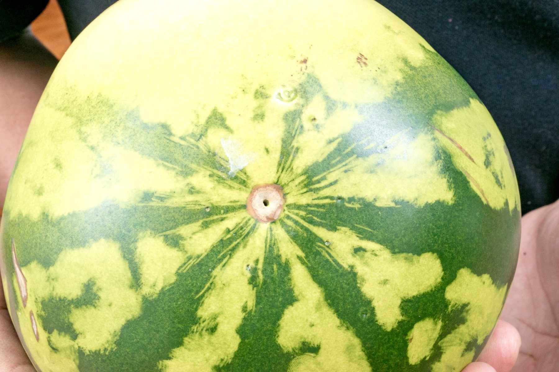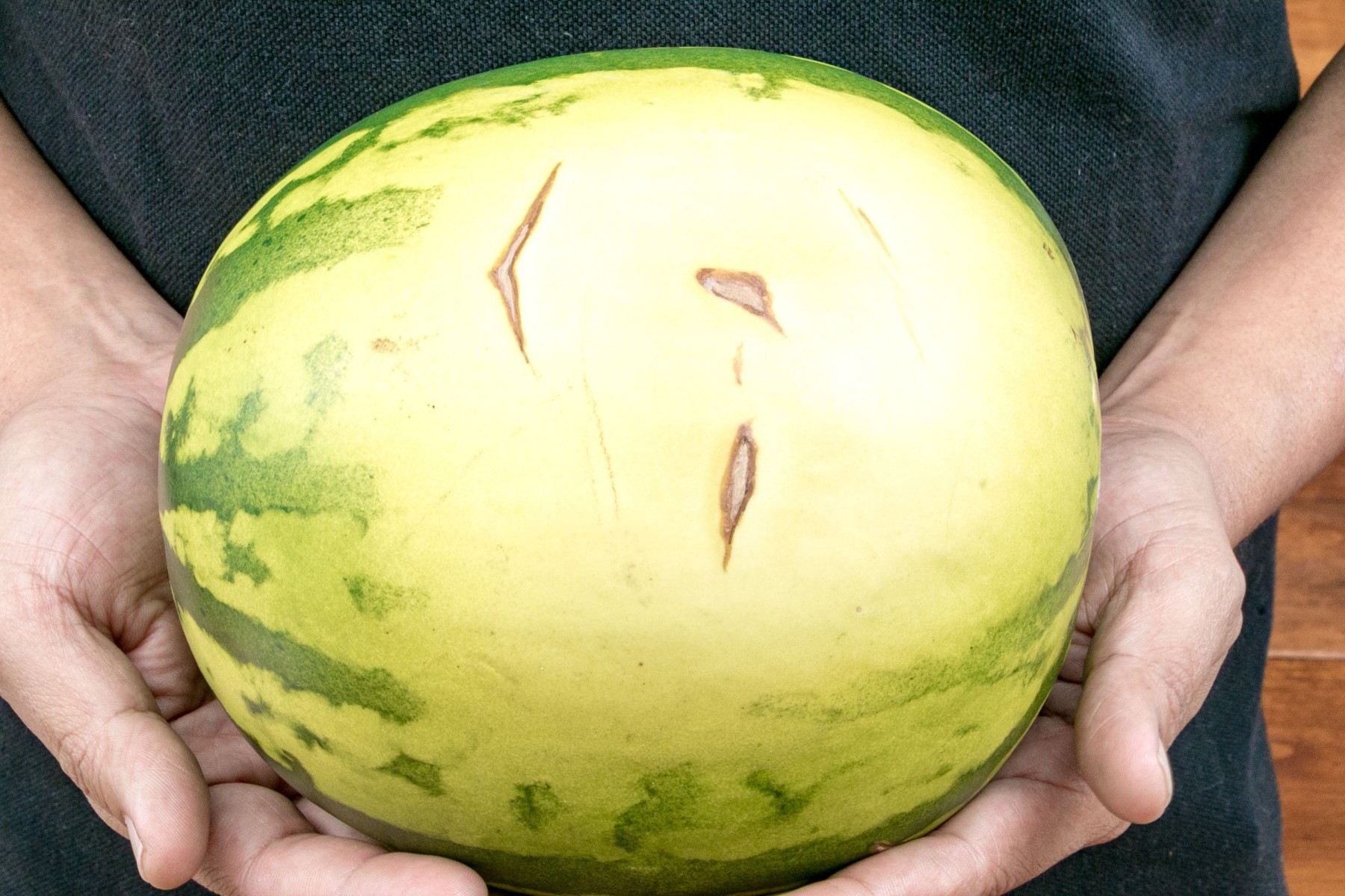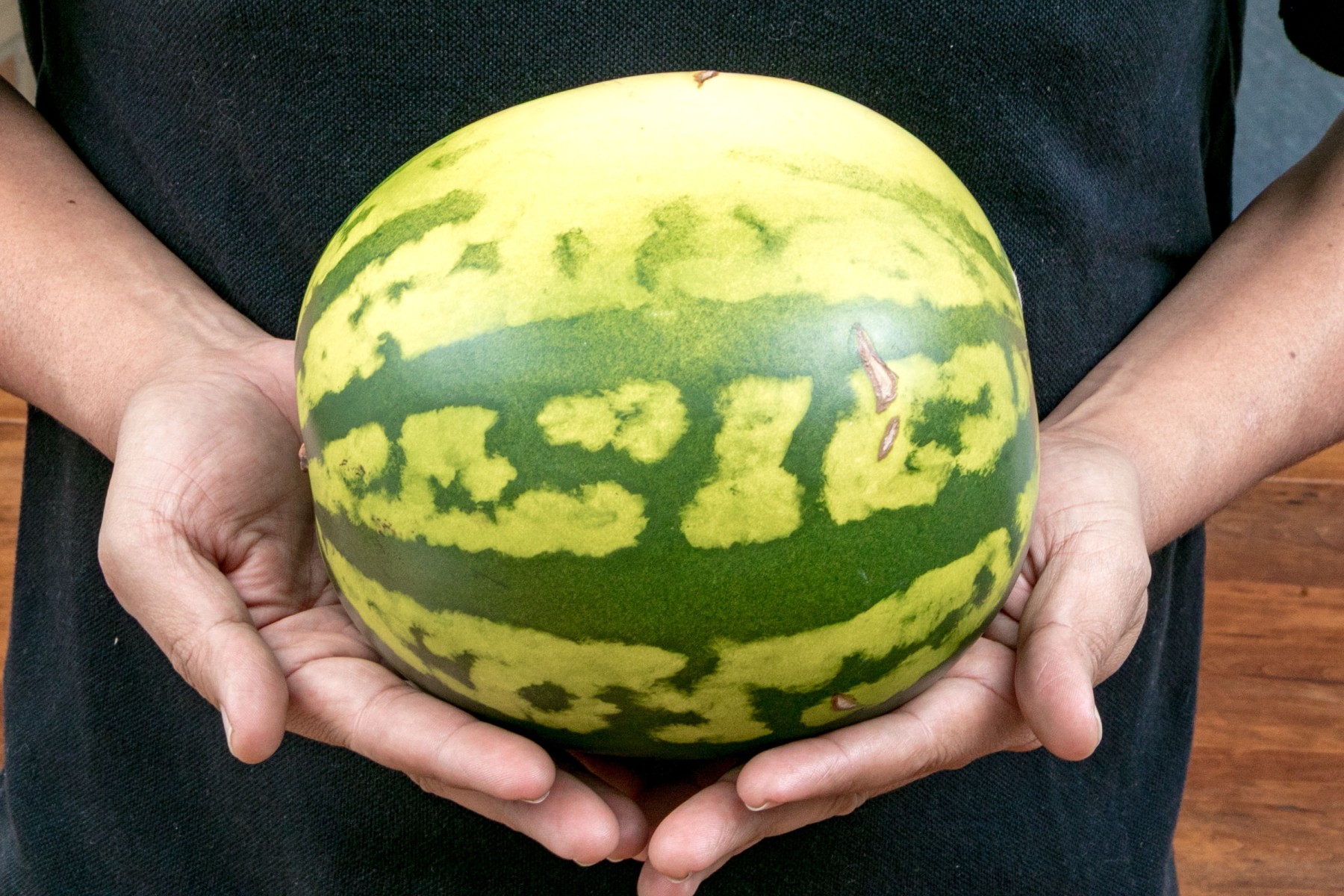 A fantastic ceramic figurine of a watermelon with delightful trompe l'oeil appeal, hand-painted in meticulous detail for a convincing, naturalistic appearance.