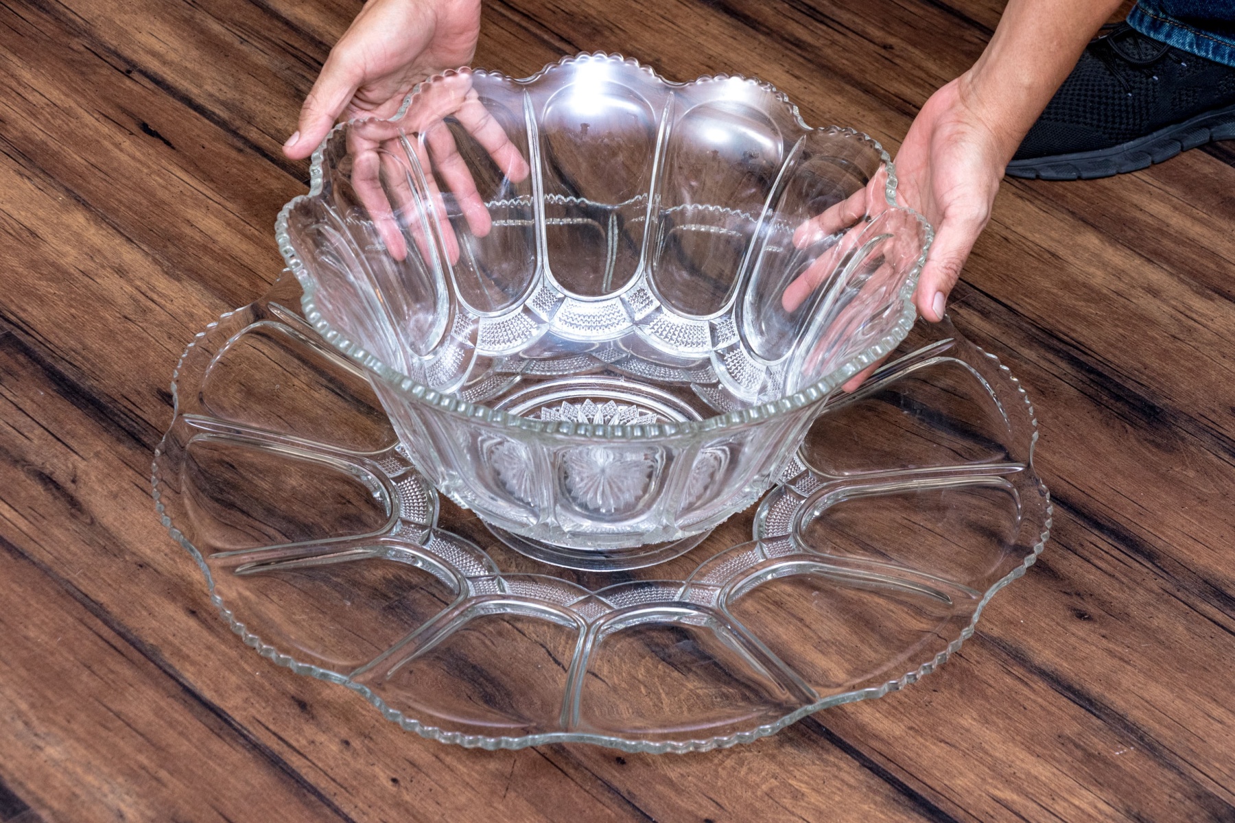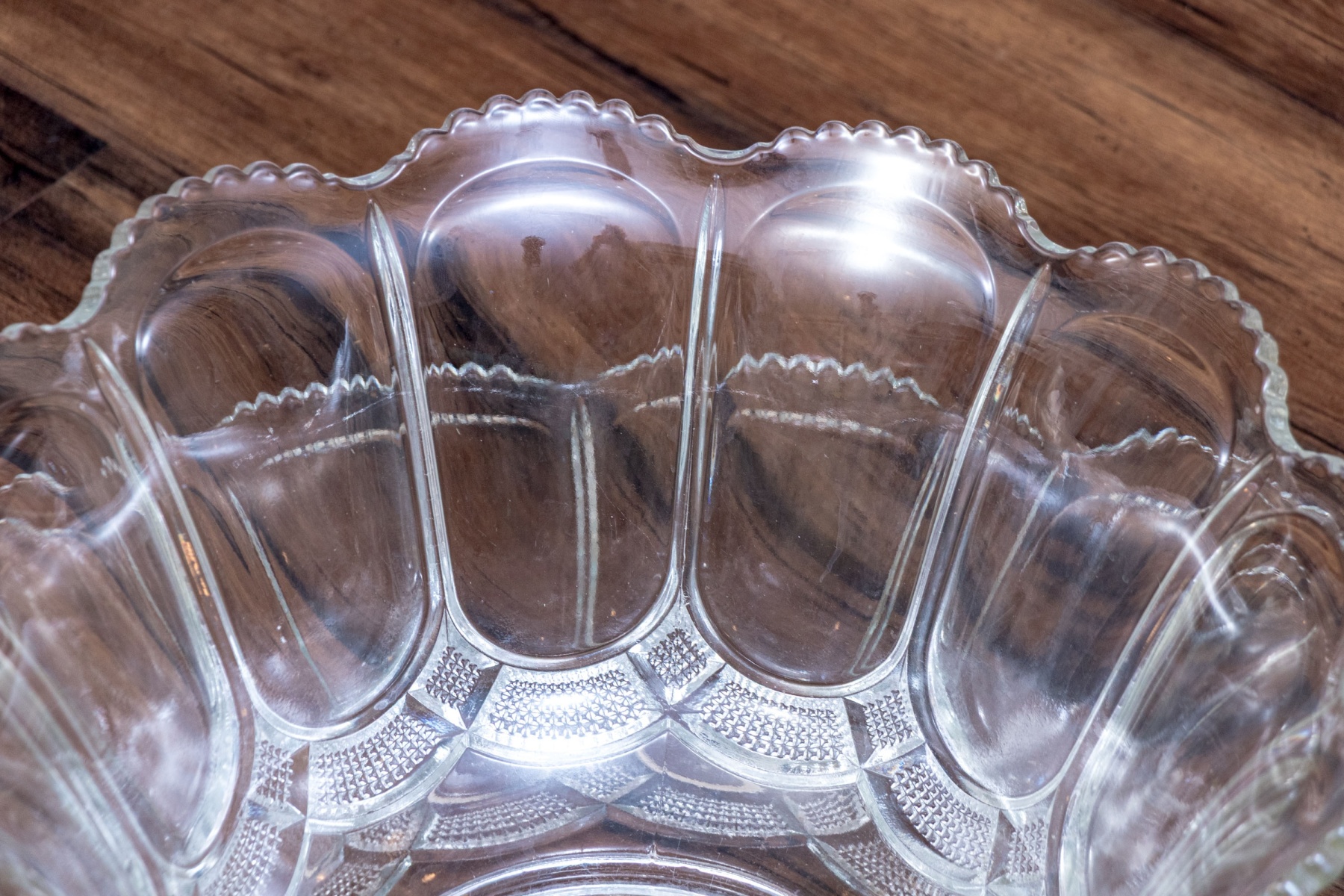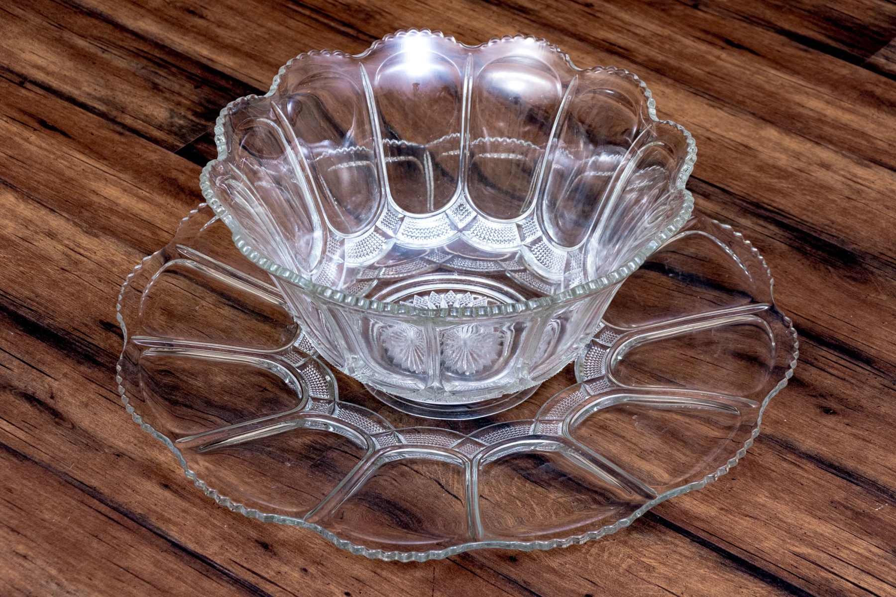Impressively large glass punch bowl with under tray. The bowl with petal lobed body creating a scalloped rim with sawtooth motif to each petal, along with its under tray with scalloped rim and sawtooth trim.