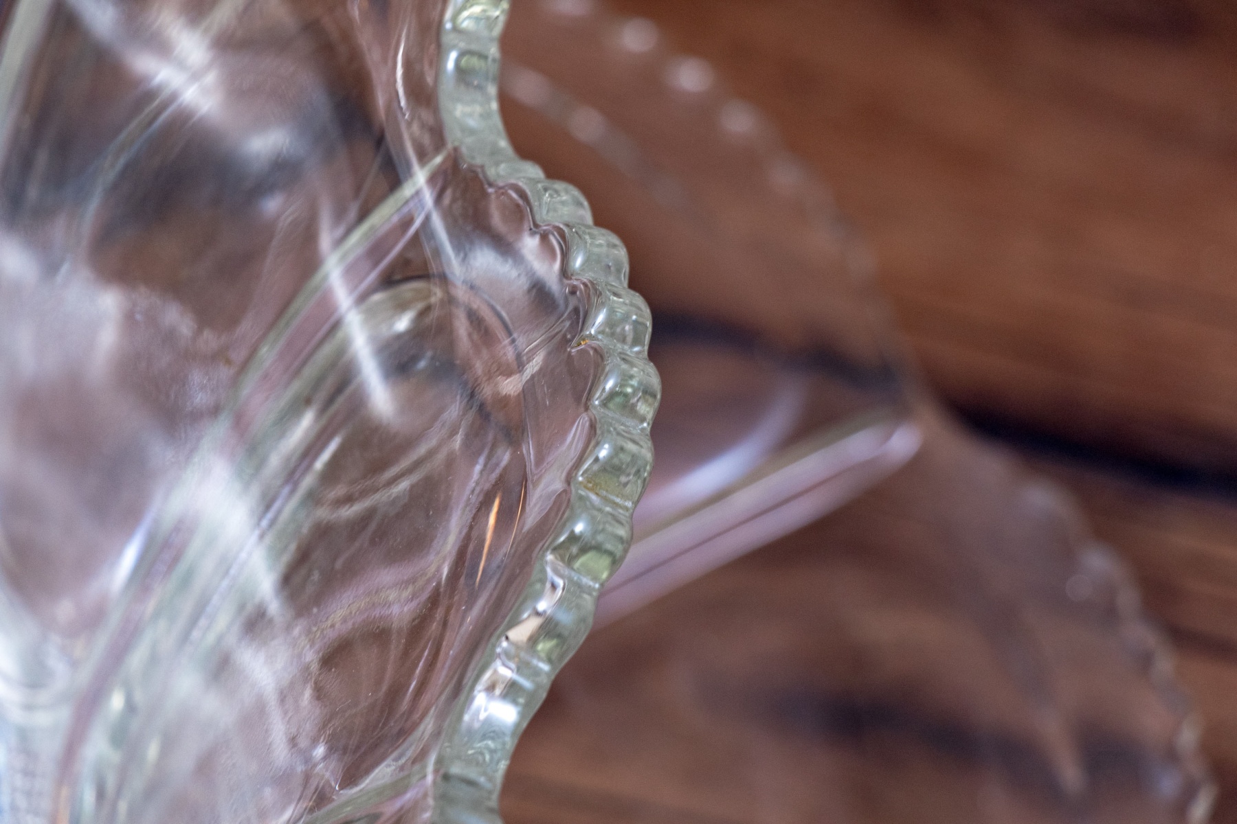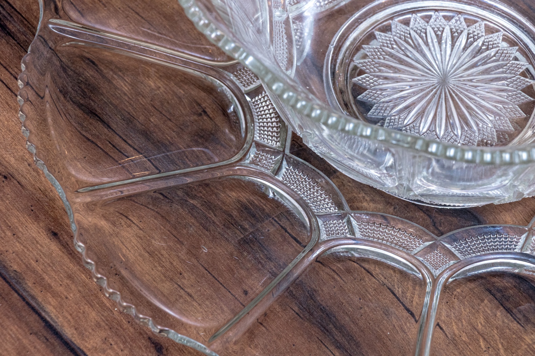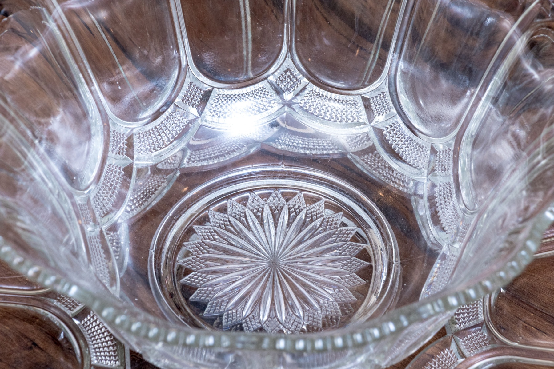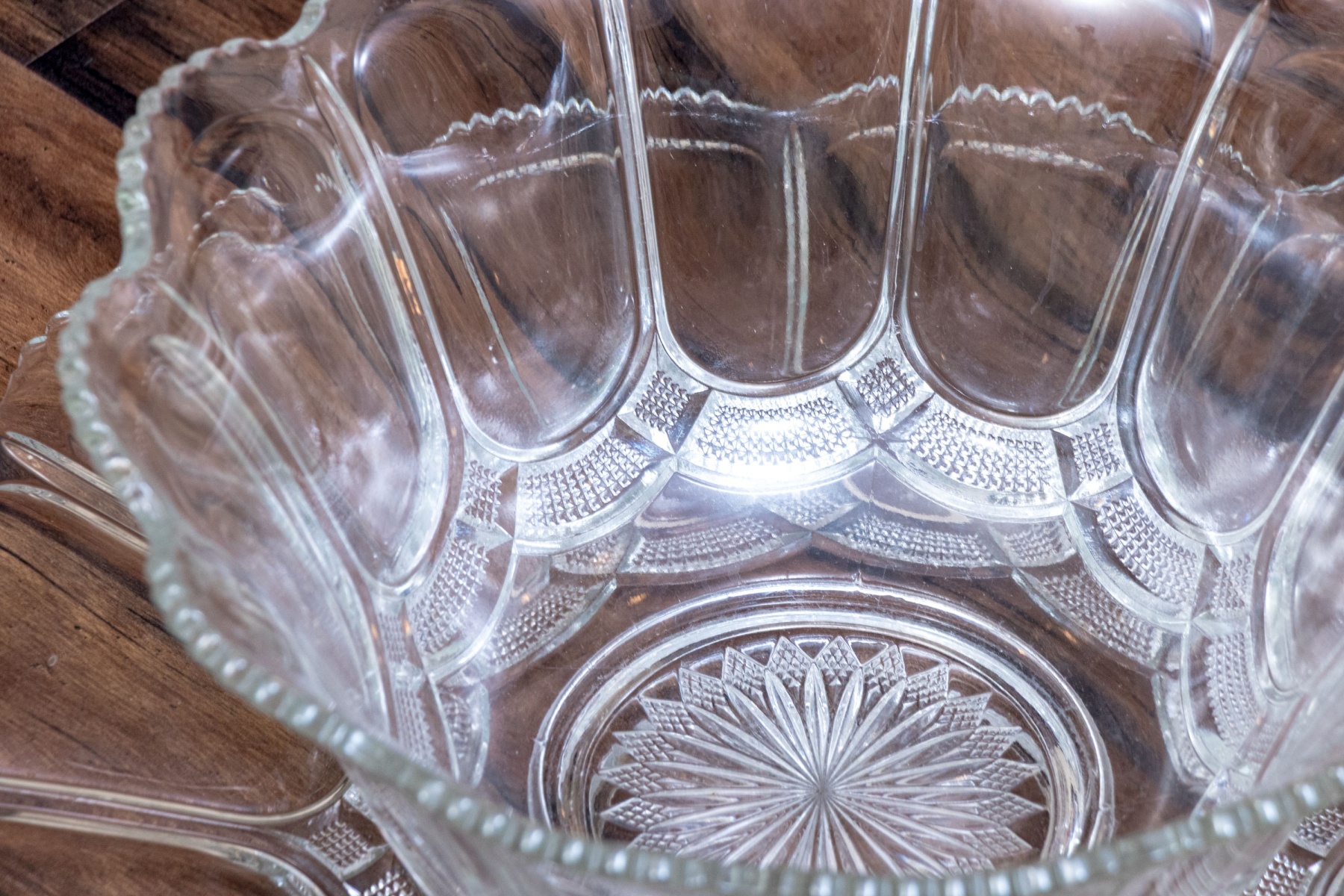 Impressively large glass punch bowl with under tray. The bowl with petal lobed body creating a scalloped rim with sawtooth motif to each petal, along with its under tray with scalloped rim and sawtooth trim.