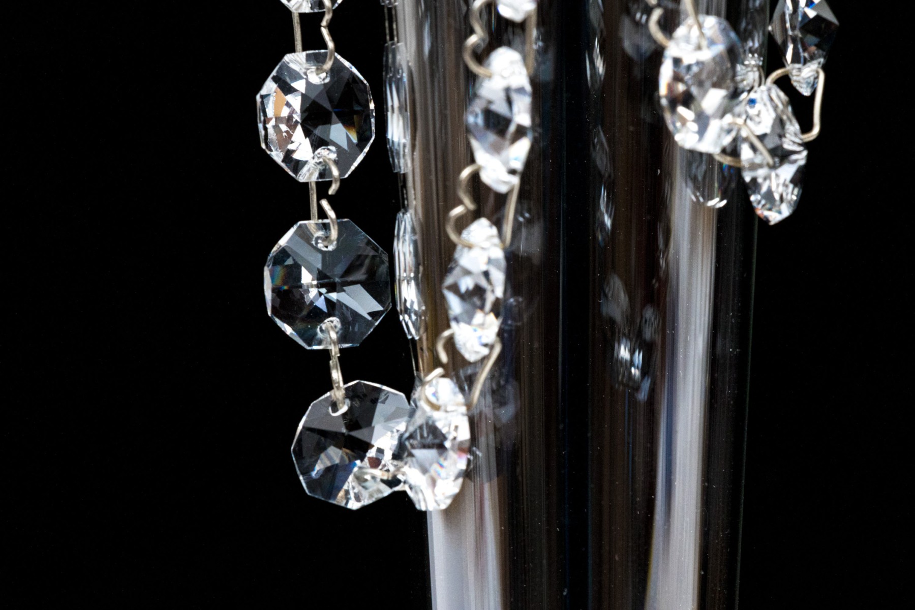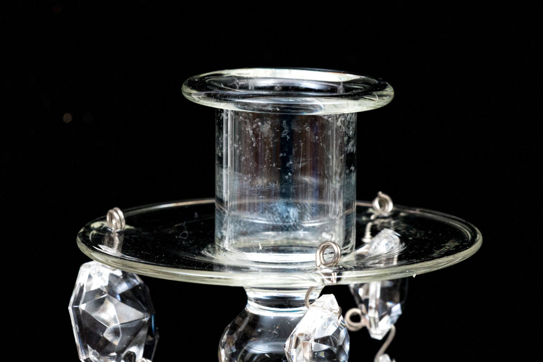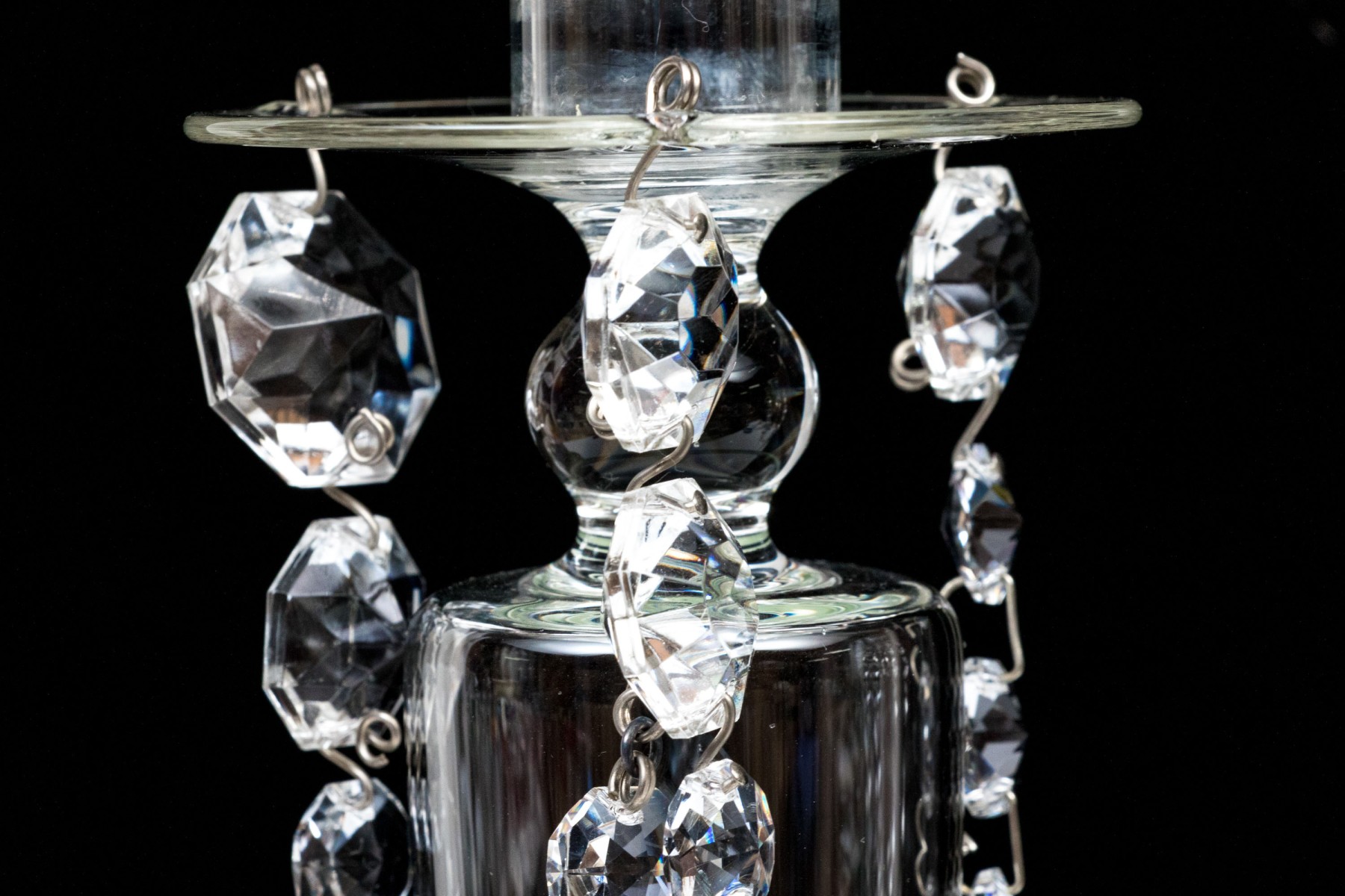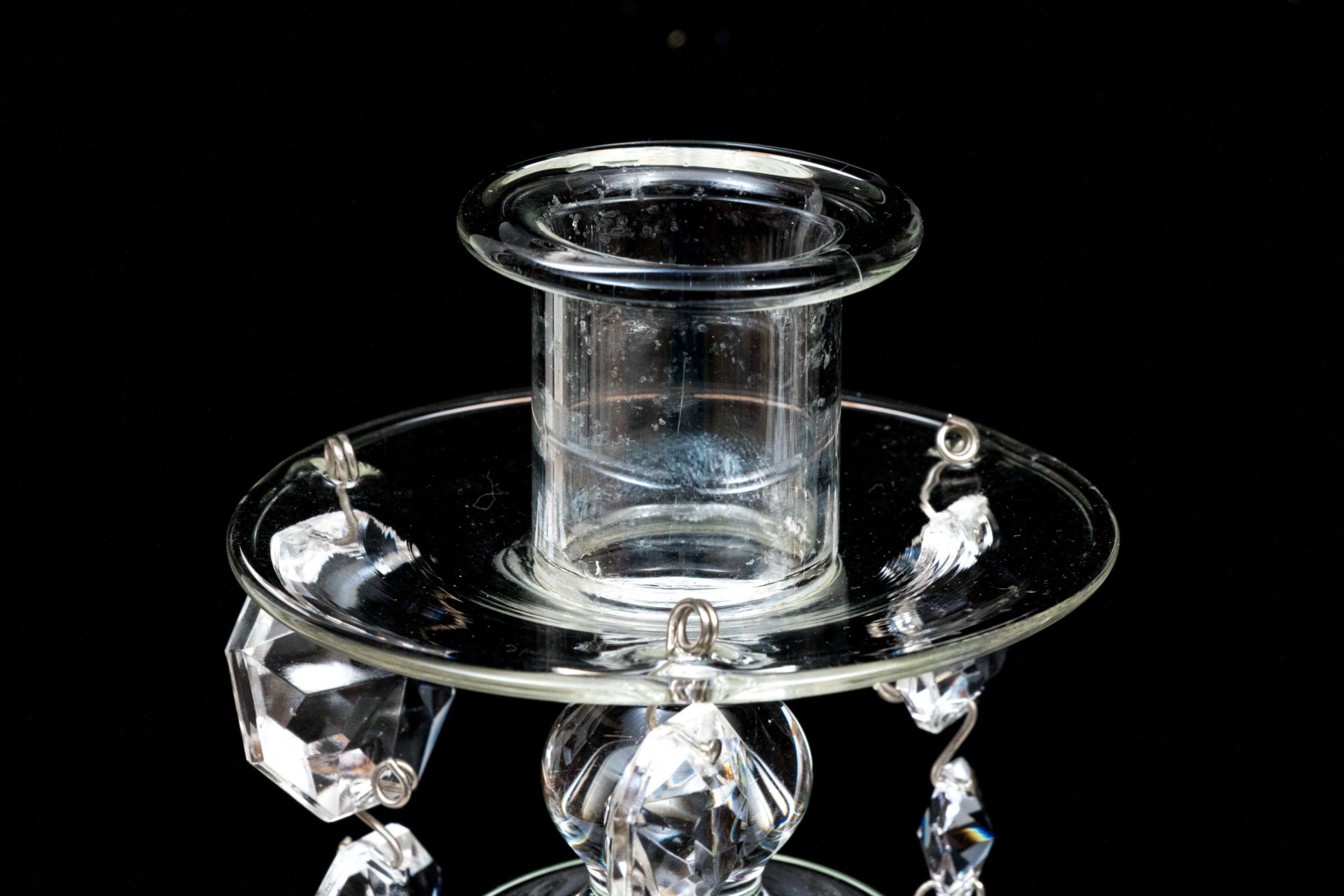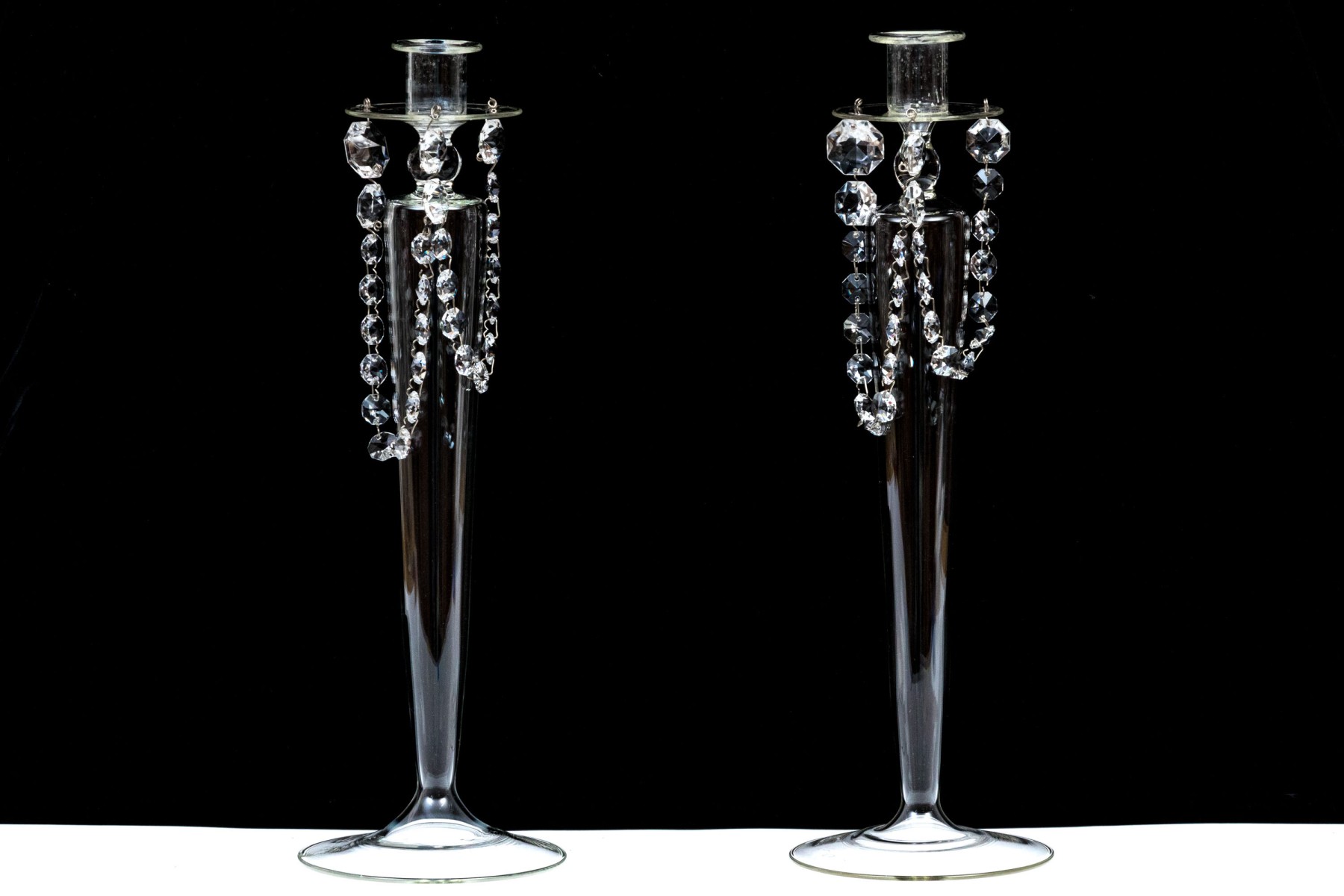 Standing on circular bases with tapered columns supporting nozzles with wax drip bobeches and pendant swags with faceted prisms.