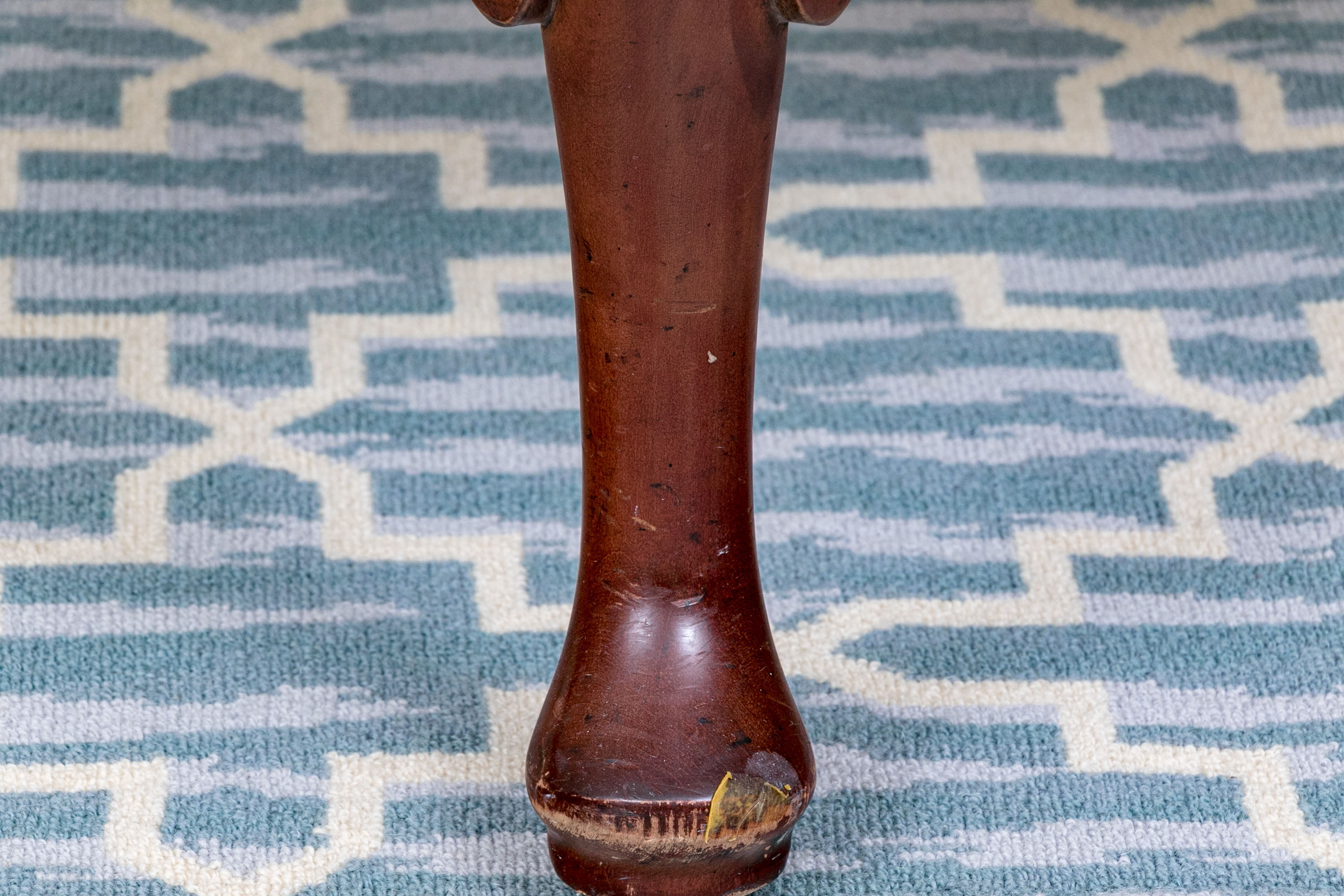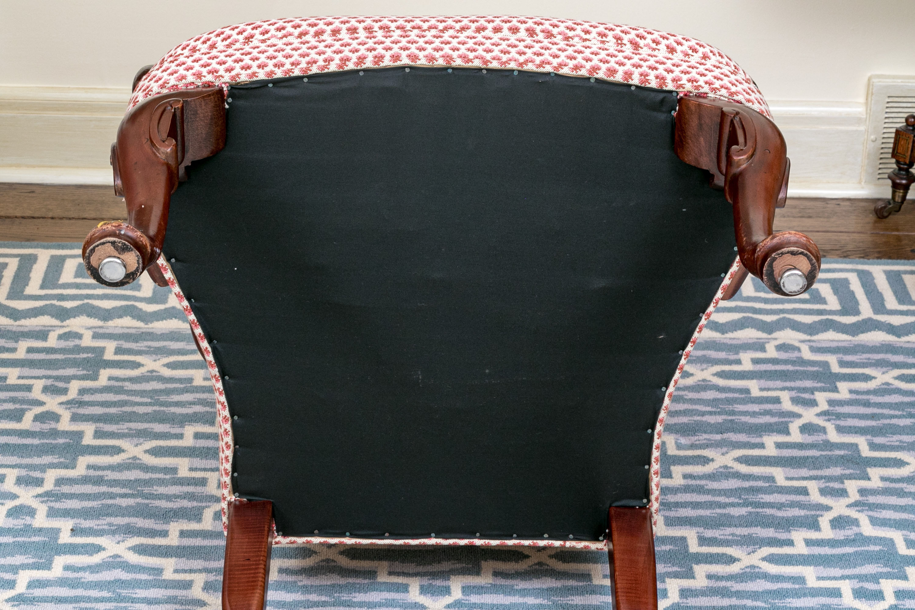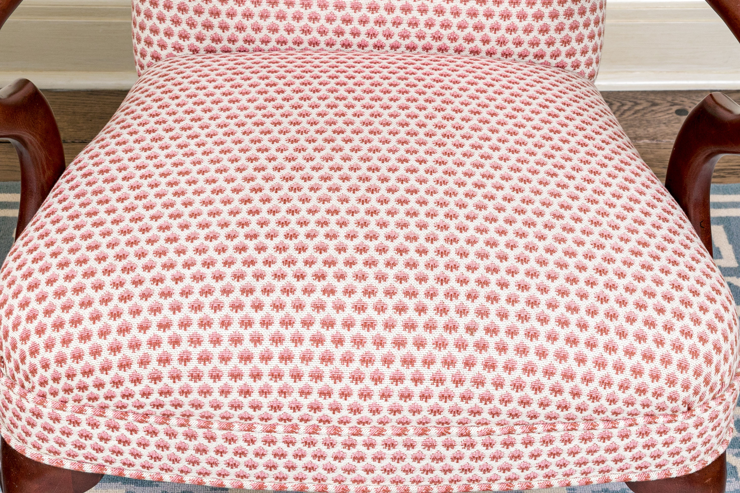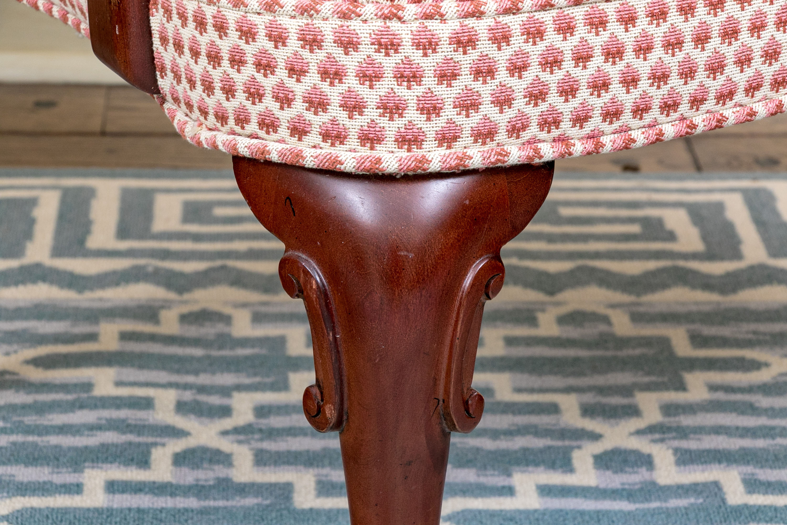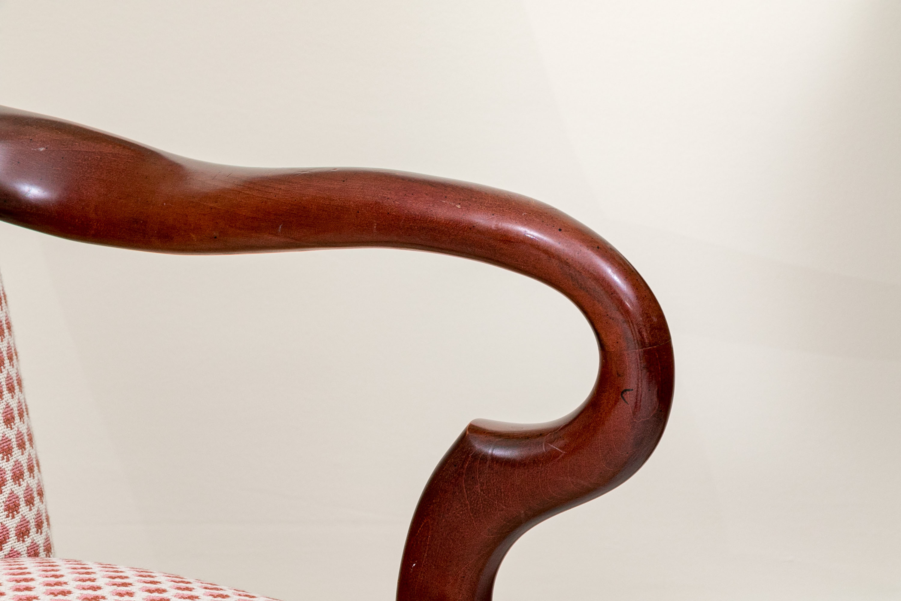 On pad and cabriole front legs with fabulously carved and finished goose neck arms and custom upholstered seat and seat back.