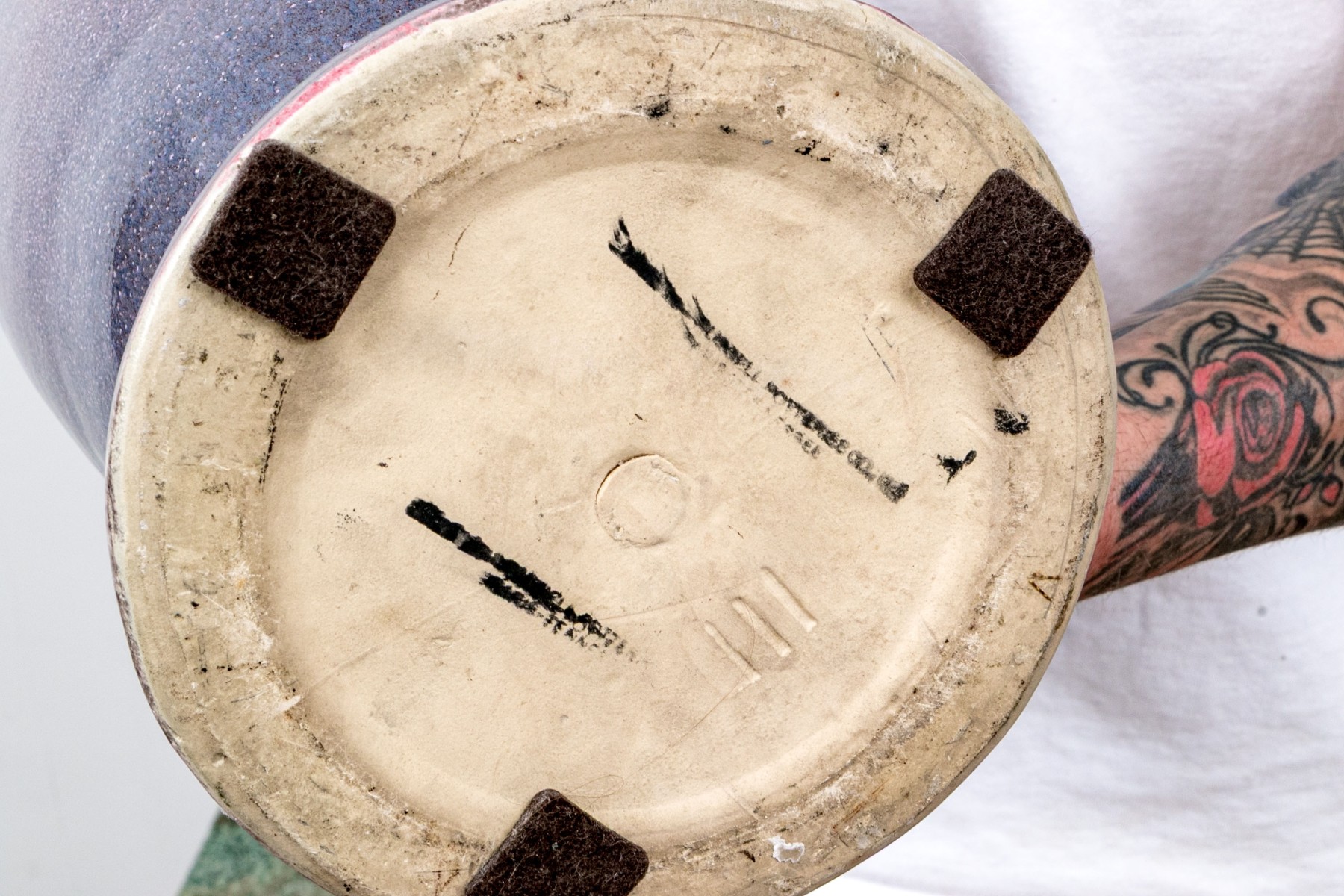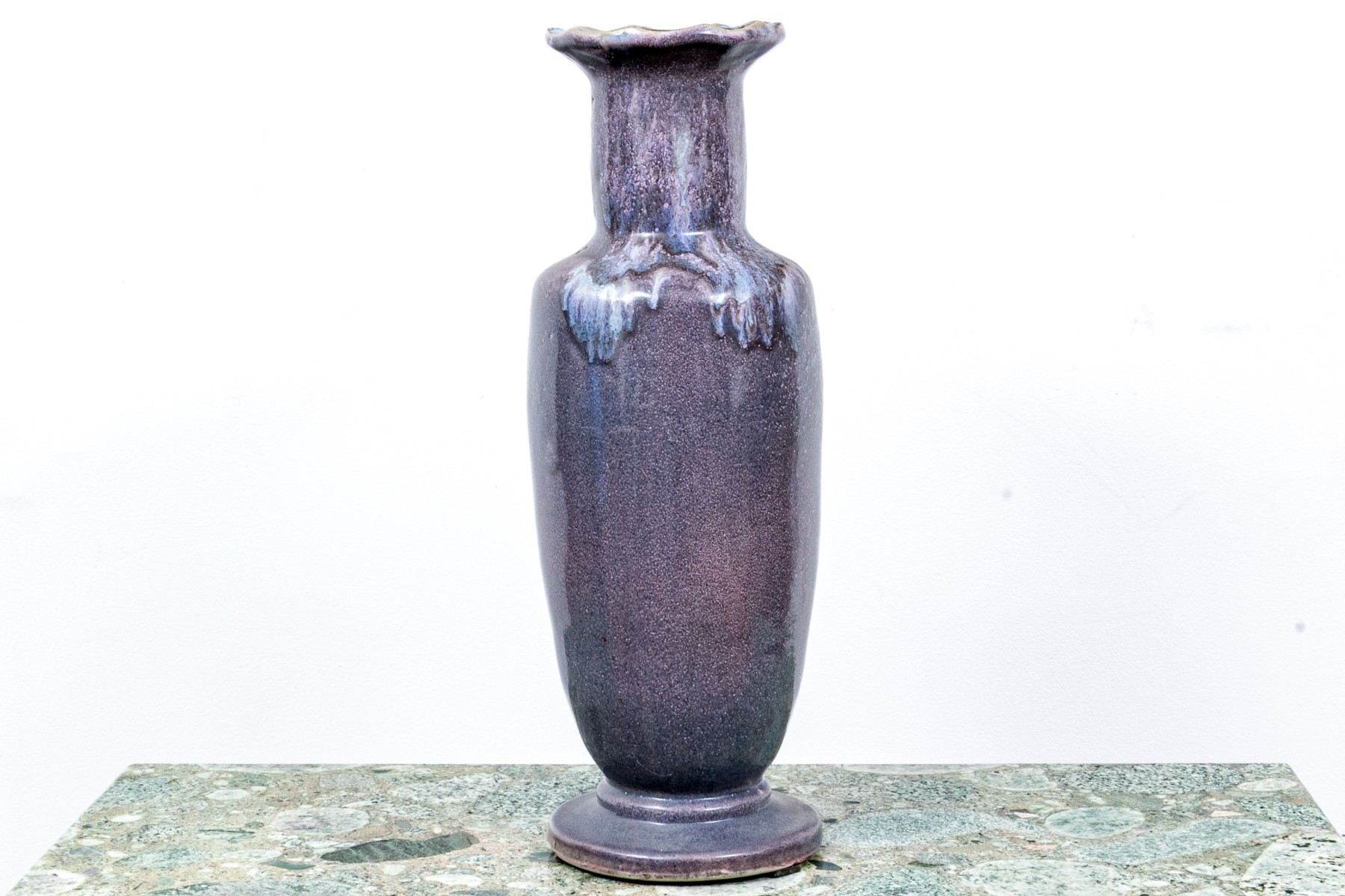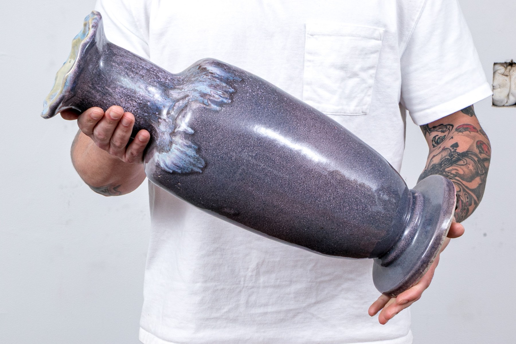 A fabulous and tall ceramic vase showcasing a mallet form with a scalloped and flared rim over a cylindrical neck tapering out to an elongated ovoid body terminating with a circular foot. Glazed in a hypnotic purple hue with drippy red and blue undertones. Marked underfoot.
