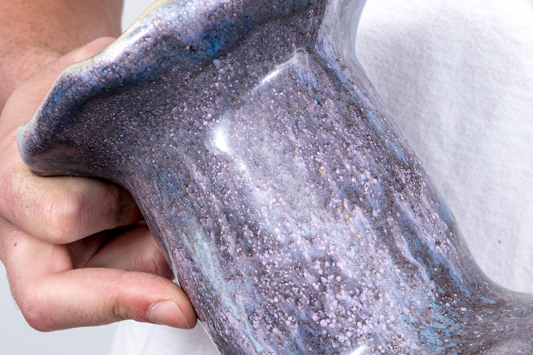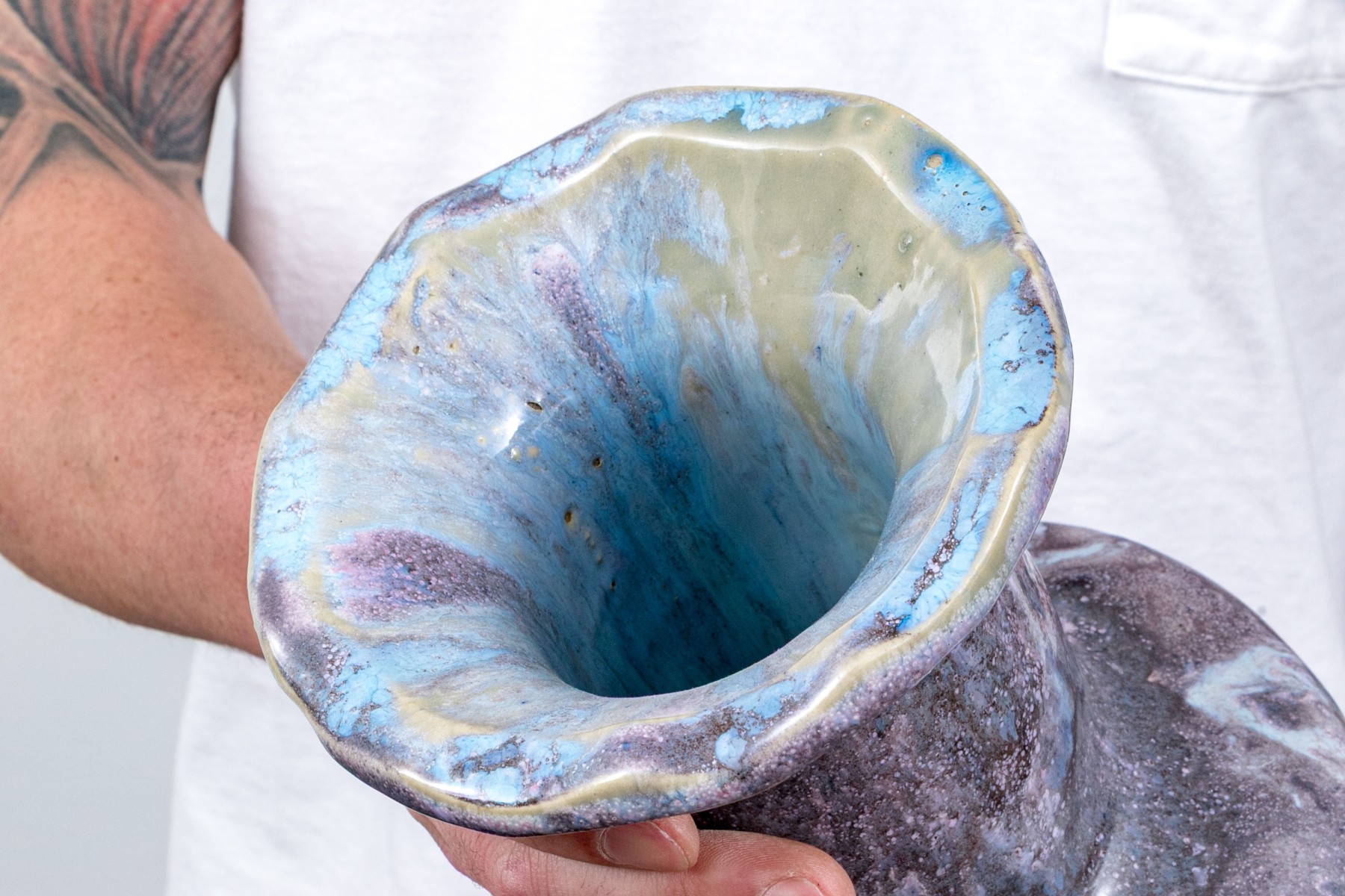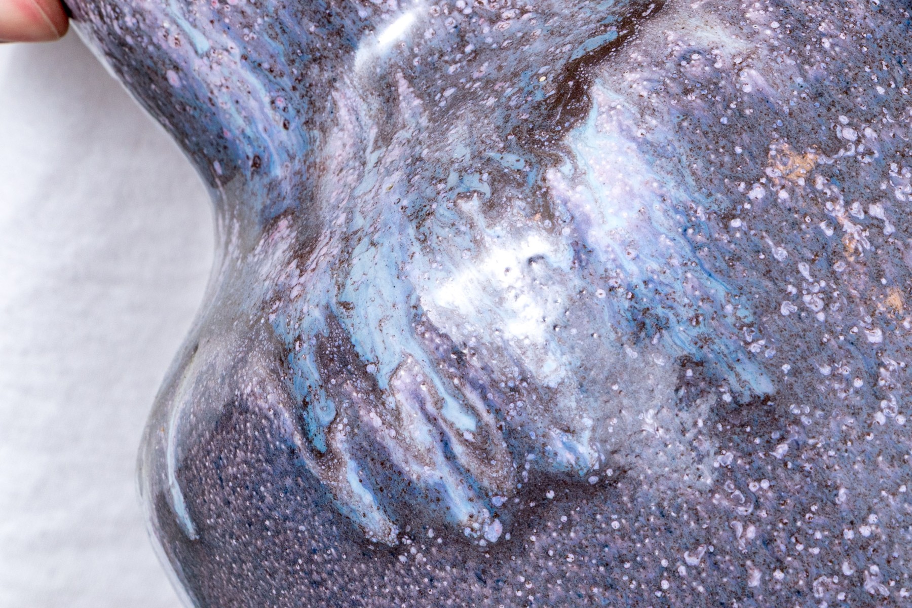 A fabulous and tall ceramic vase showcasing a mallet form with a scalloped and flared rim over a cylindrical neck tapering out to an elongated ovoid body terminating with a circular foot. Glazed in a hypnotic purple hue with drippy red and blue undertones. Marked underfoot.