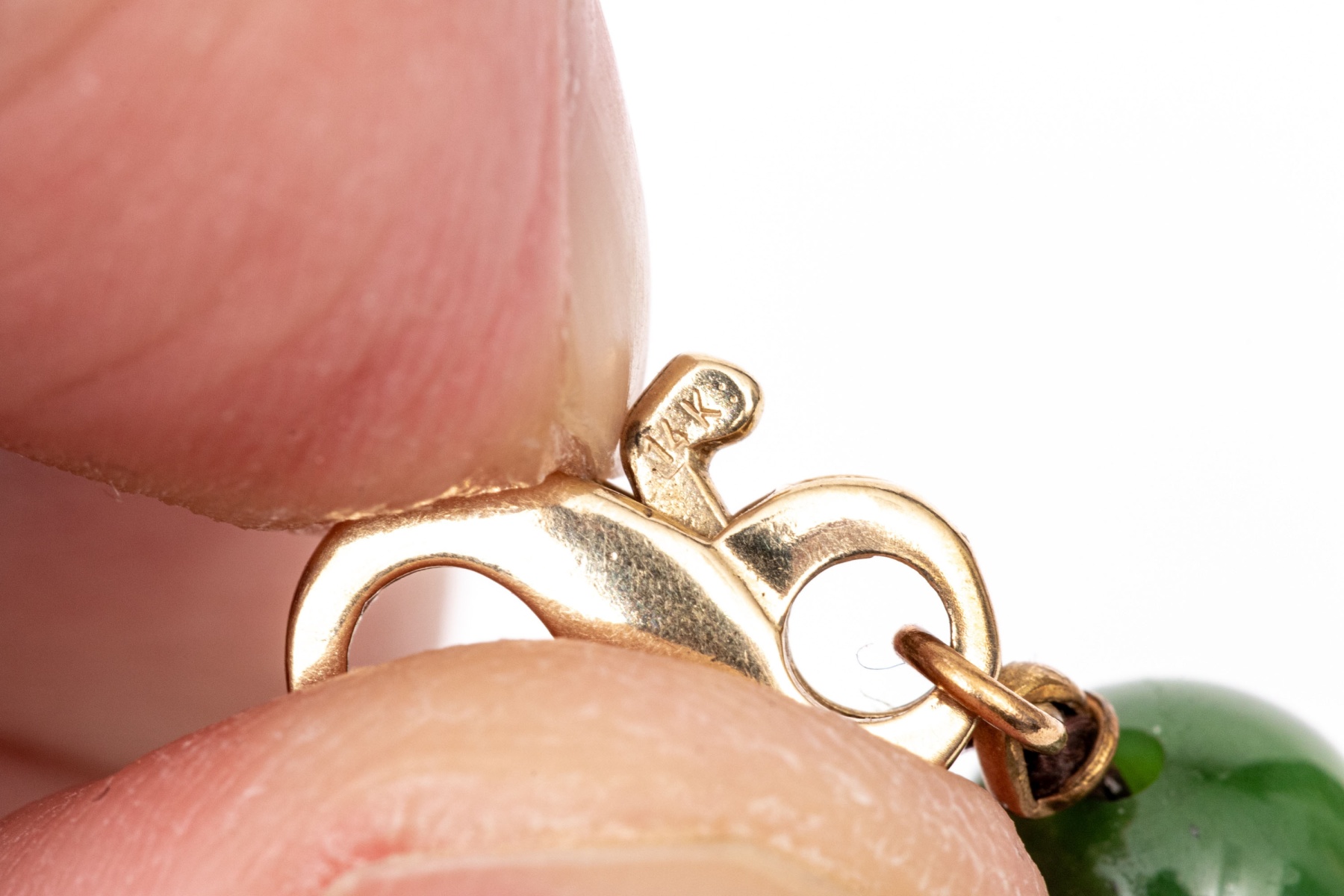 Fabulous retro opera length nephrite jade and corrugated 14k yellow gold bead necklace, finished with a lobster claw style clasp.