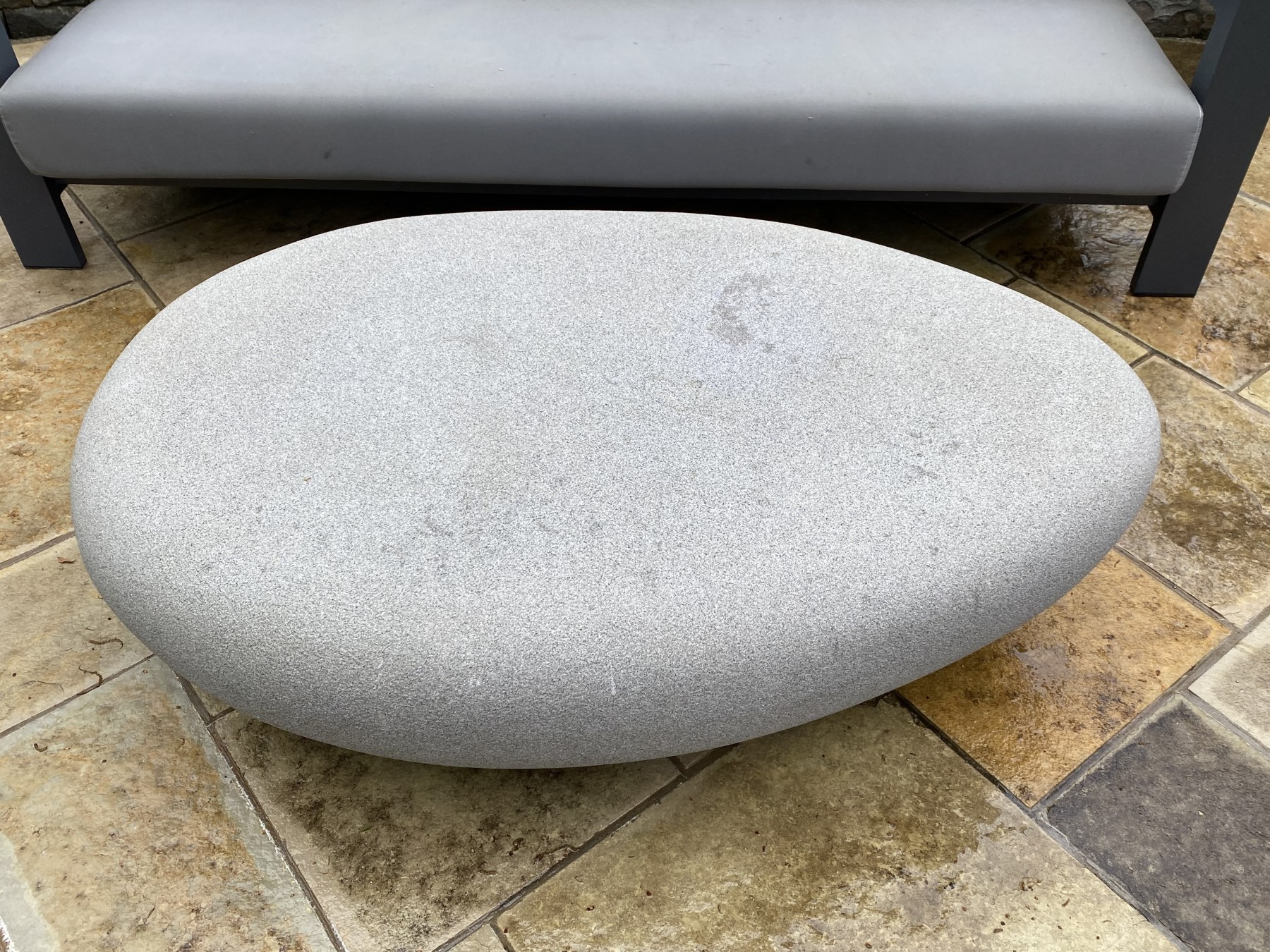 A fabulous outdoor coffee table in the form of a rounded river stone with a beautiful pebbled gray finish and a flattened top. The sleek, eye-catching design evokes a refreshing, zen atmosphere.