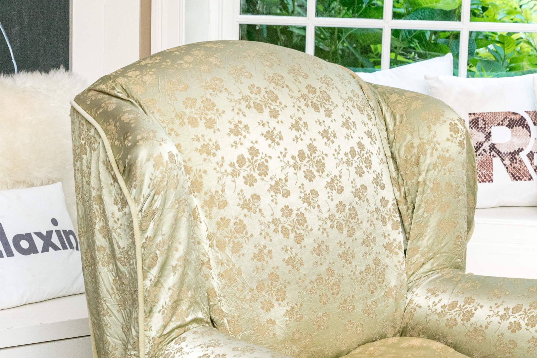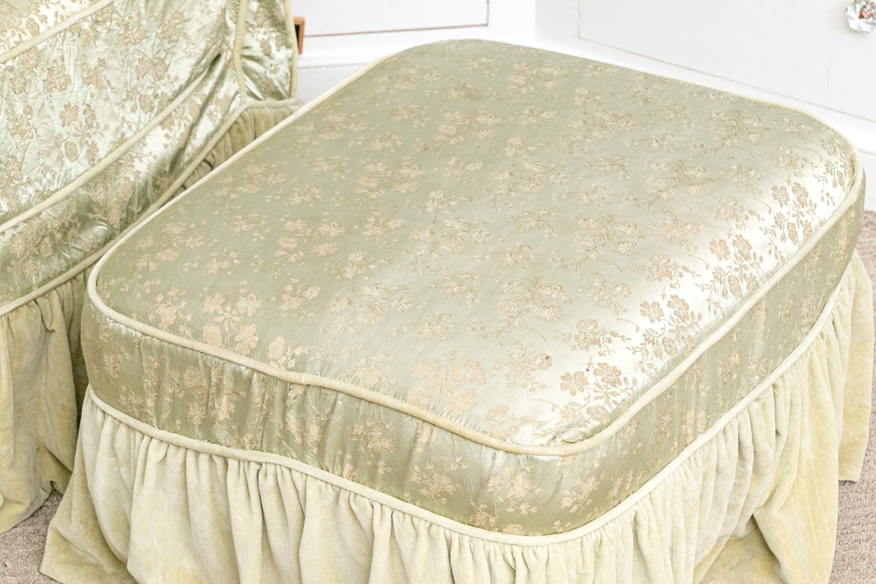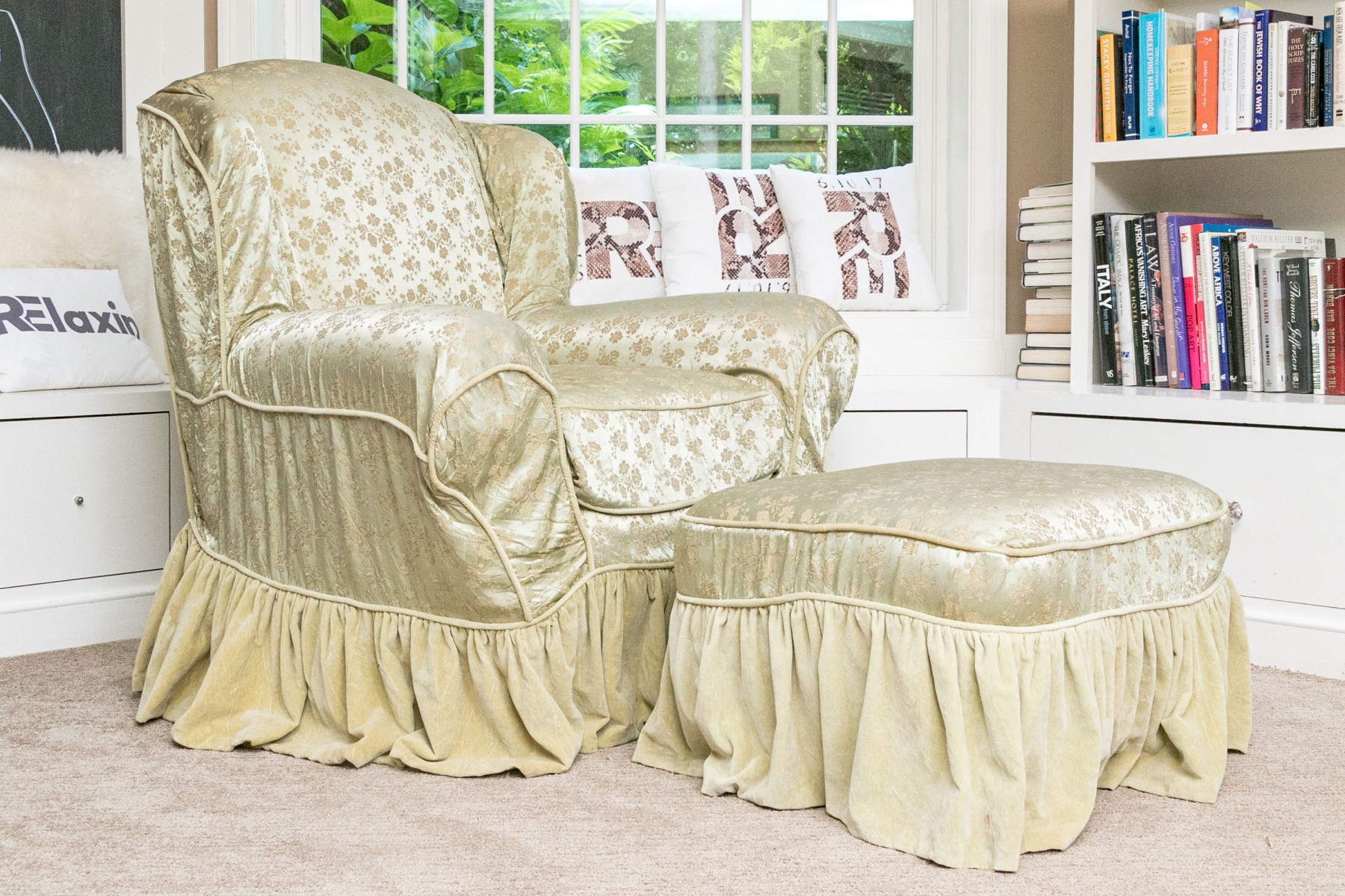 A white muslin rocking club chair and ottoman. The chair has a winged back and rolled arms. The chair and ottoman are covered in a floral asian printed celadon fabric.