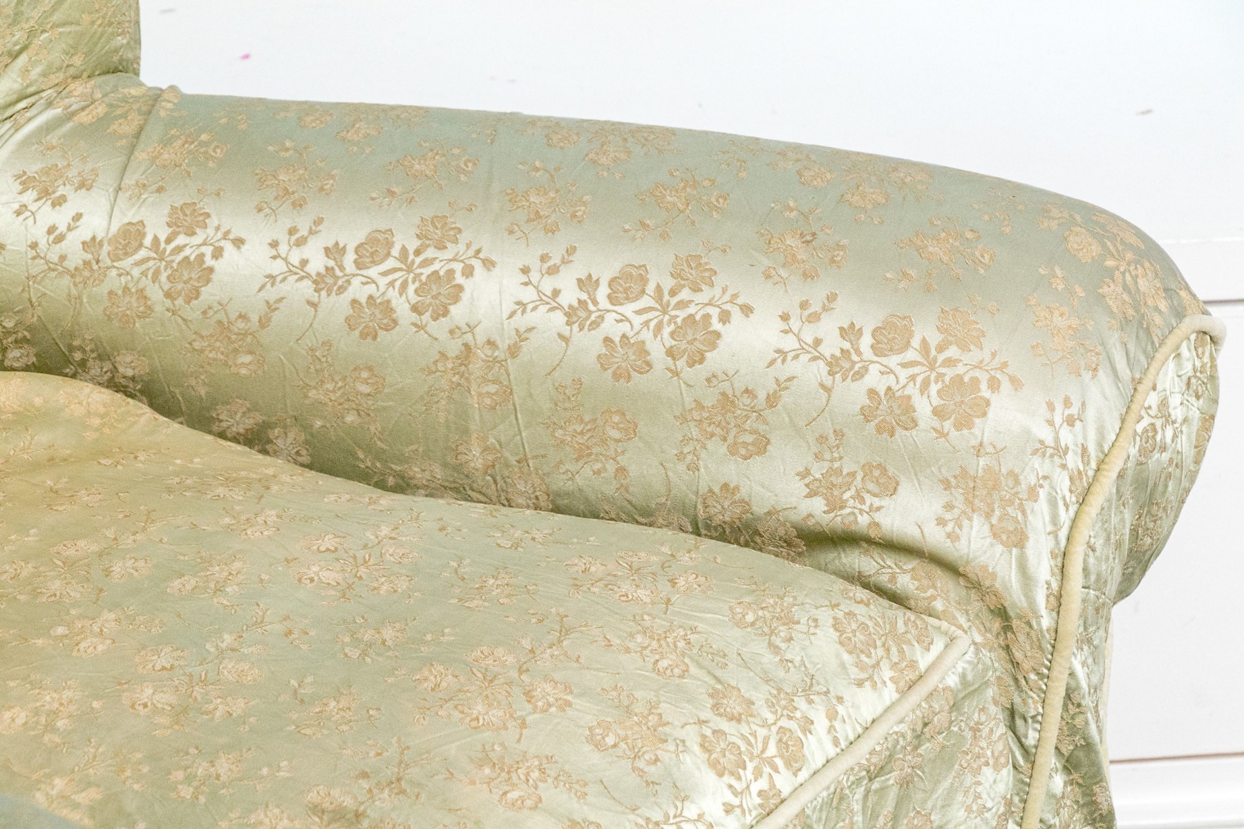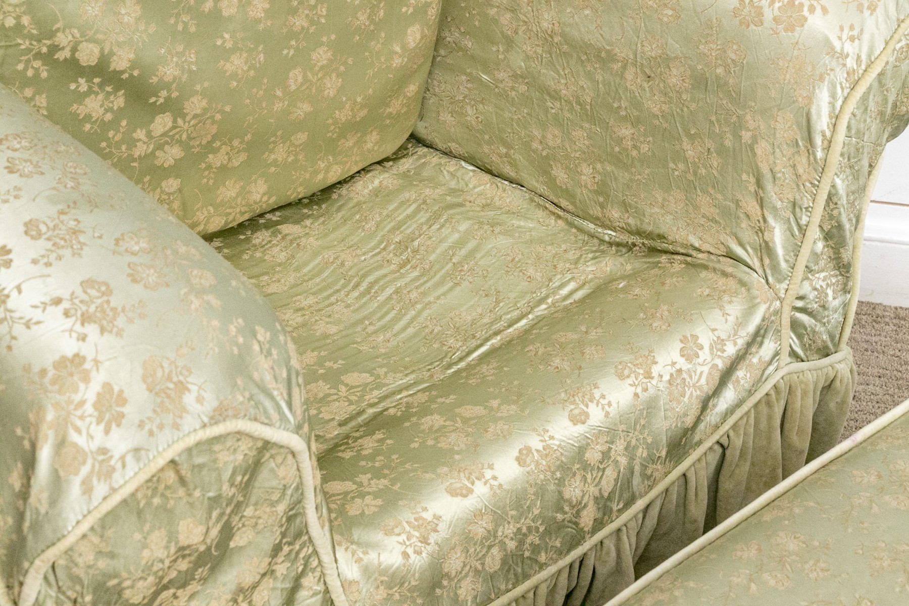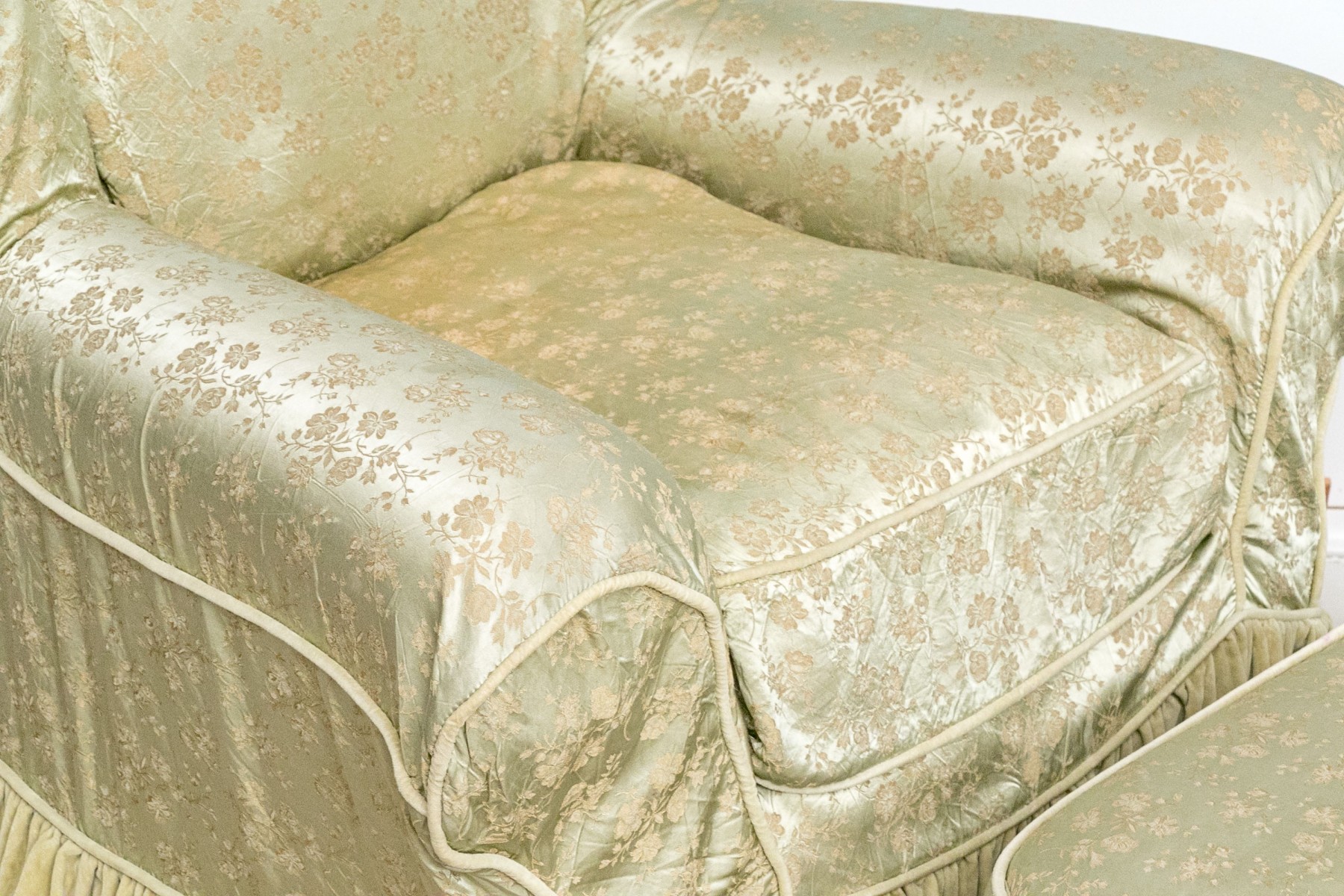 A white muslin rocking club chair and ottoman. The chair has a winged back and rolled arms. The chair and ottoman are covered in a floral asian printed celadon fabric.