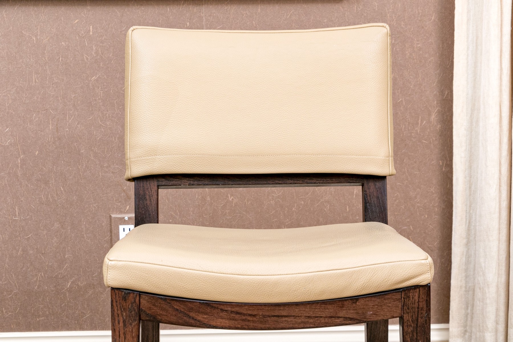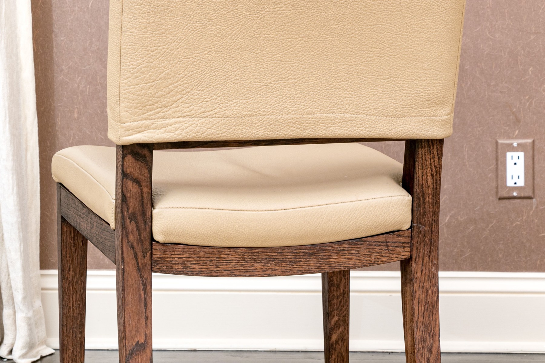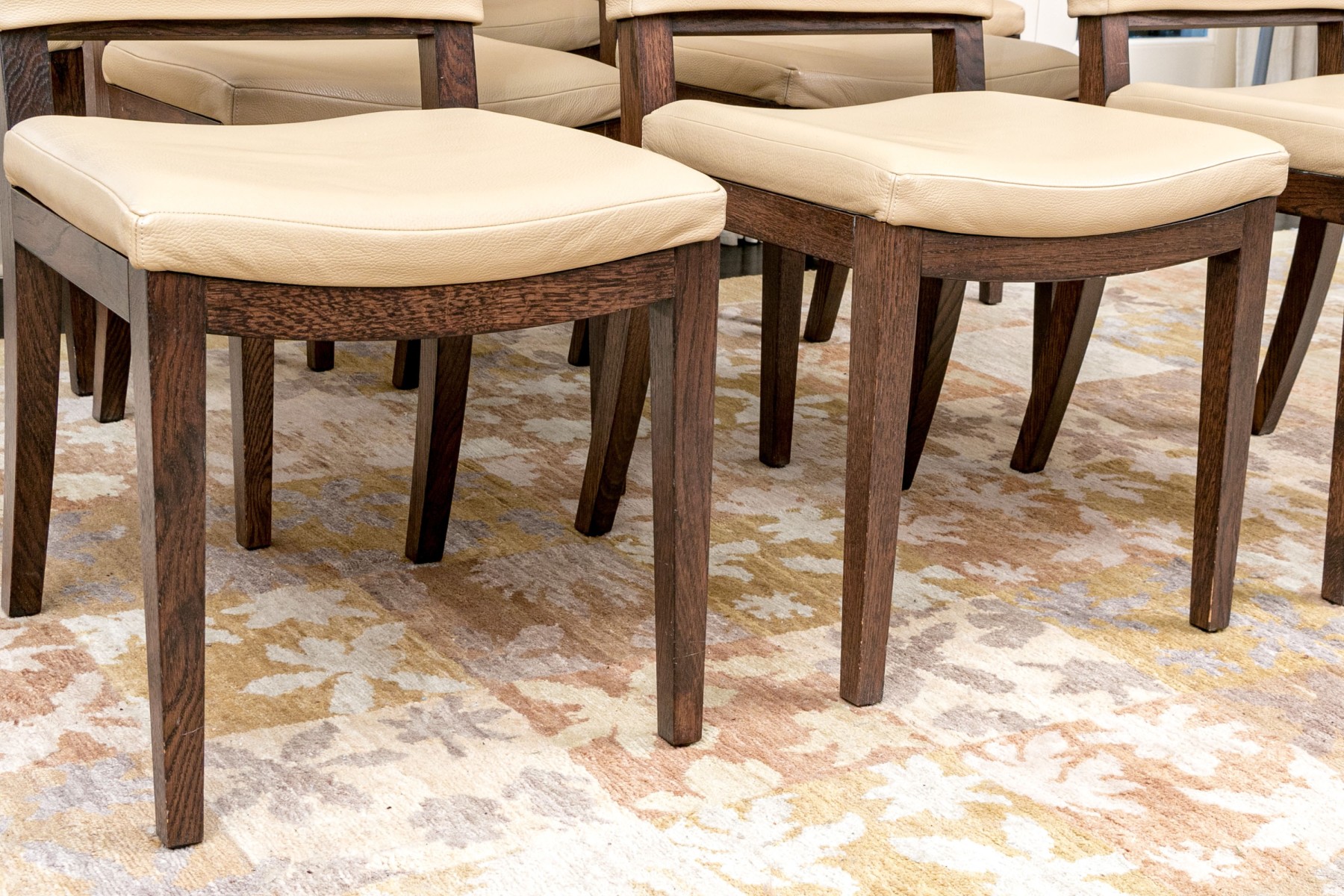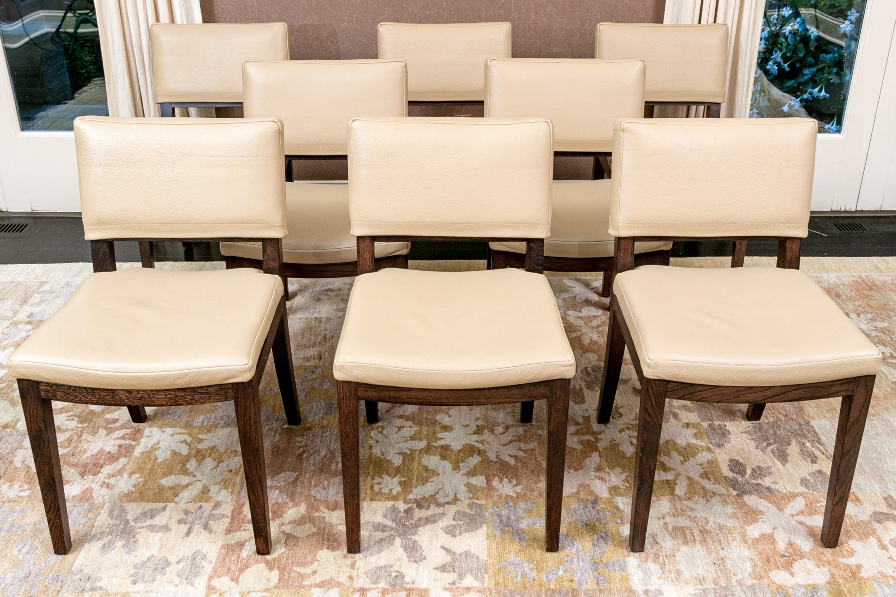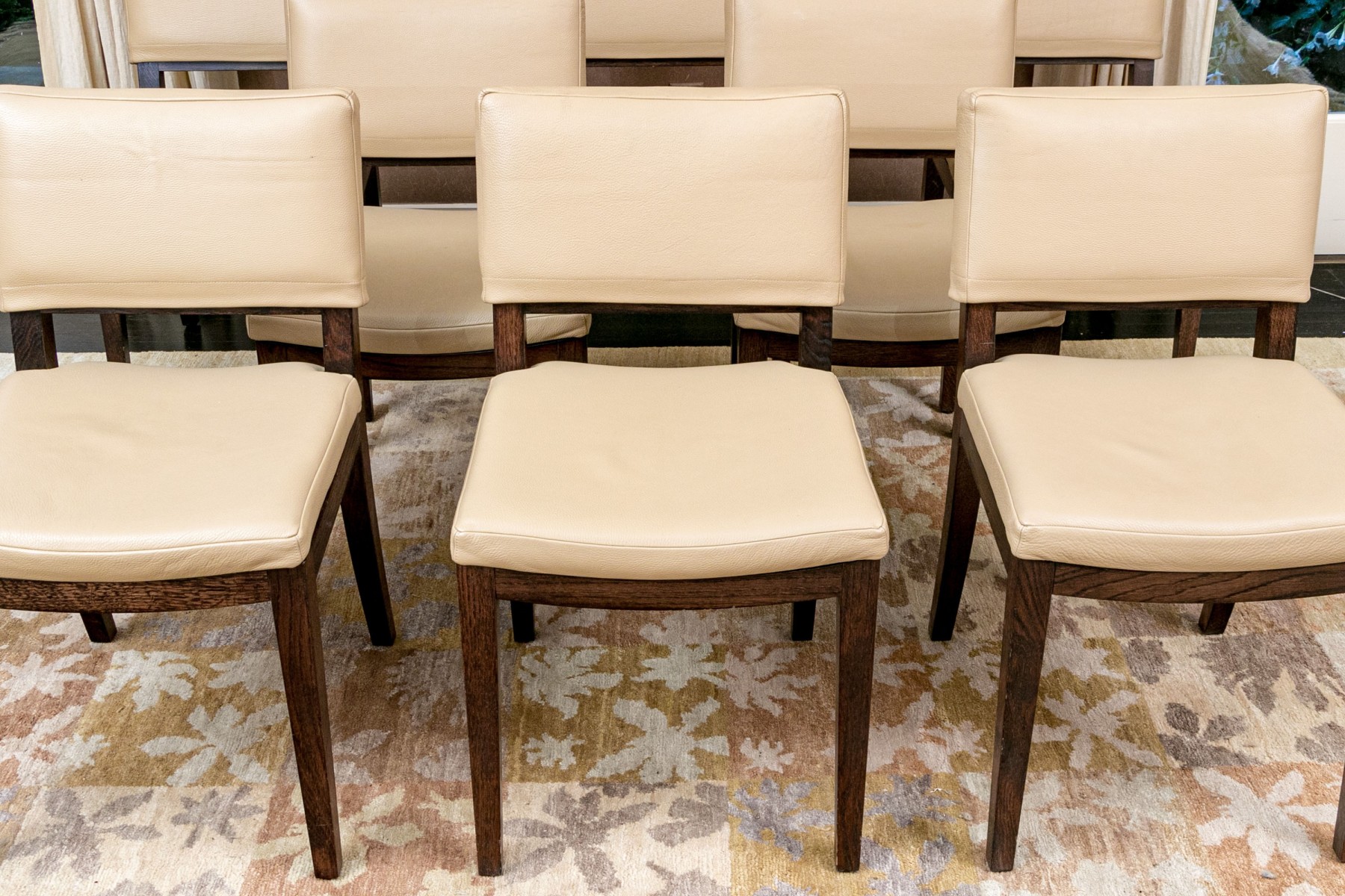 This elegant set of eight dining chairs showcases a modern and eco-friendly approach to dining room seating. Upholstered in high-quality vegan leather, the chairs offer a sleek and sophisticated look, combining durability with comfort. Each chair features a contemporary design with clean lines and a supportive backrest, making them a perfect fit for both formal and casual dining settings. The neutral color and versatile style make these chairs a timeless addition to any dining space.