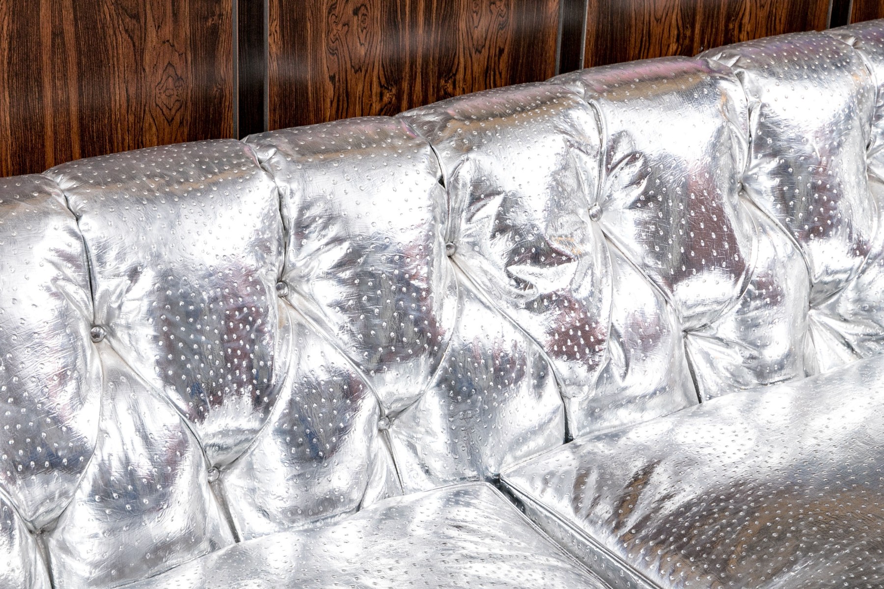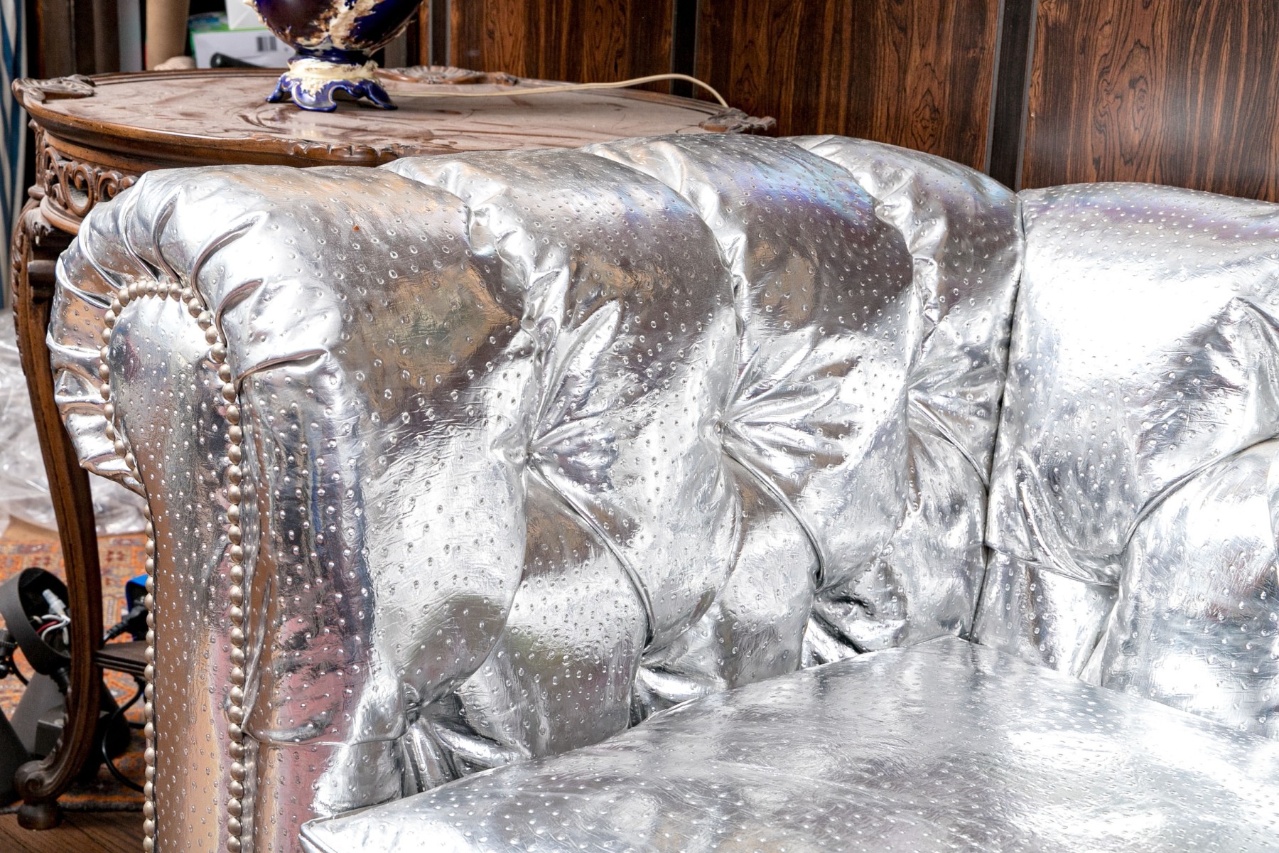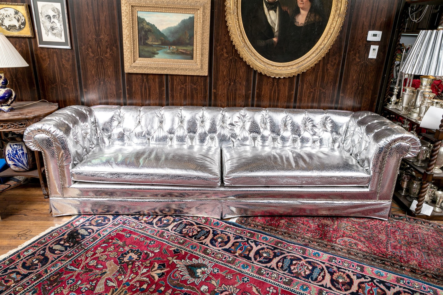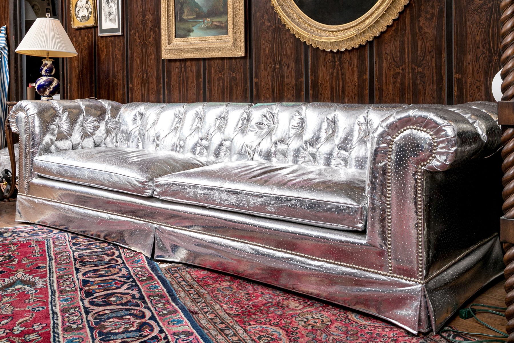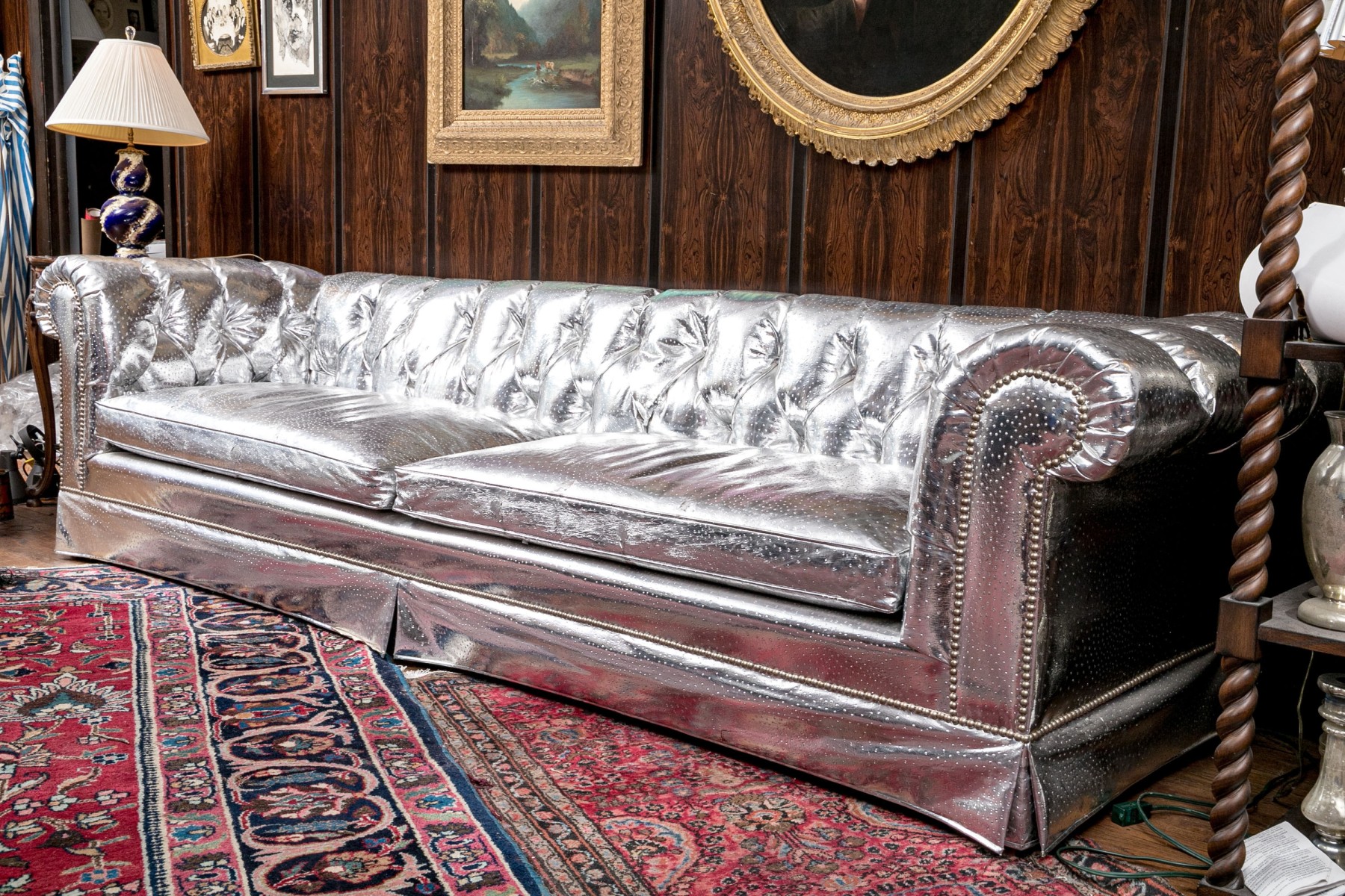 A stunning and very stylish sofa with classic Chesterfield influence modernized by silvery mylar-like upholstery with stippled relief creating a faux leather texture. The sofa features rolled arms and a long, flush height back with button tufting throughout, fitted with two loose seat cushions and detailed with nailhead trims. Finished with a straight apron and skirt concealing the legs beneath.