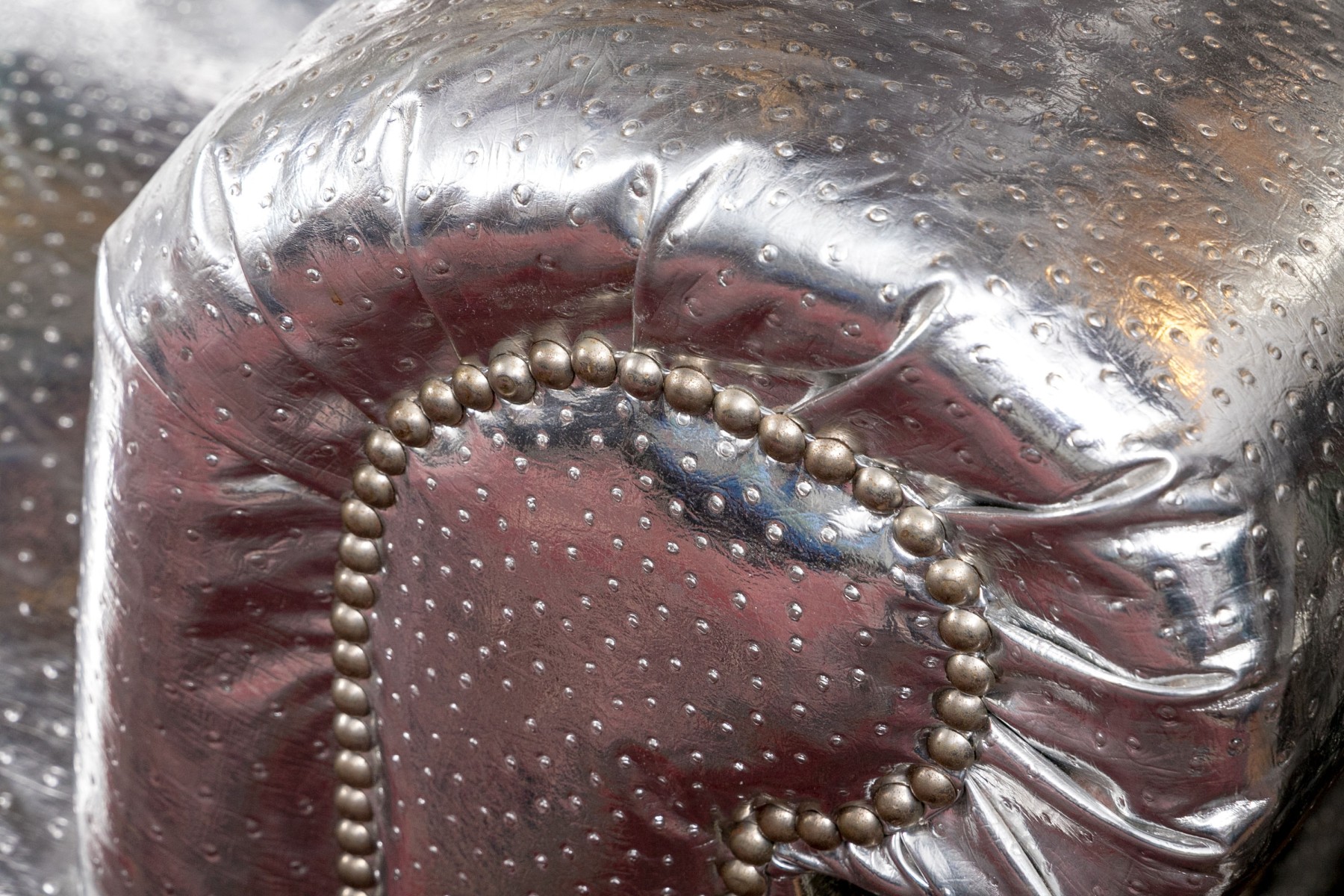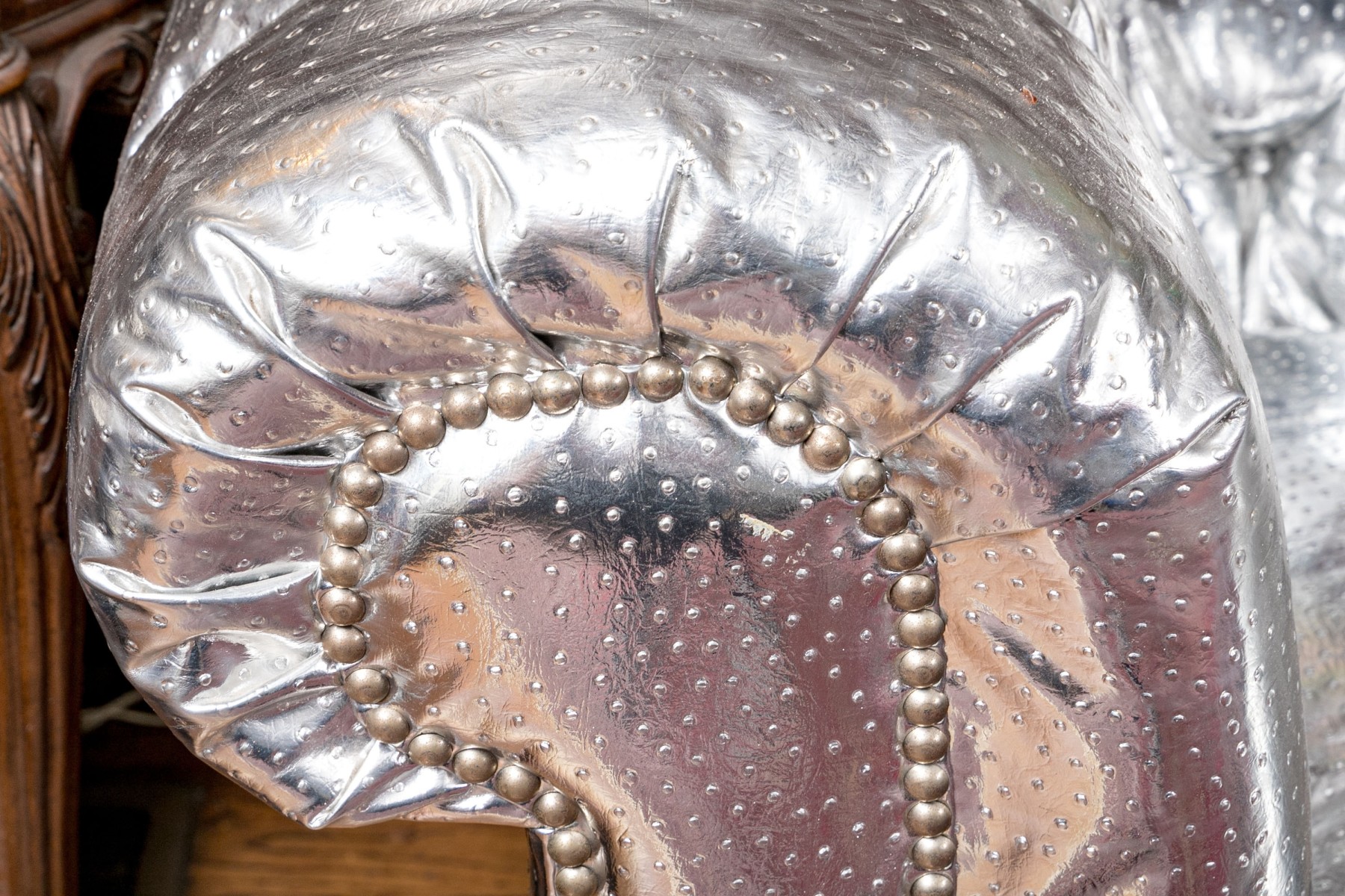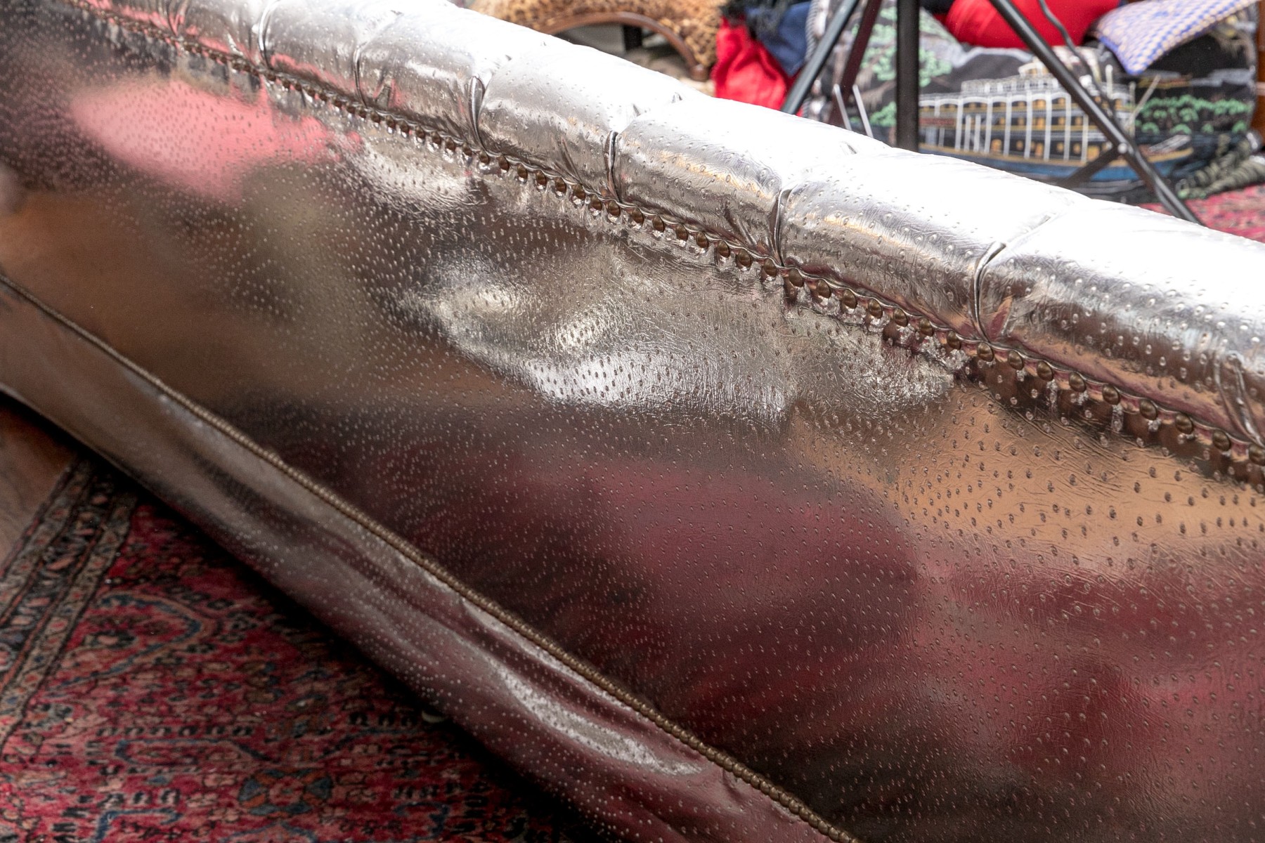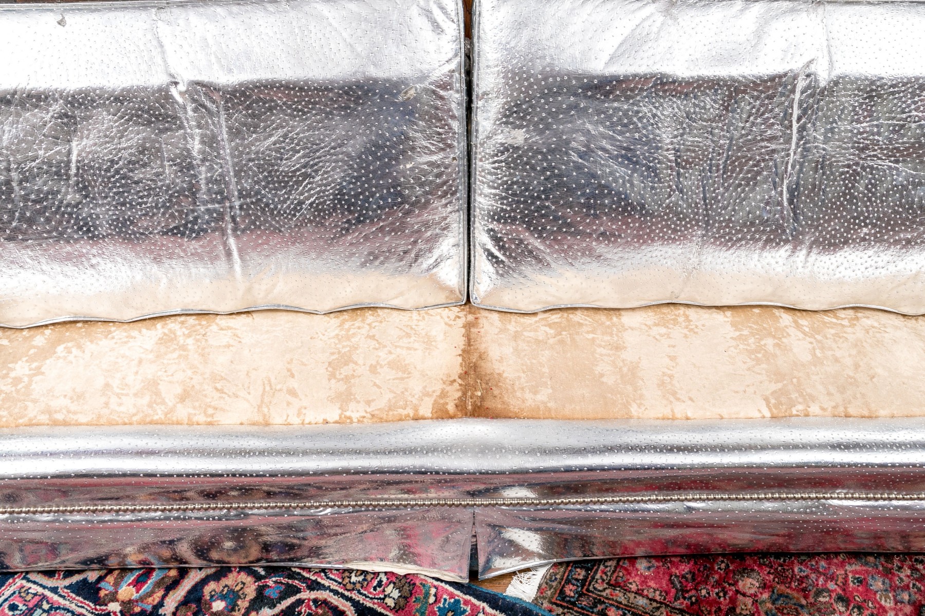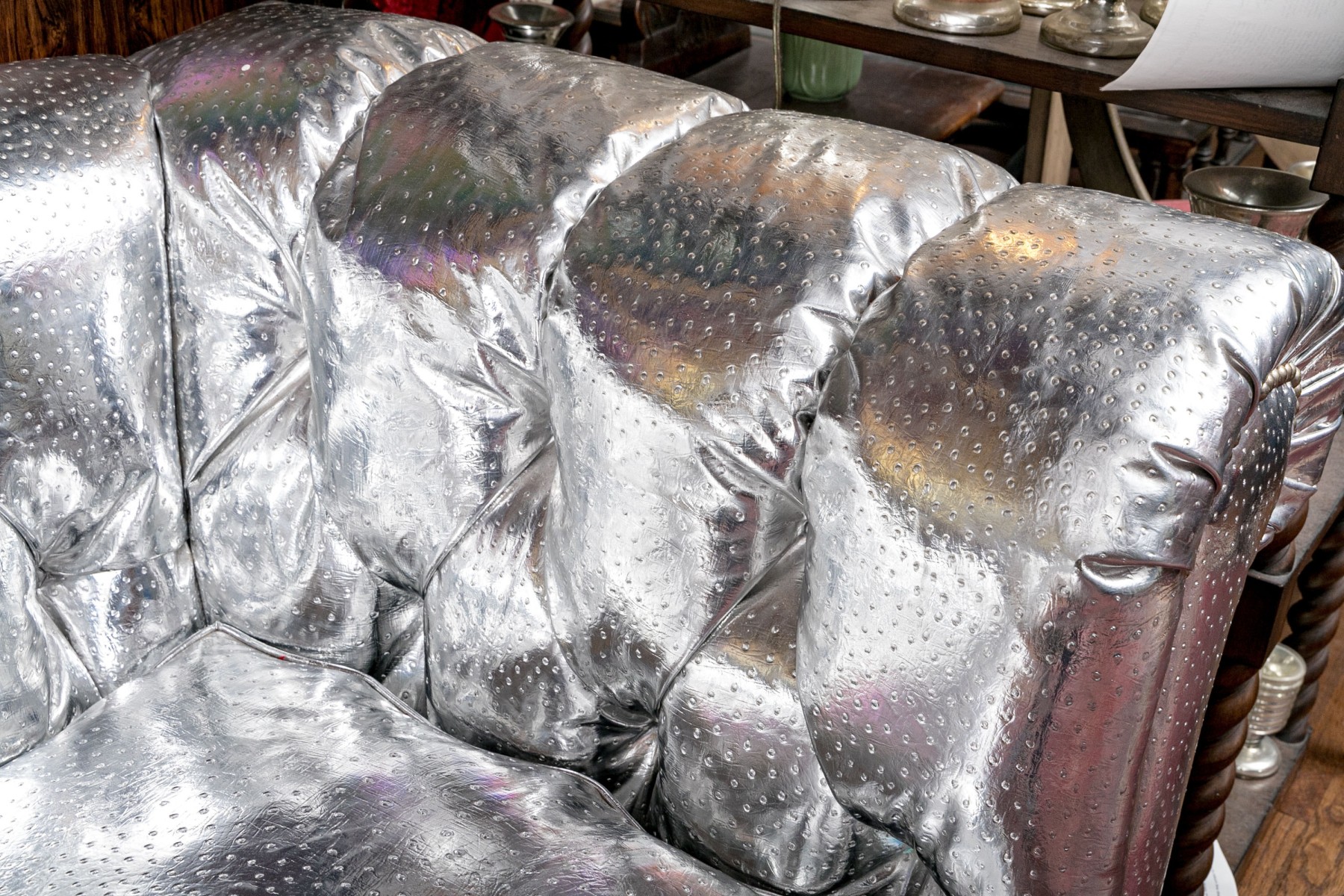 A stunning and very stylish sofa with classic Chesterfield influence modernized by silvery mylar-like upholstery with stippled relief creating a faux leather texture. The sofa features rolled arms and a long, flush height back with button tufting throughout, fitted with two loose seat cushions and detailed with nailhead trims. Finished with a straight apron and skirt concealing the legs beneath.