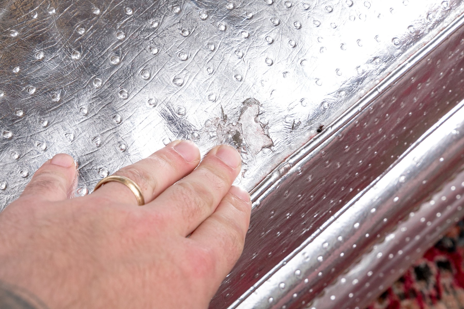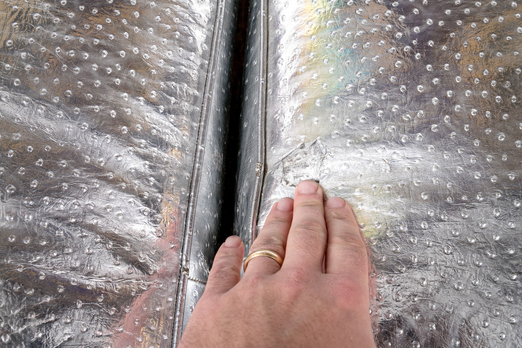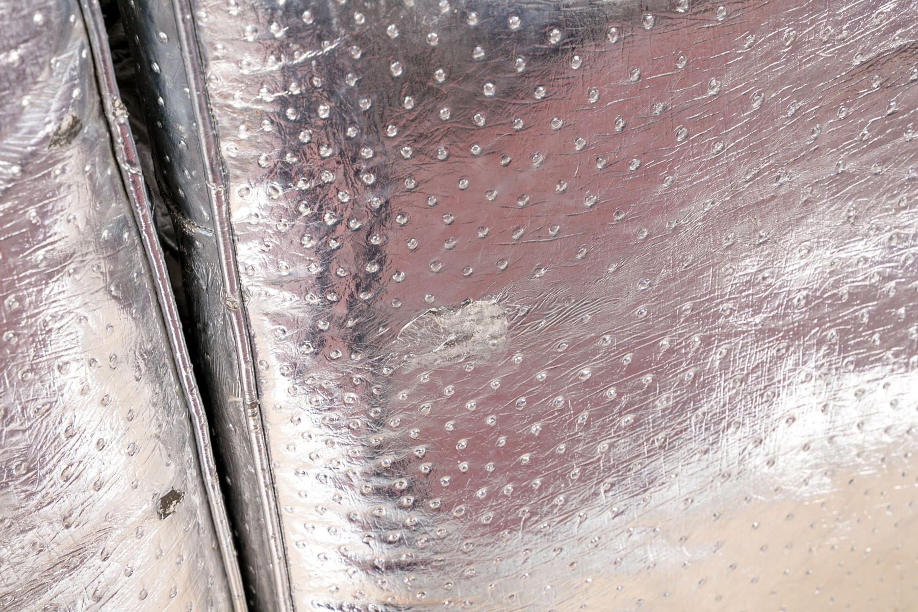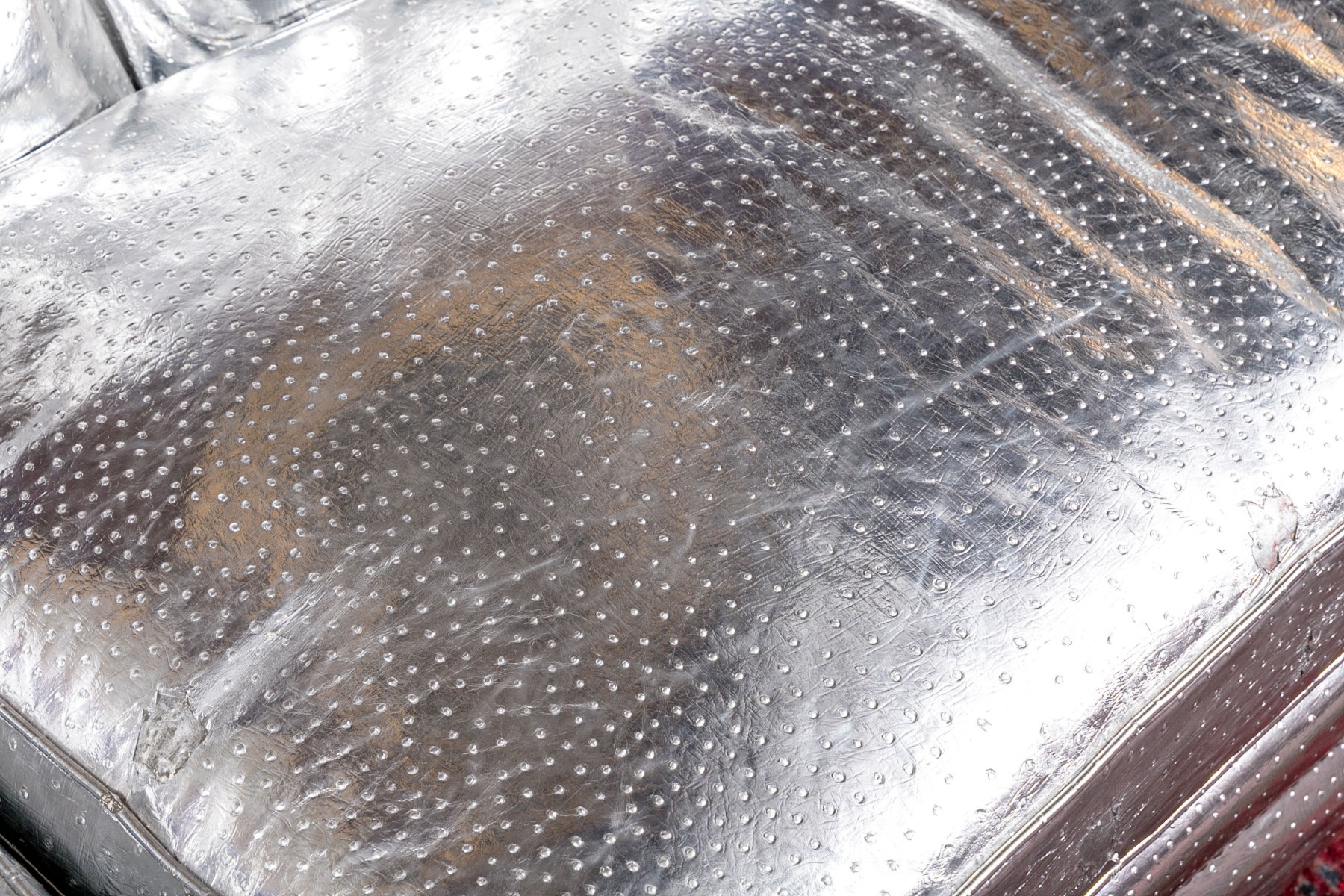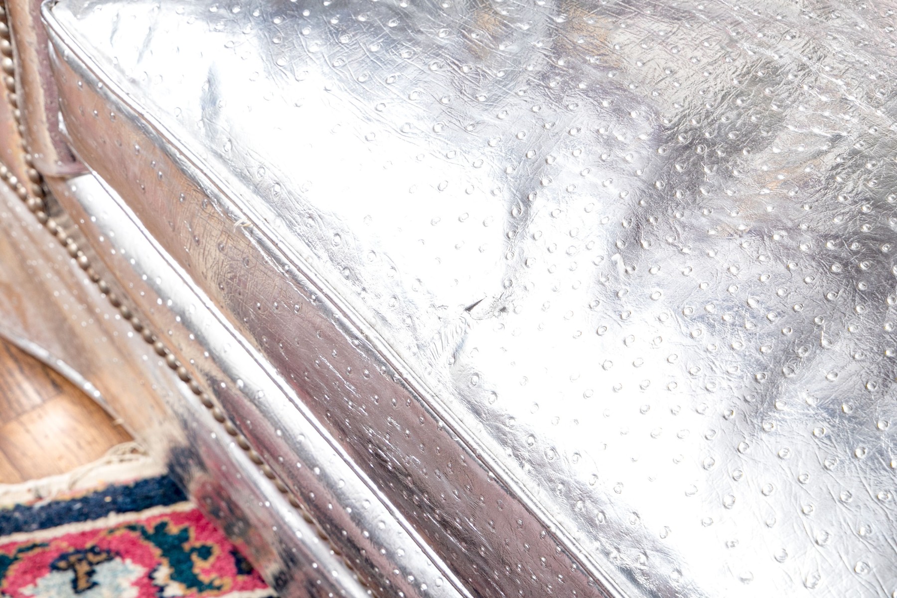 A stunning and very stylish sofa with classic Chesterfield influence modernized by silvery mylar-like upholstery with stippled relief creating a faux leather texture. The sofa features rolled arms and a long, flush height back with button tufting throughout, fitted with two loose seat cushions and detailed with nailhead trims. Finished with a straight apron and skirt concealing the legs beneath.