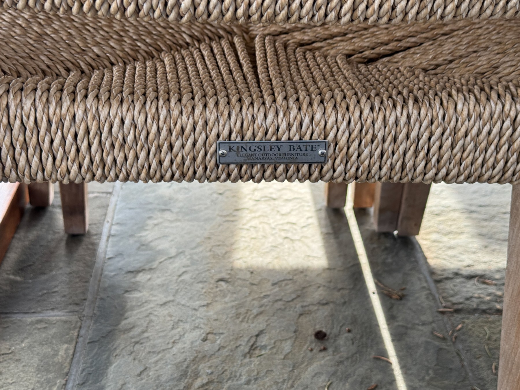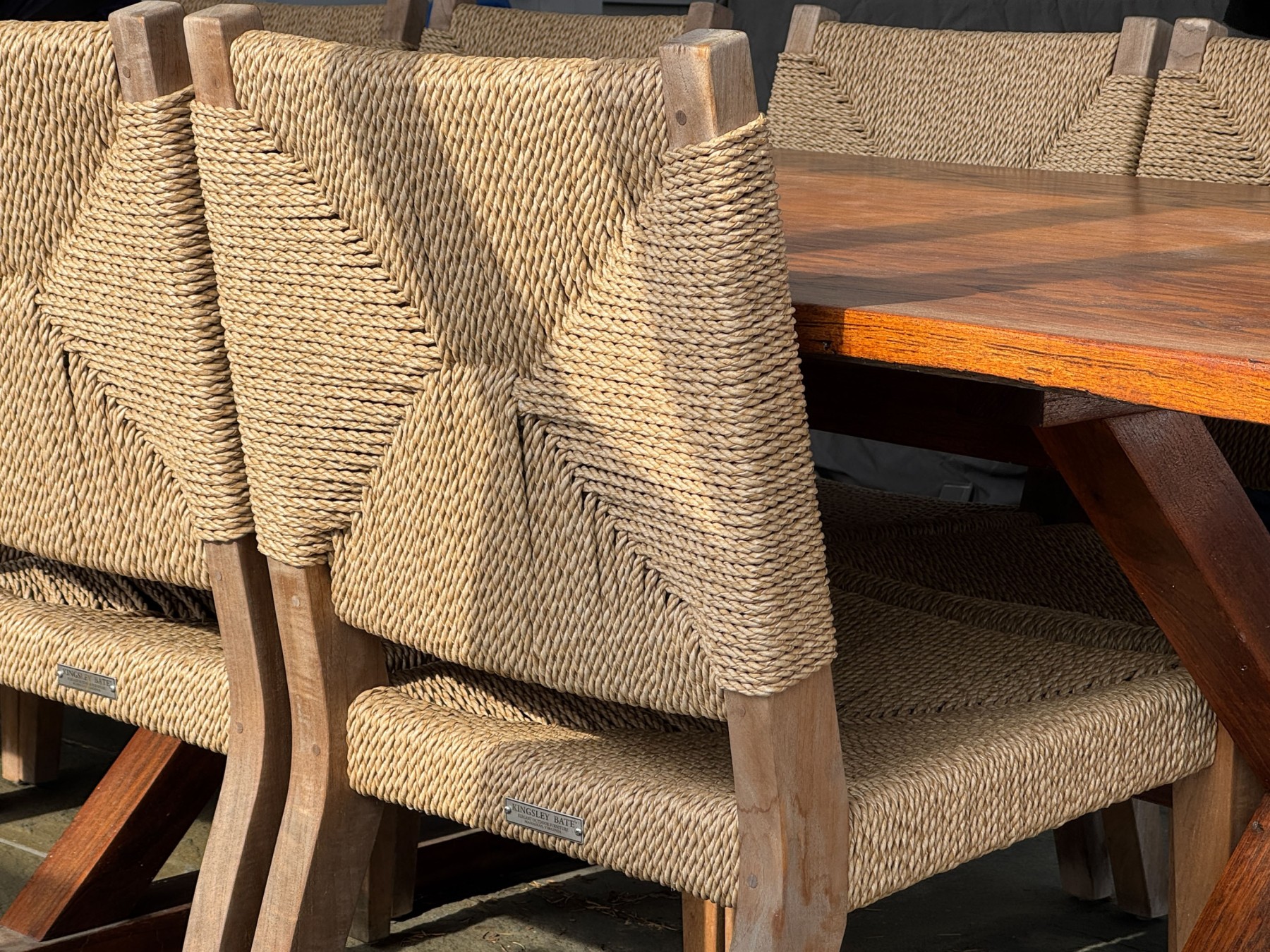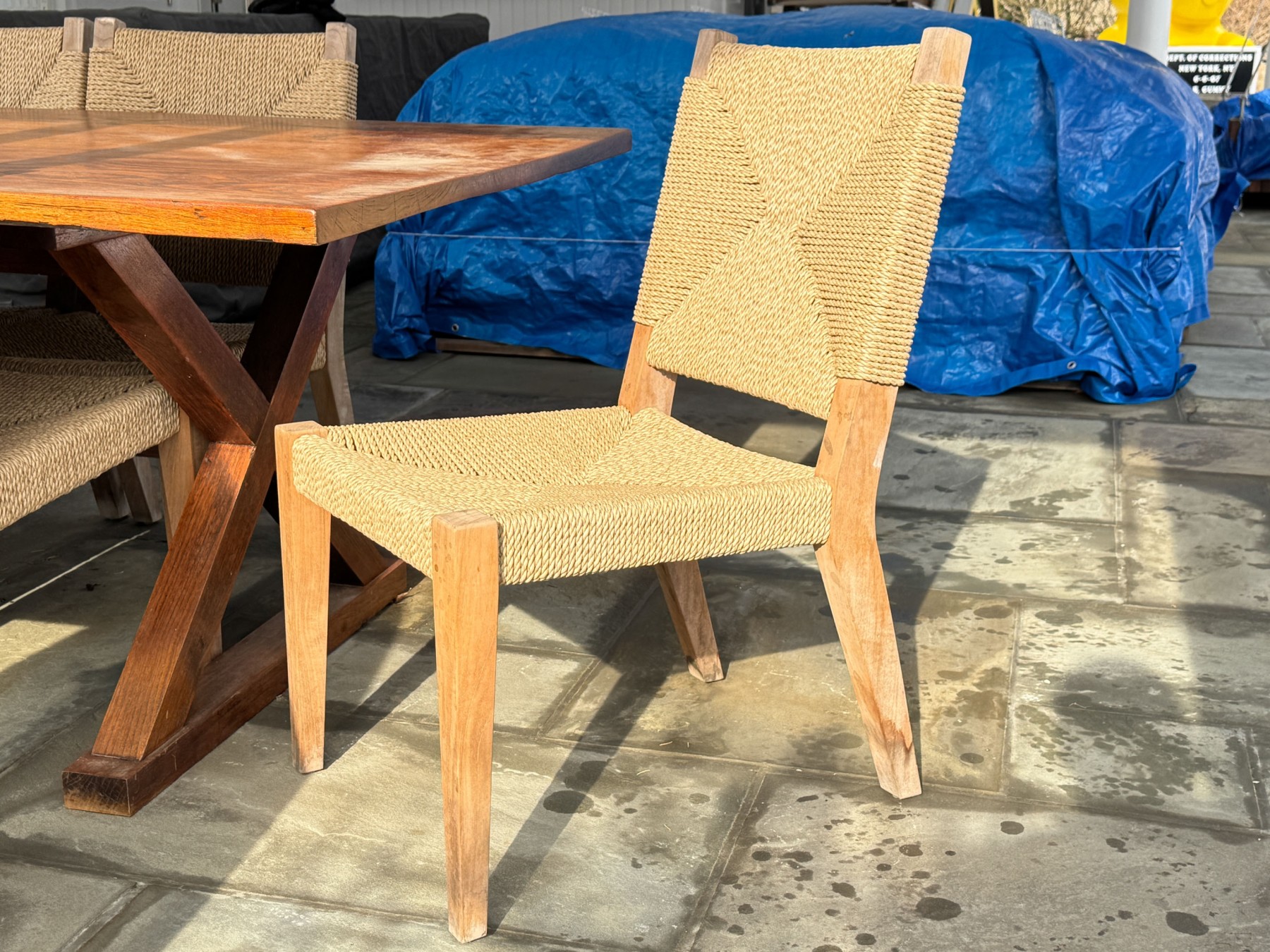 The table is accompanied by ten Kingsley Bate "Hadley" side chairs showcasing light brown teak frames and woven rope backs and seats for a timeless, refreshing and naturalistic aesthetic.