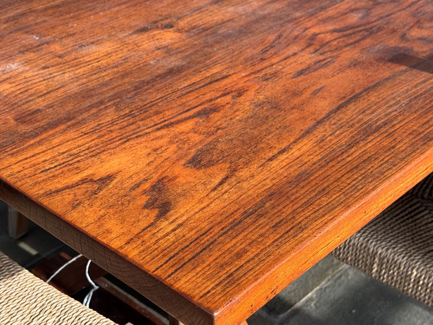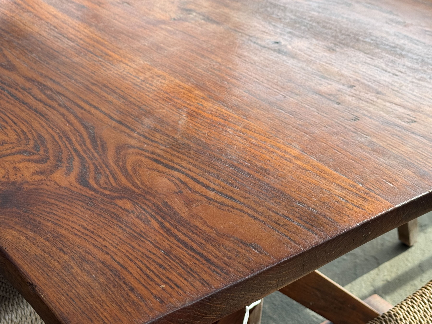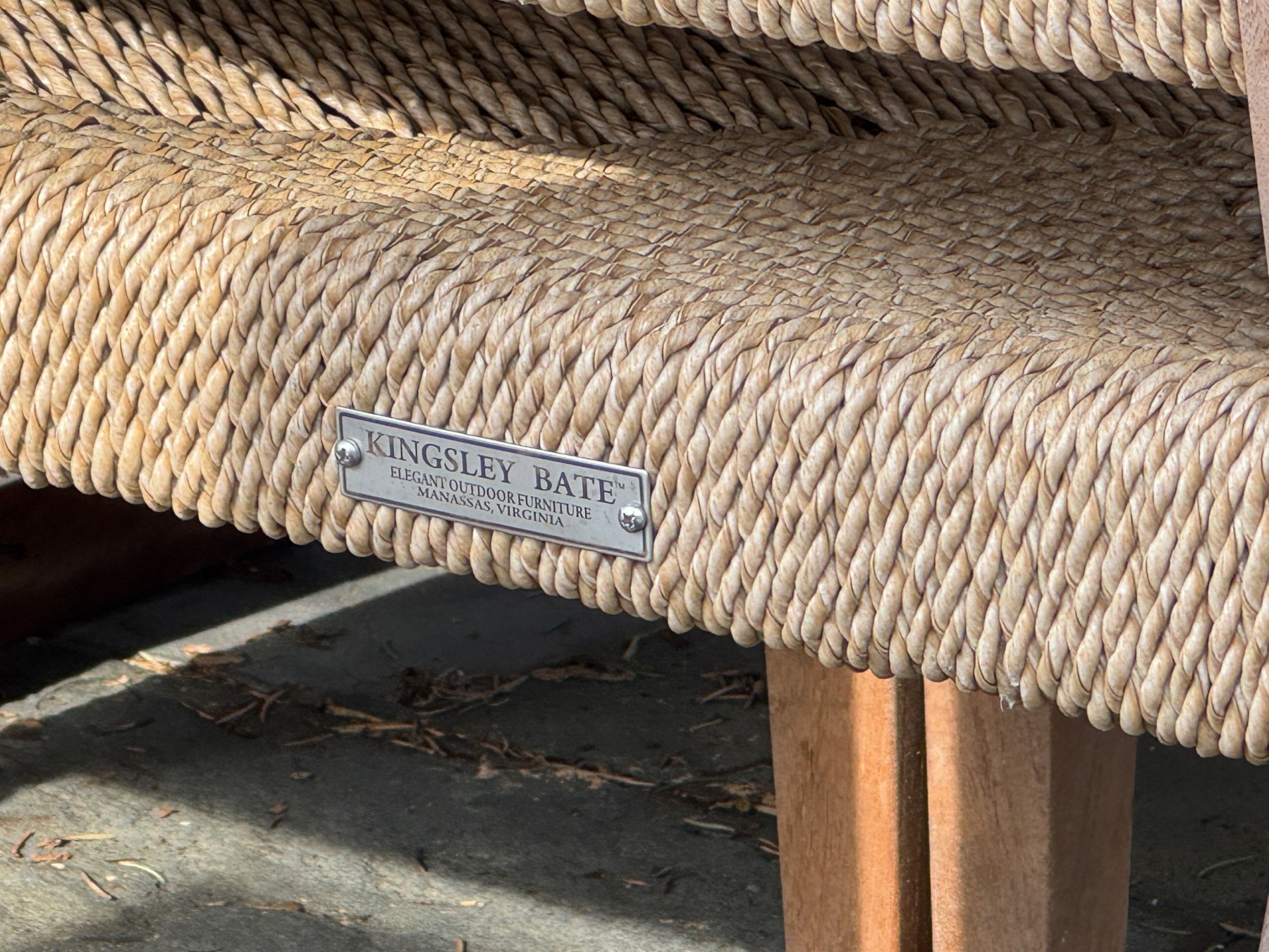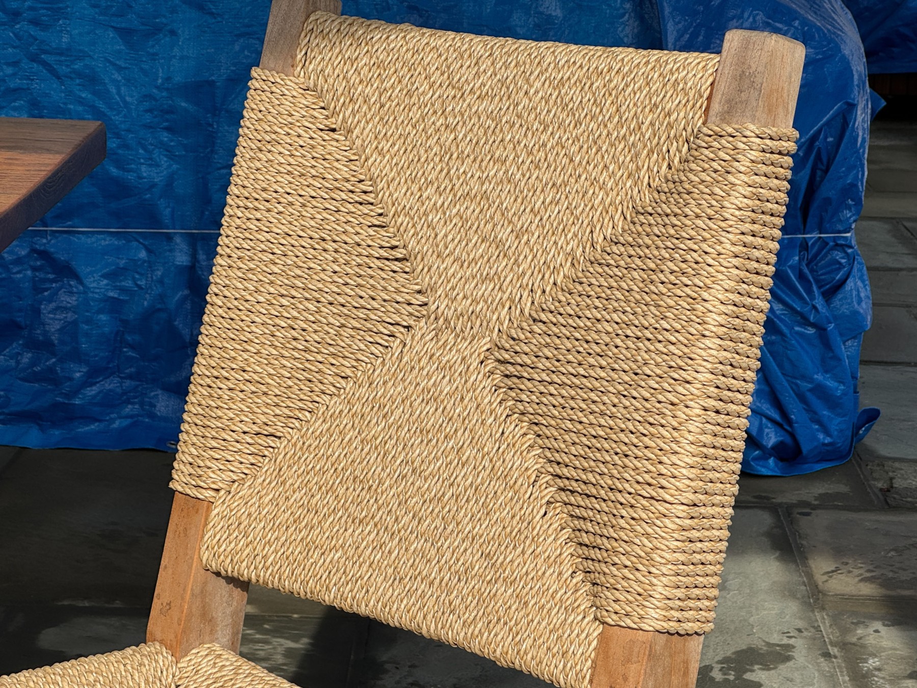 The table is accompanied by ten Kingsley Bate "Hadley" side chairs showcasing light brown teak frames and woven rope backs and seats for a timeless, refreshing and naturalistic aesthetic.