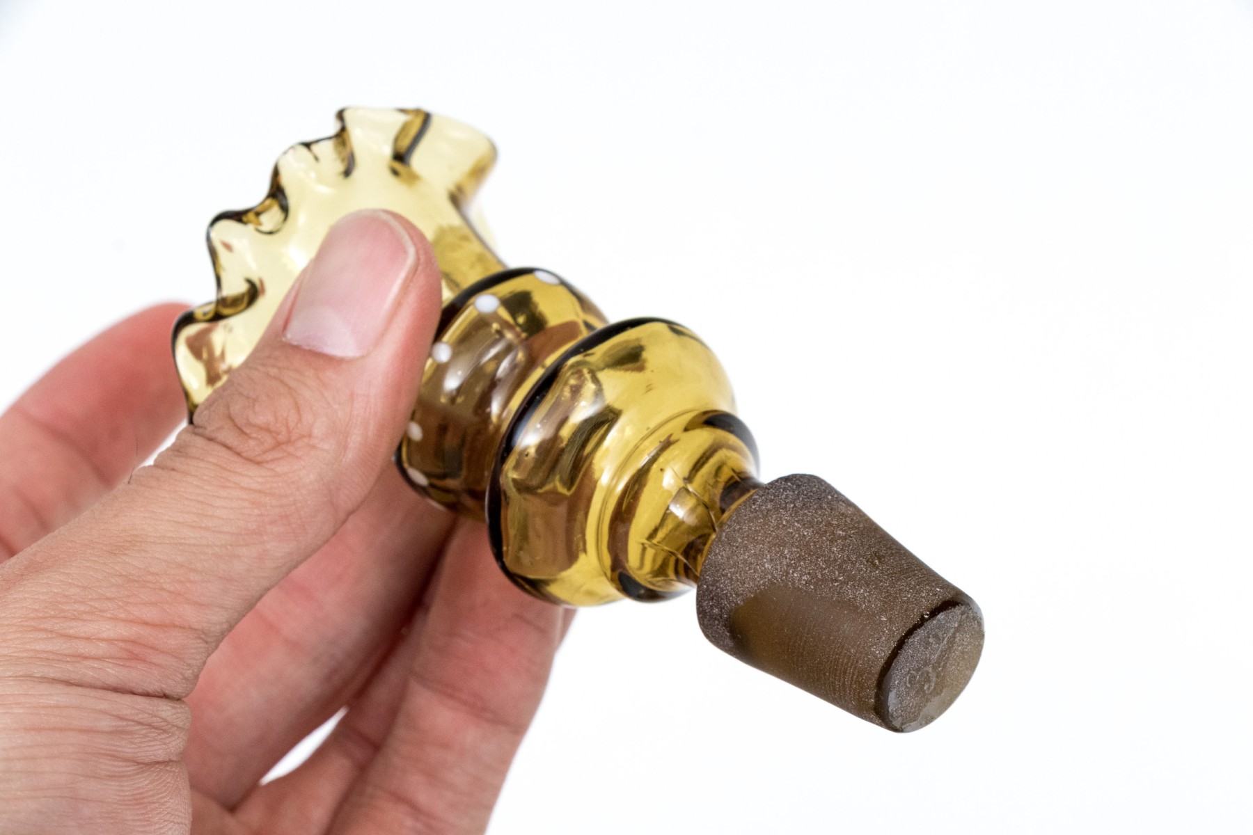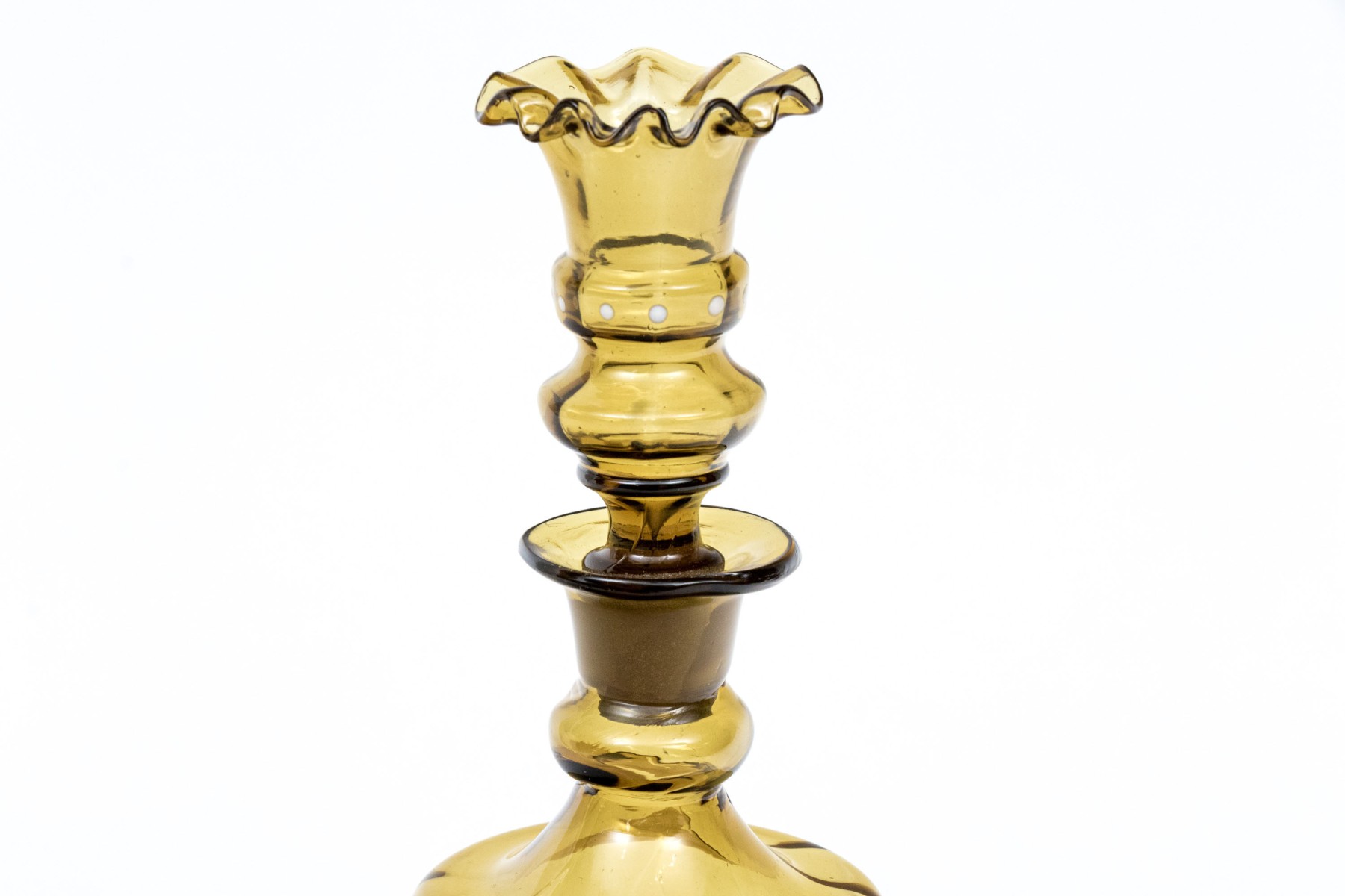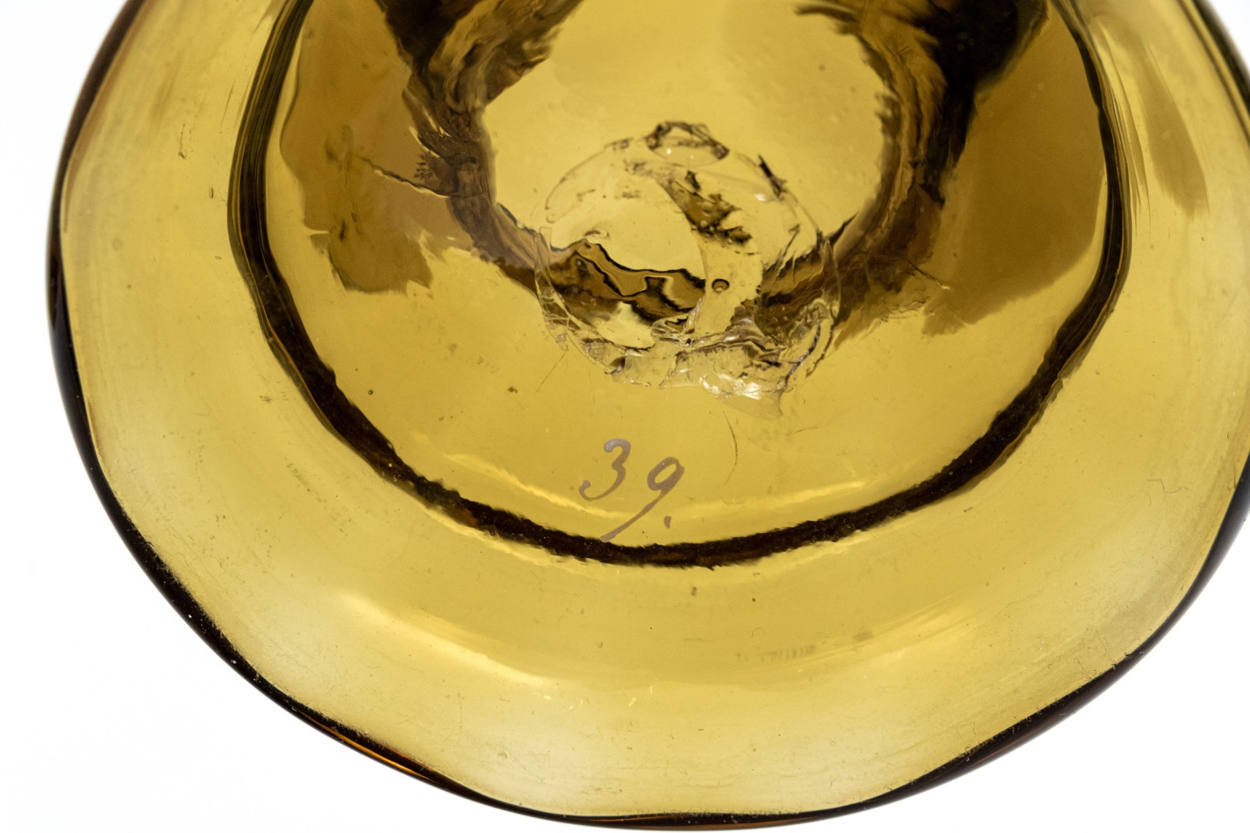 Raised on a circular foot the olive tone glass decanter has a stopper with ruffled form.