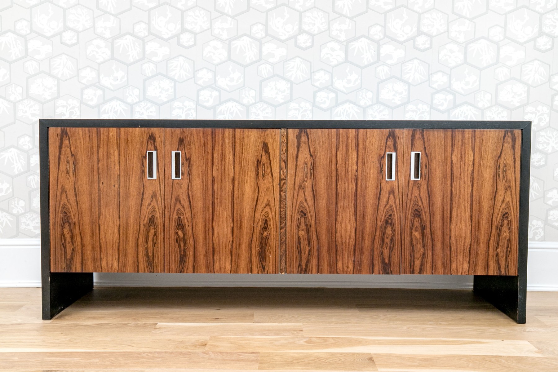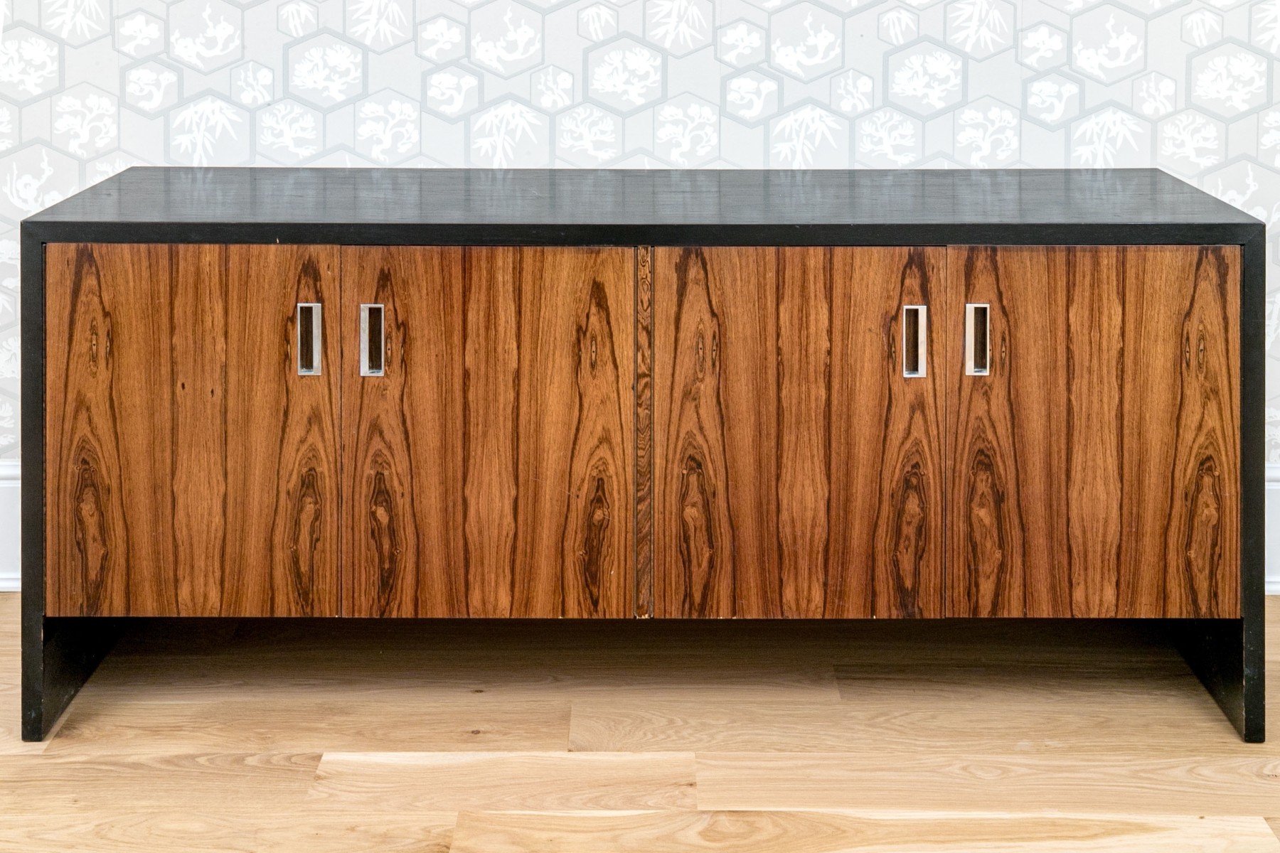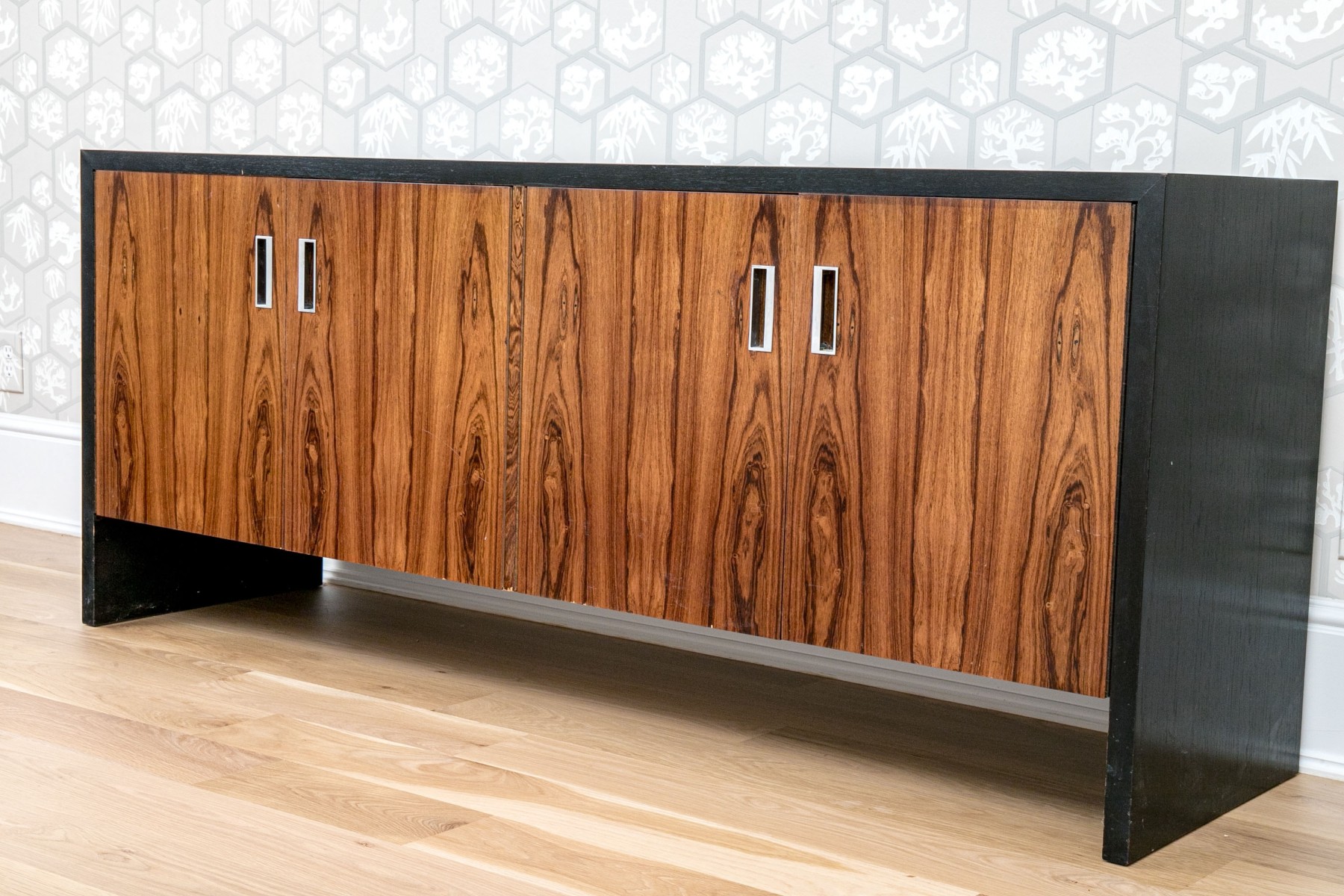 A fantastic vintage mid-century modern buffet with a touch of brutalist flare, possibly John Stuart or John Widdicomb. On two ends the black finished outer walls and table top is fitted with two pairs of figured veneered cabinet doors. The space on the left opens to an interior shelf.