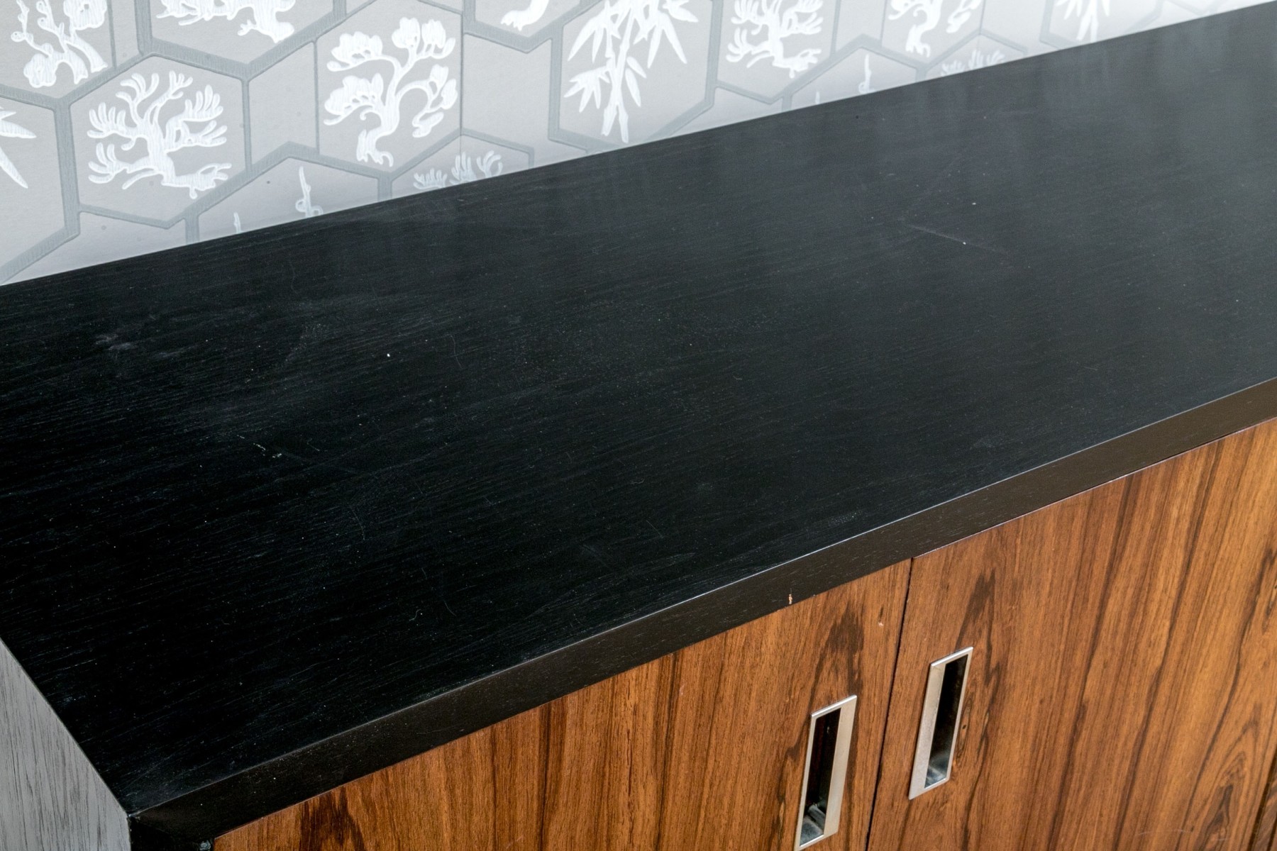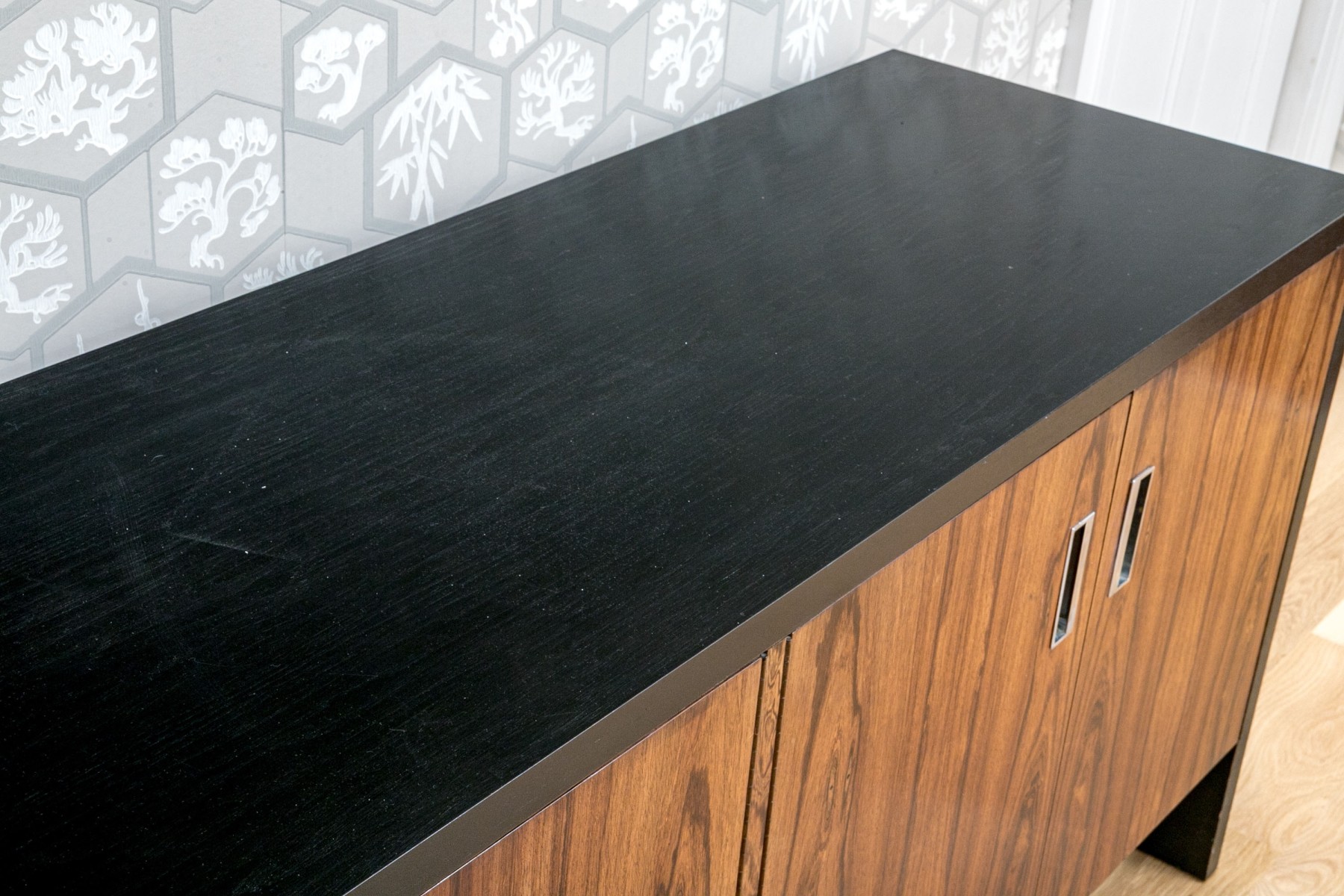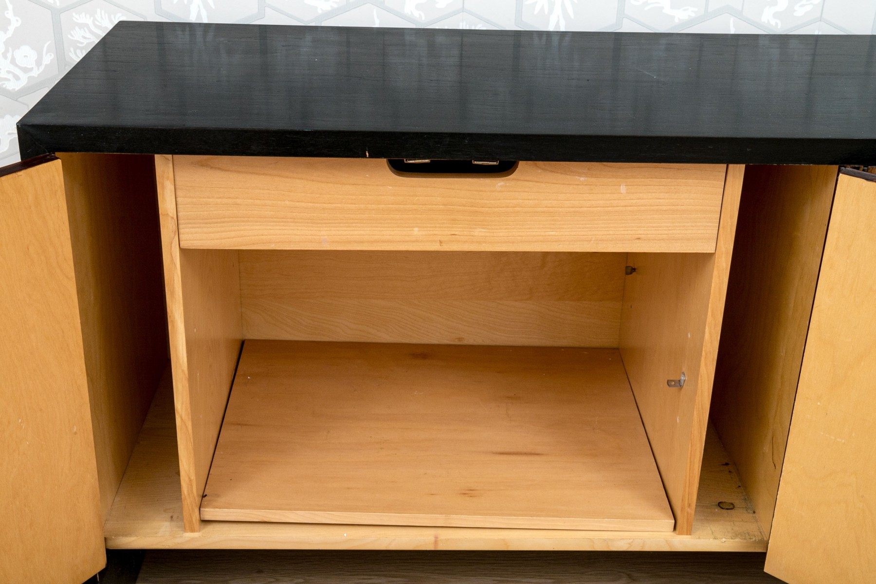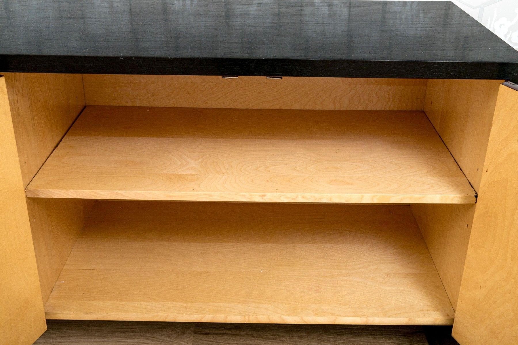 A fantastic vintage mid-century modern buffet with a touch of brutalist flare, possibly John Stuart or John Widdicomb. On two ends the black finished outer walls and table top is fitted with two pairs of figured veneered cabinet doors. The space on the left opens to an interior shelf.