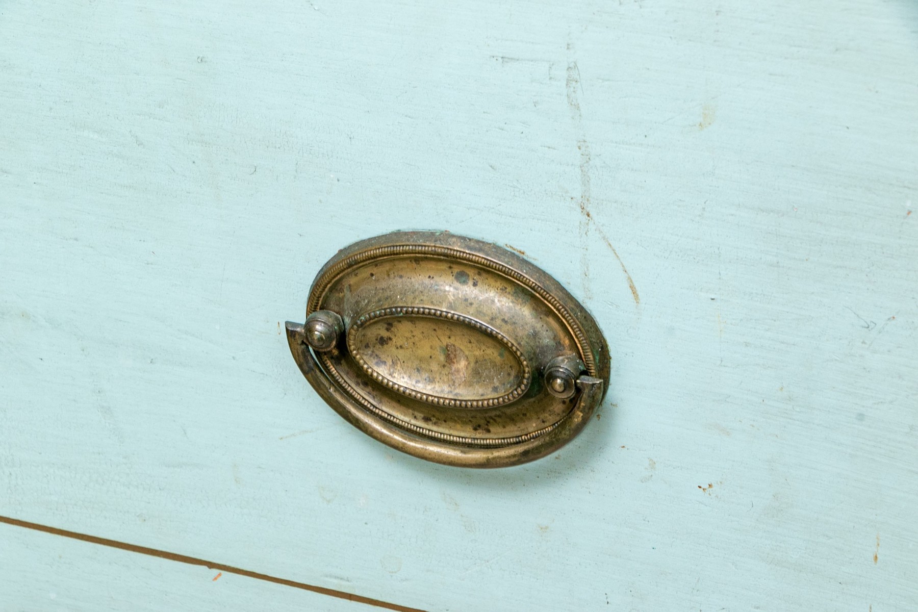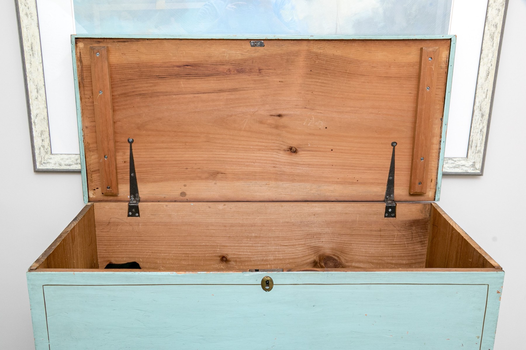 Condition: One of the brass handles is missing and should be replaced. Chips and wear commensurate with age and antiqued distress. Legs have a wobble likely weak and could be stabilized. Despite wear the chest is a handsome piece to incorporate into ones space.