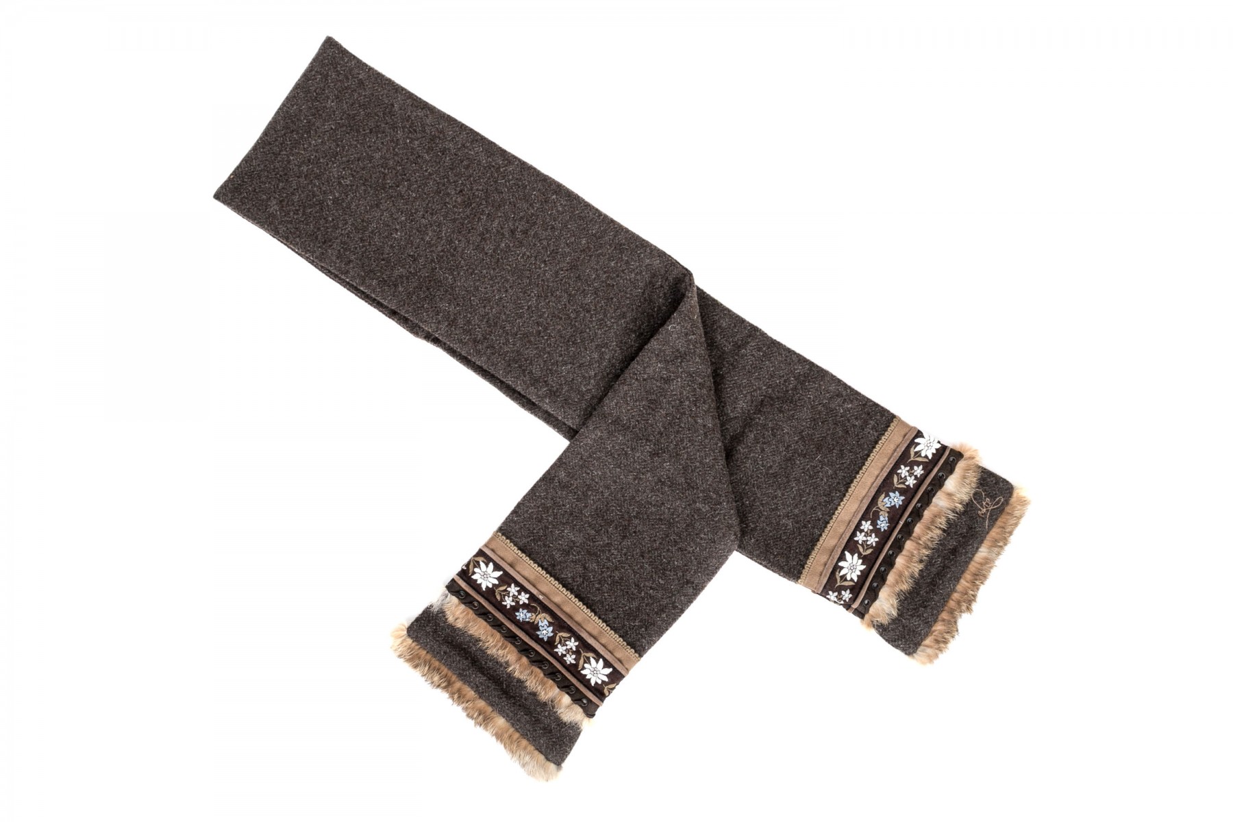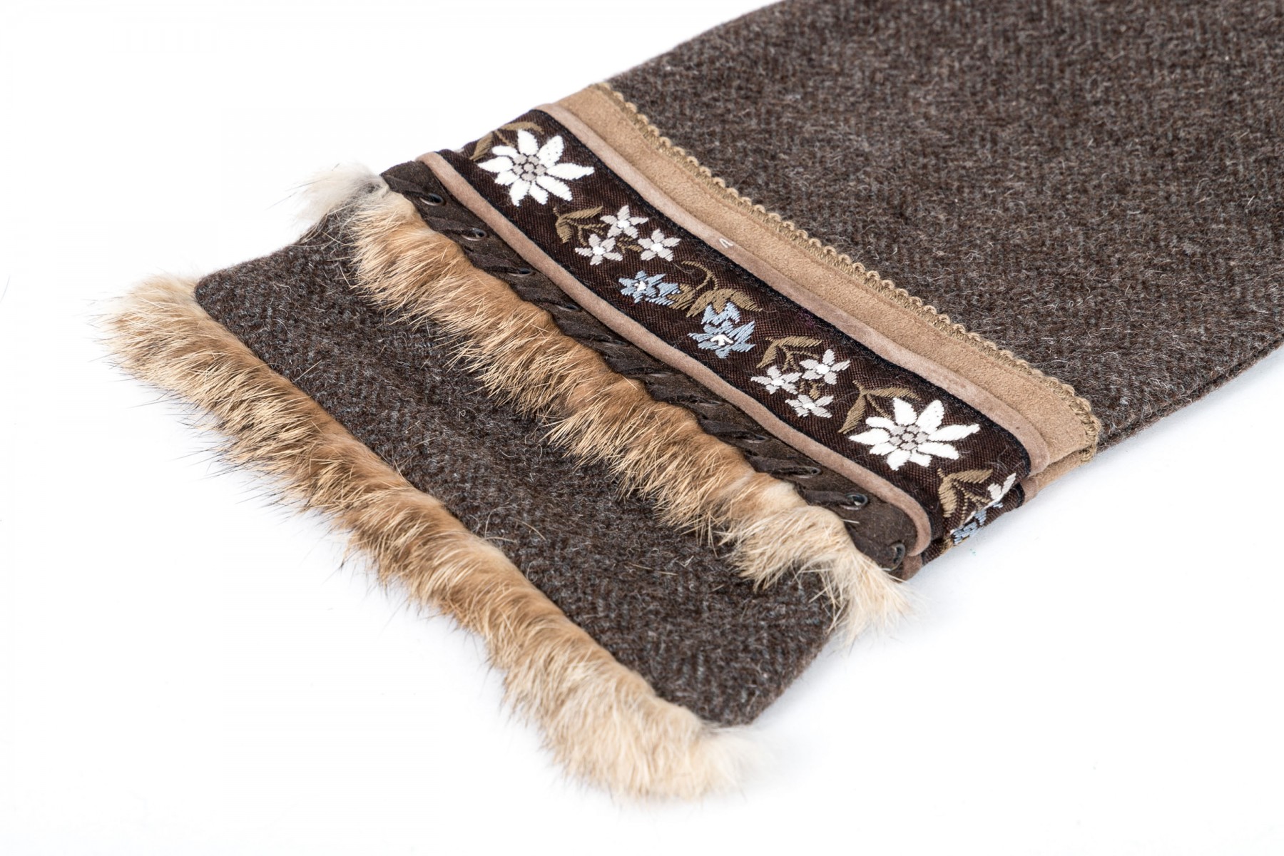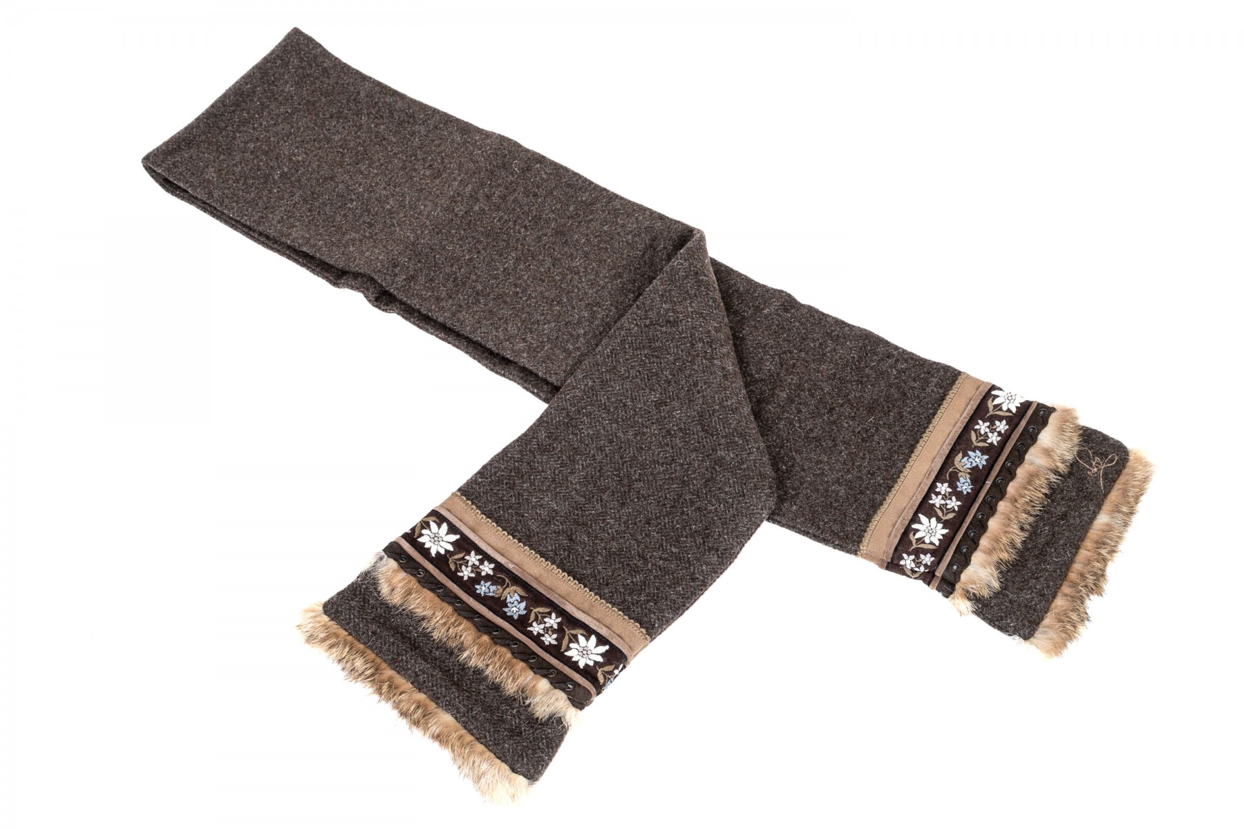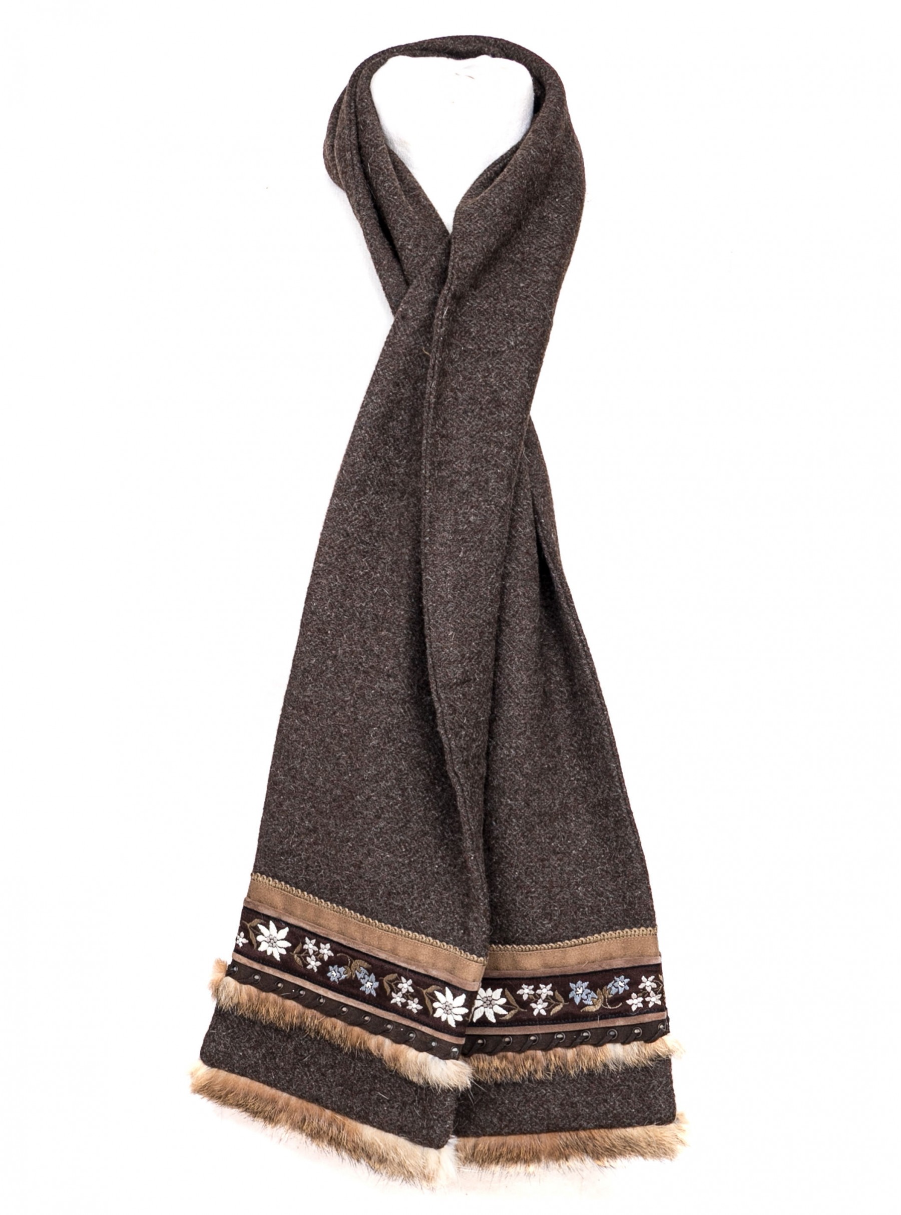 Fabulous vintage wool tweed scarf with fur and suede trim, flower motif decorations