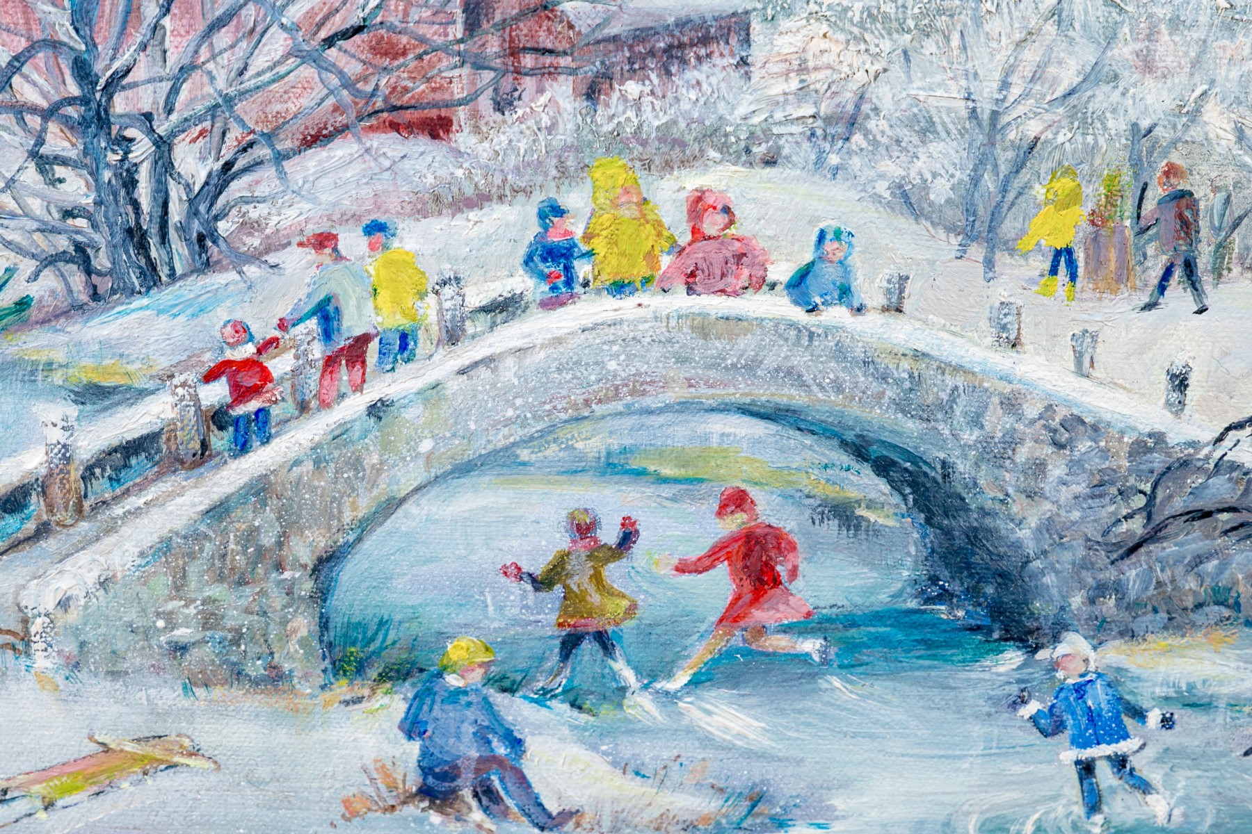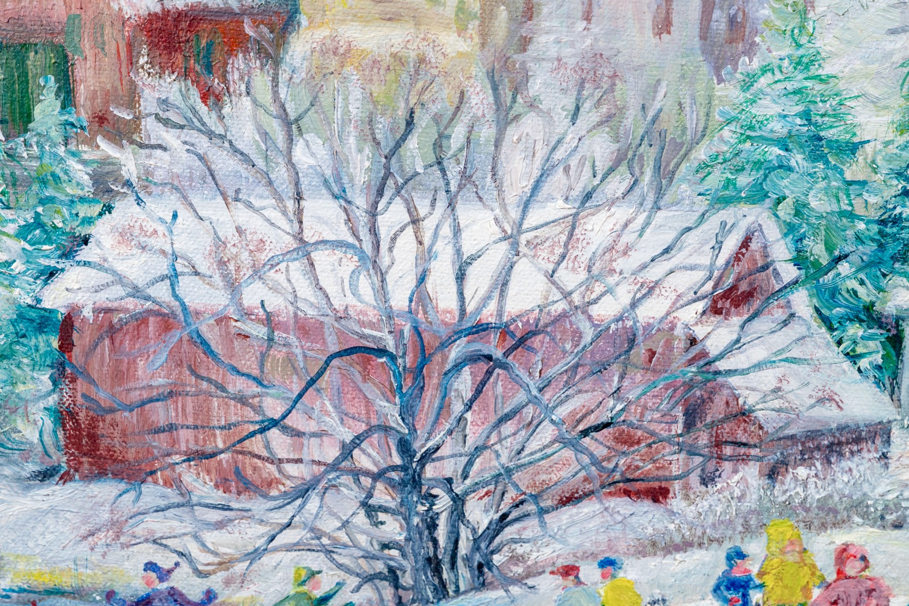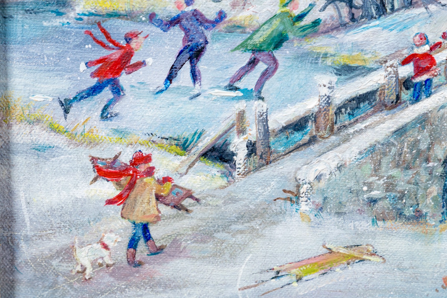 Filled with joy and people skating in a snowy landscape. Framed with a linen filet and a wooden beveled frame.