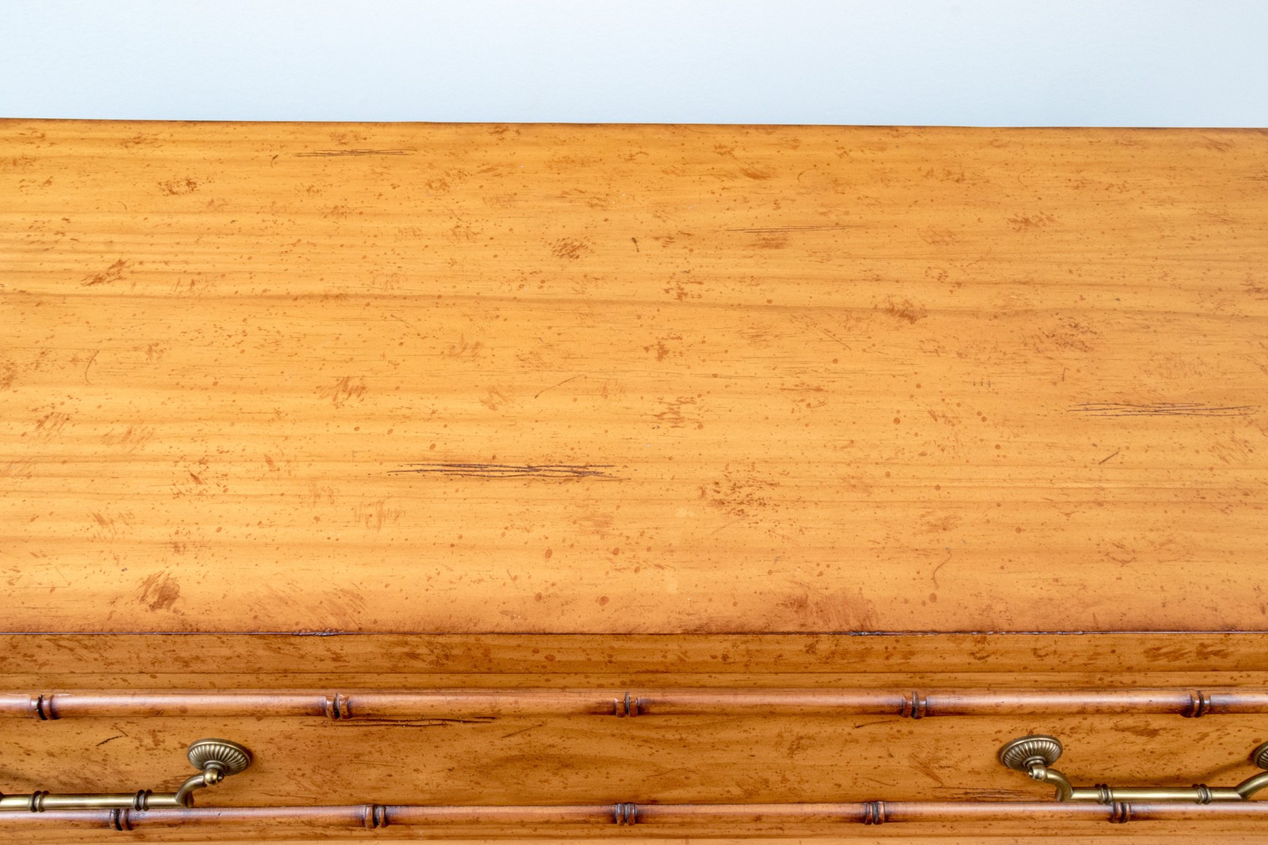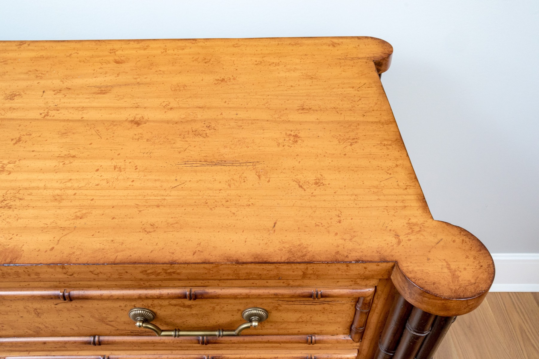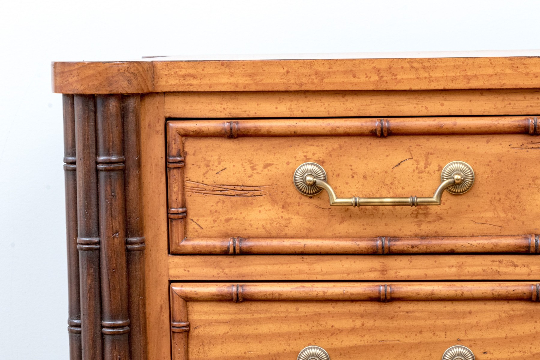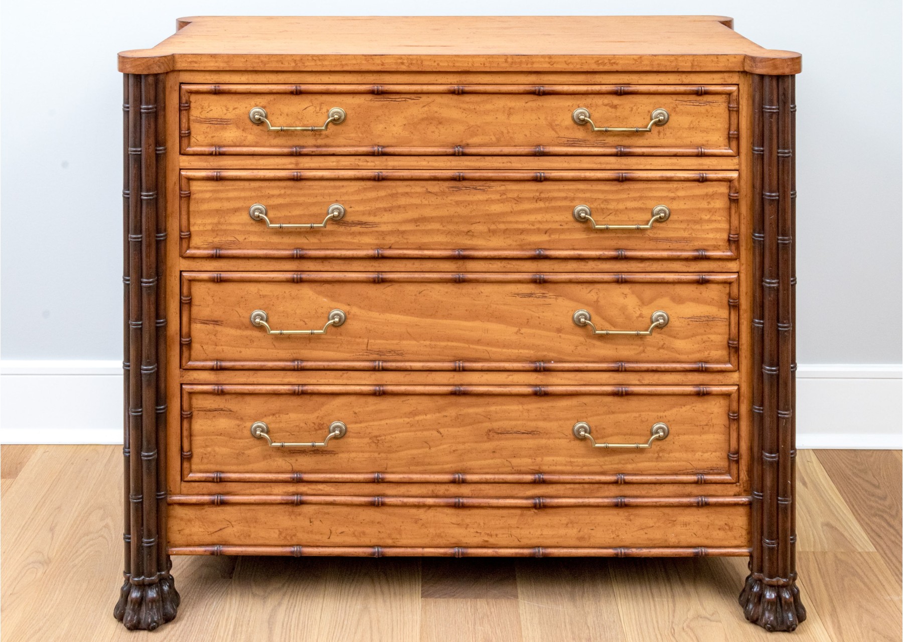 The case with four graduated drawers, all with faux bamboo moulded trims and brass faux bamboo form swing handles. The top is rectangular with rounded cookie corners.