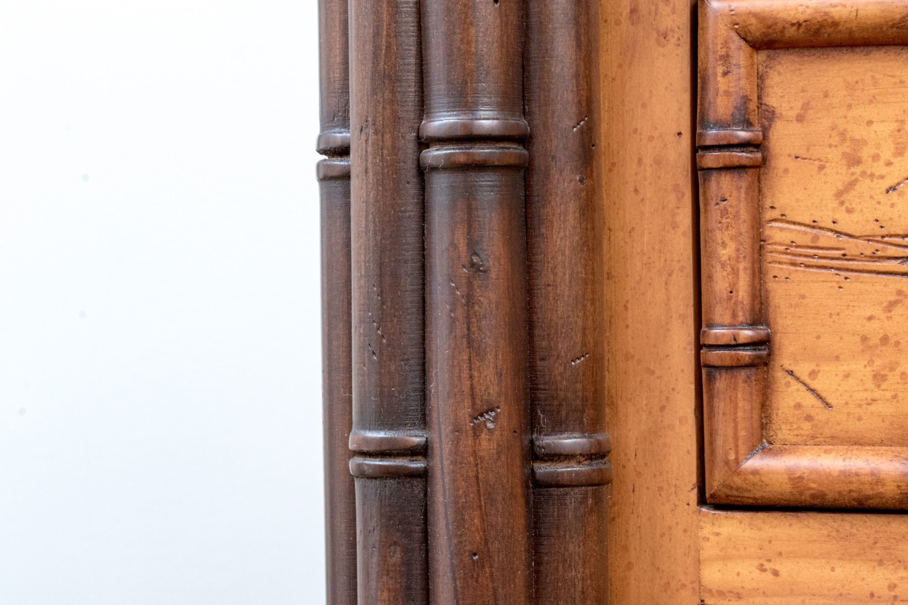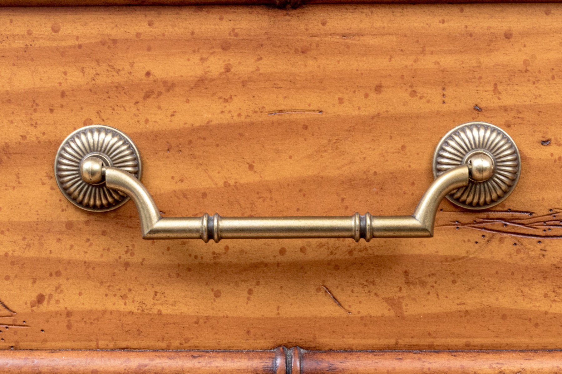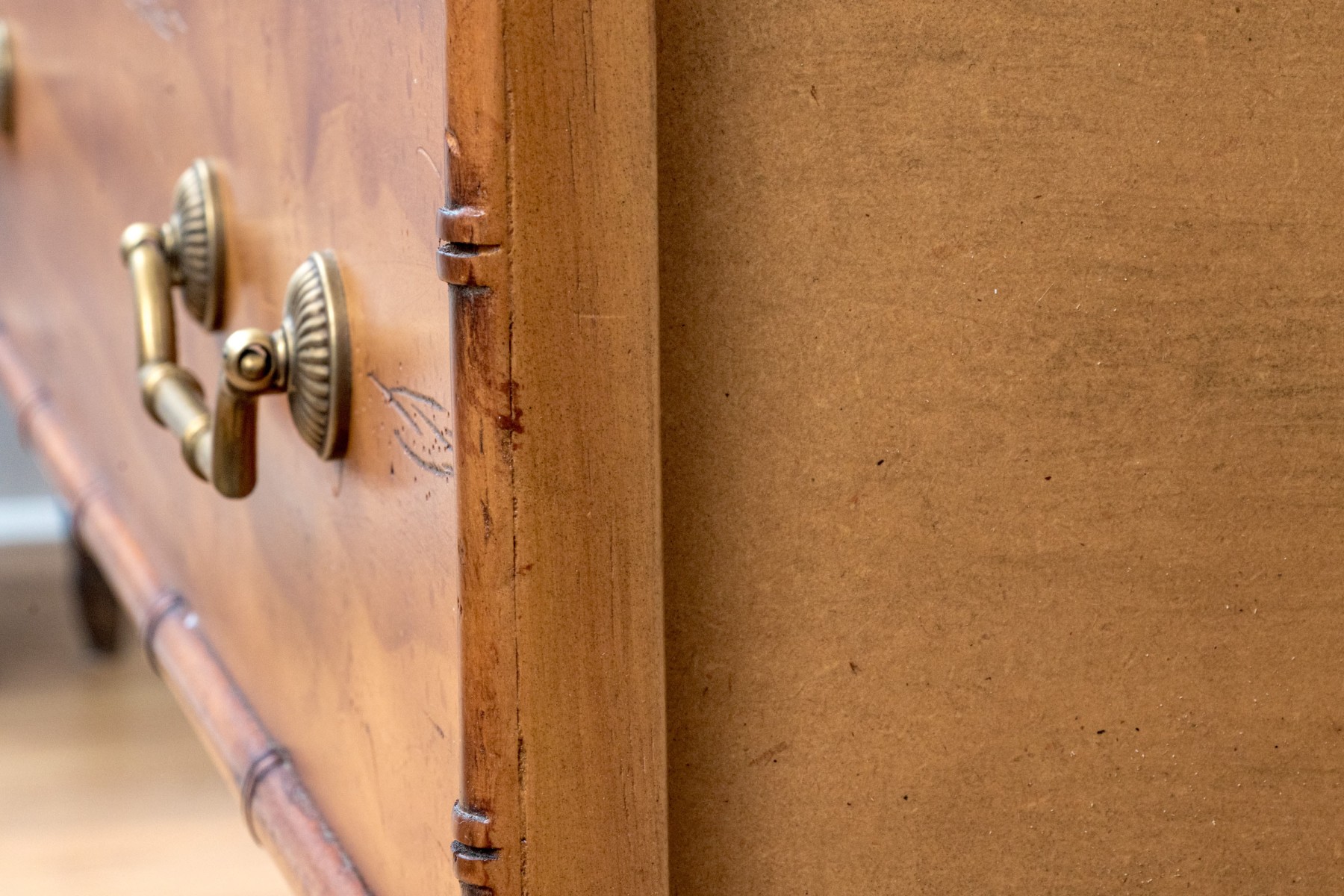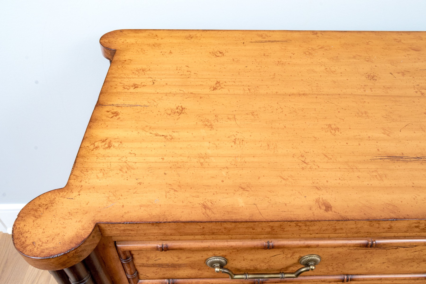 The case with four graduated drawers, all with faux bamboo moulded trims and brass faux bamboo form swing handles. The top is rectangular with rounded cookie corners.