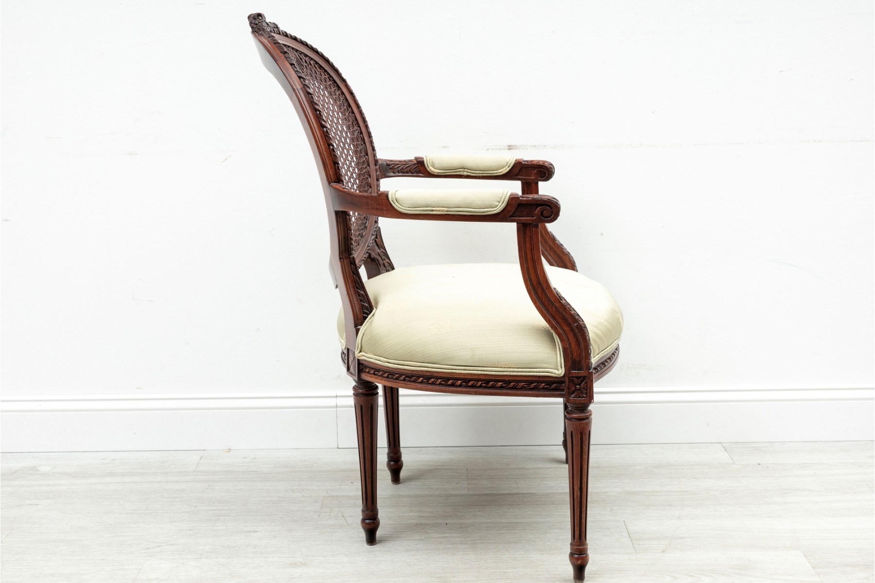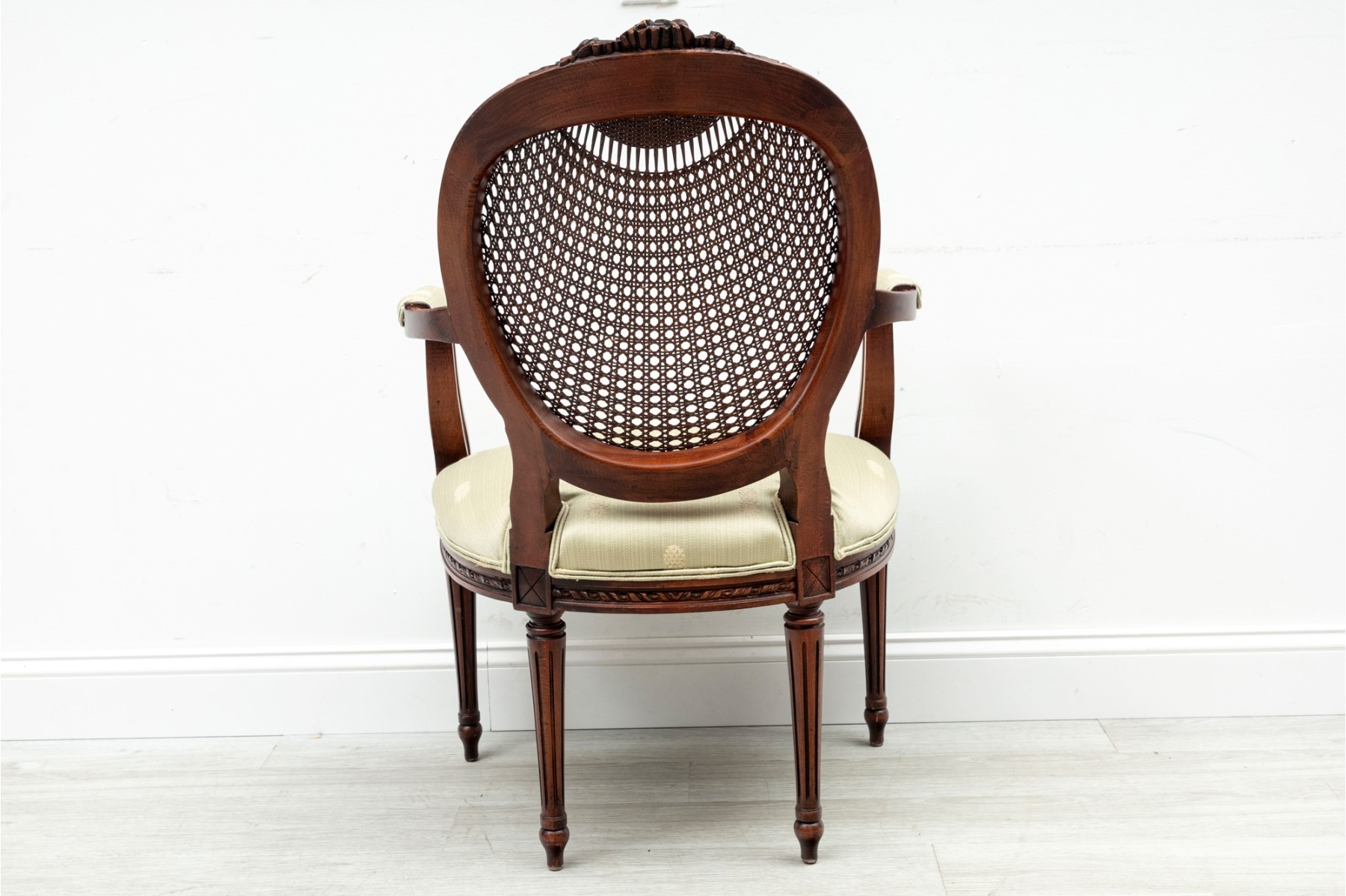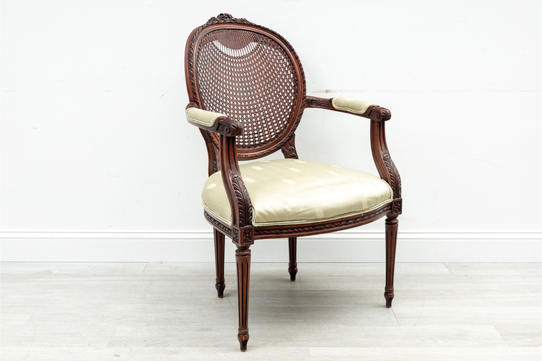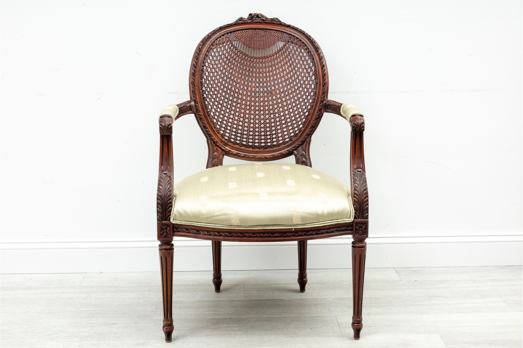 Upholstered in a rich light satin green fabric, the chair features a stylized cane backing that adds a touch of traditional charm. The carved wood frame, typical of Louis XVI style, includes delicate details and gracefully curved arms.