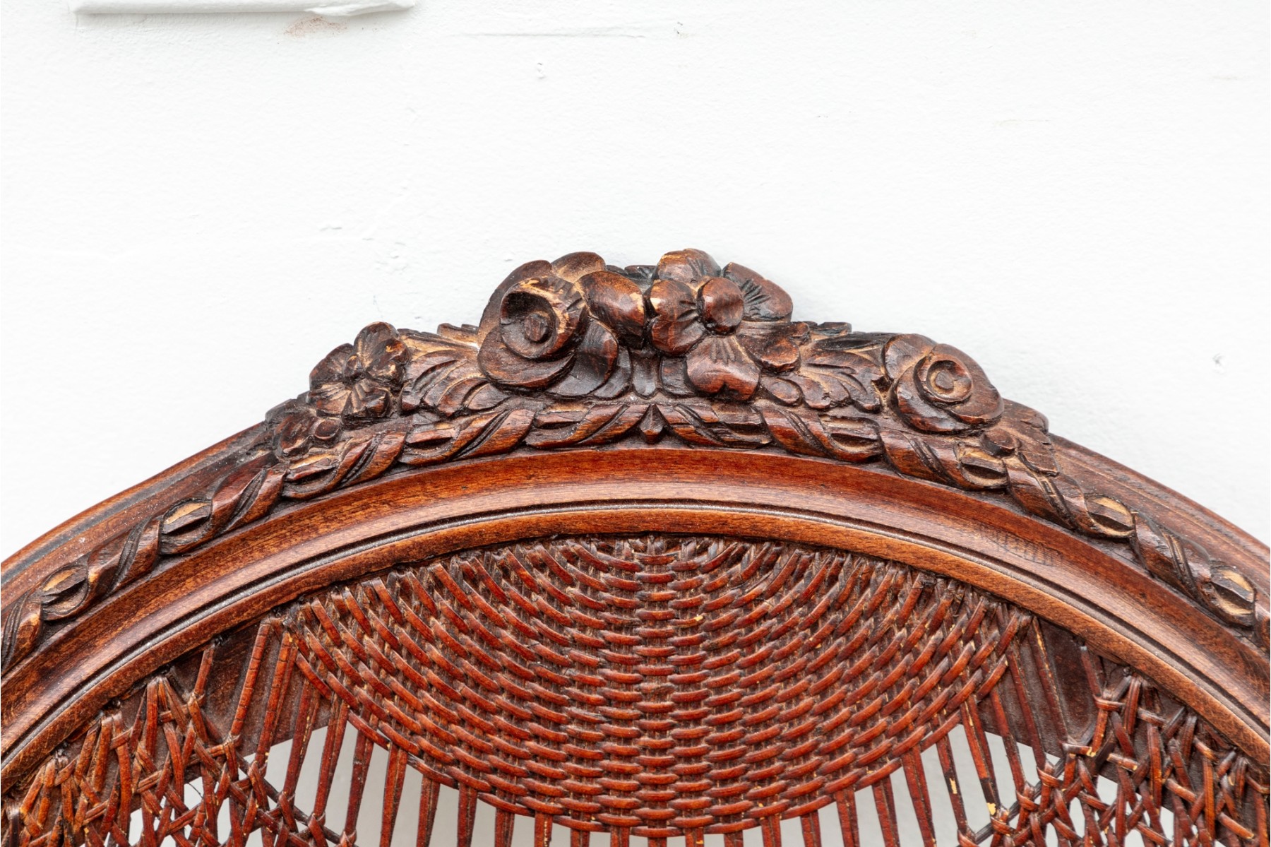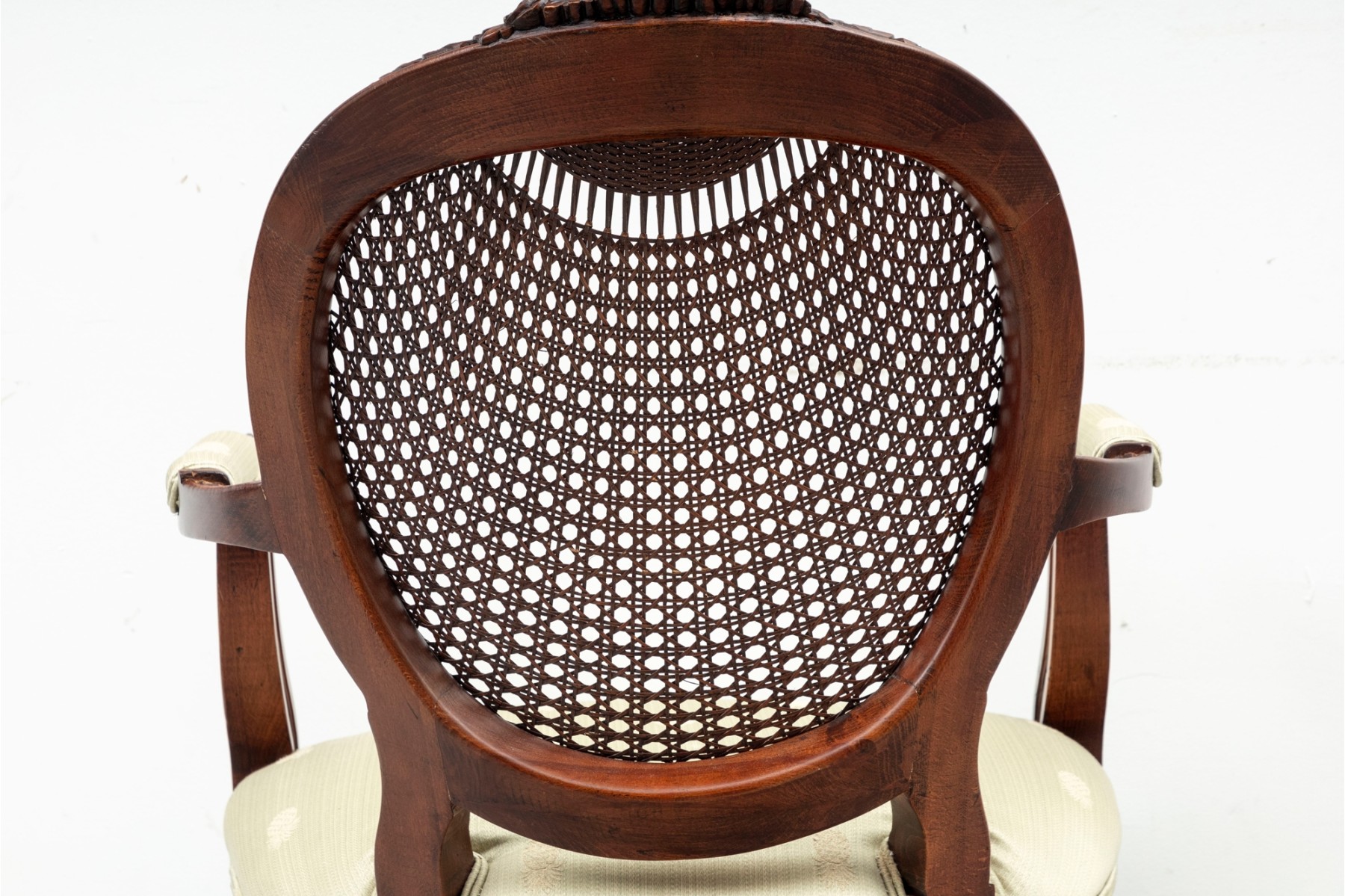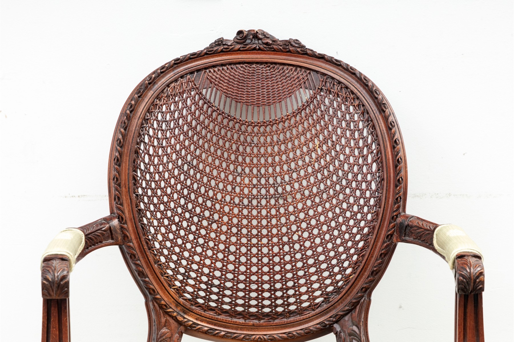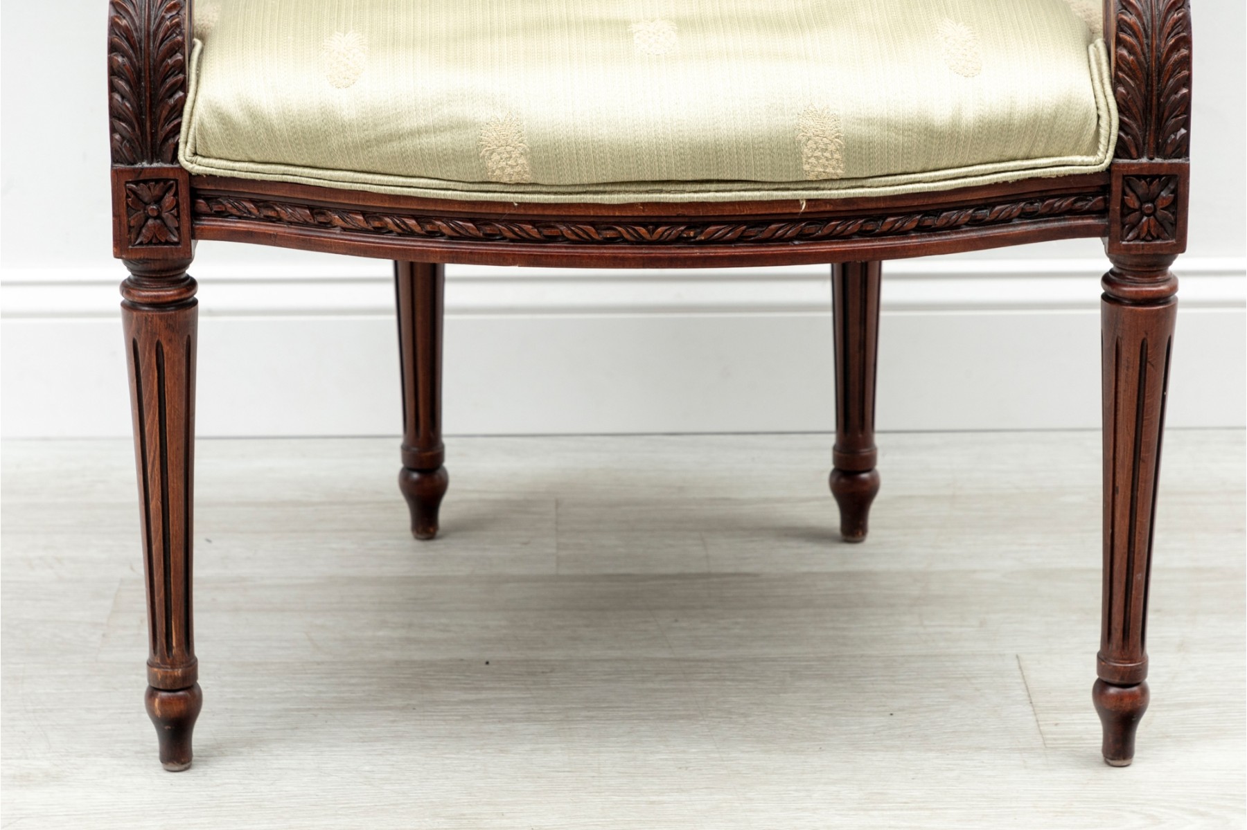 Upholstered in a rich light satin green fabric, the chair features a stylized cane backing that adds a touch of traditional charm. The carved wood frame, typical of Louis XVI style, includes delicate details and gracefully curved arms.