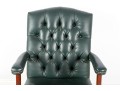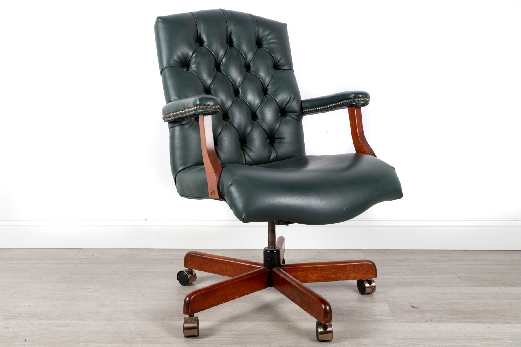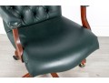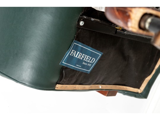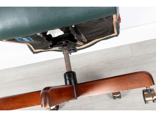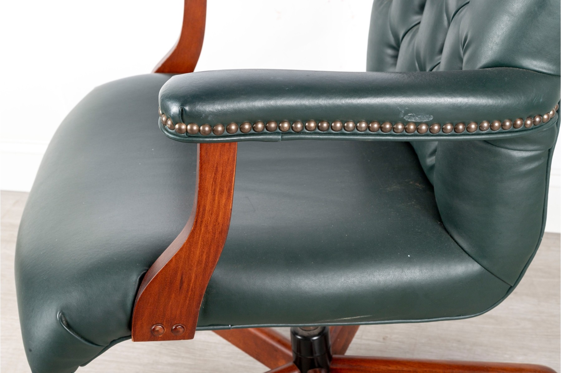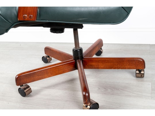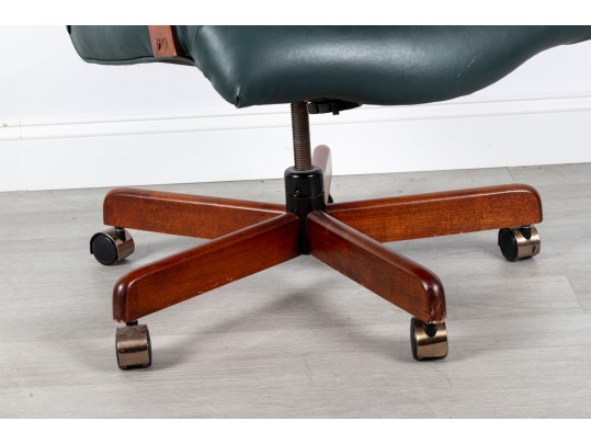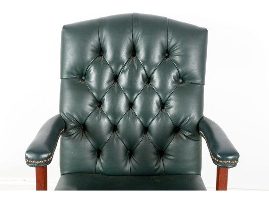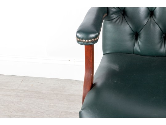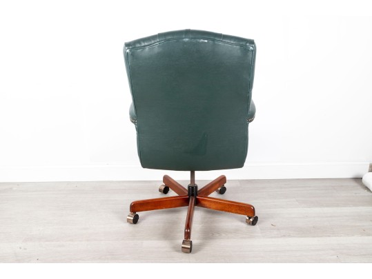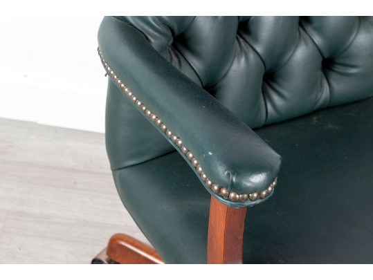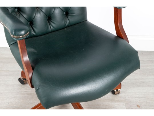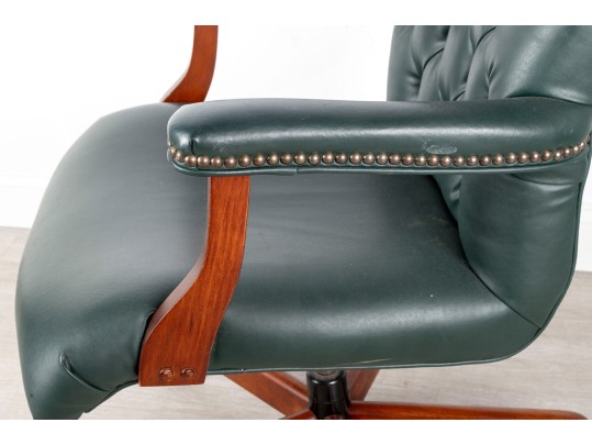A Fairfield Furniture green vinyl office chair featuring a classic design with a padded seat and backrest, button tufted and upholstered in green vinyl tacked with brass nailhead trim.