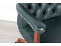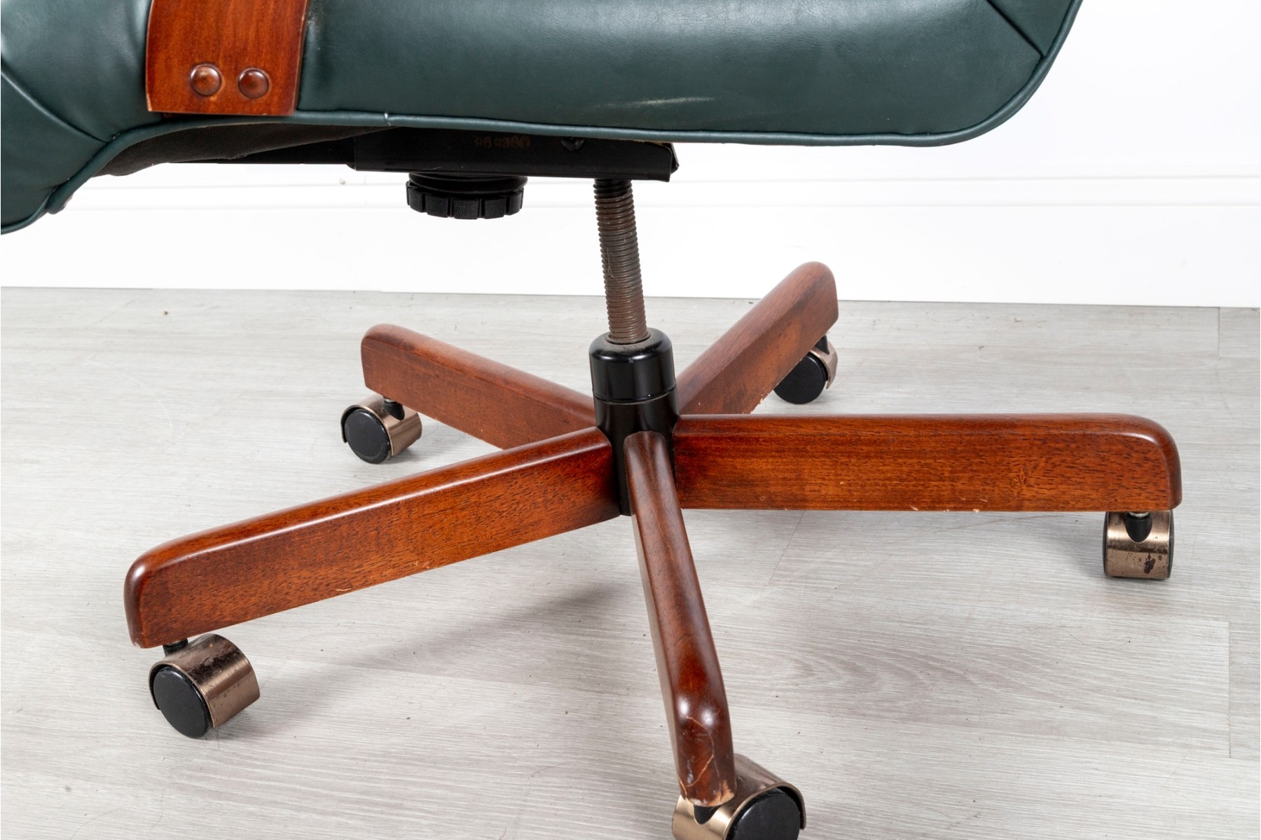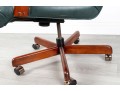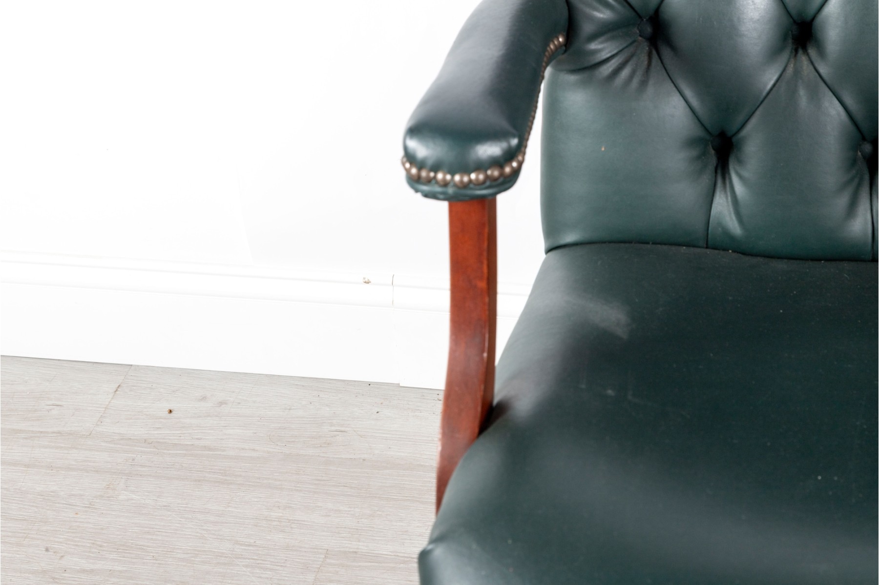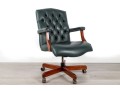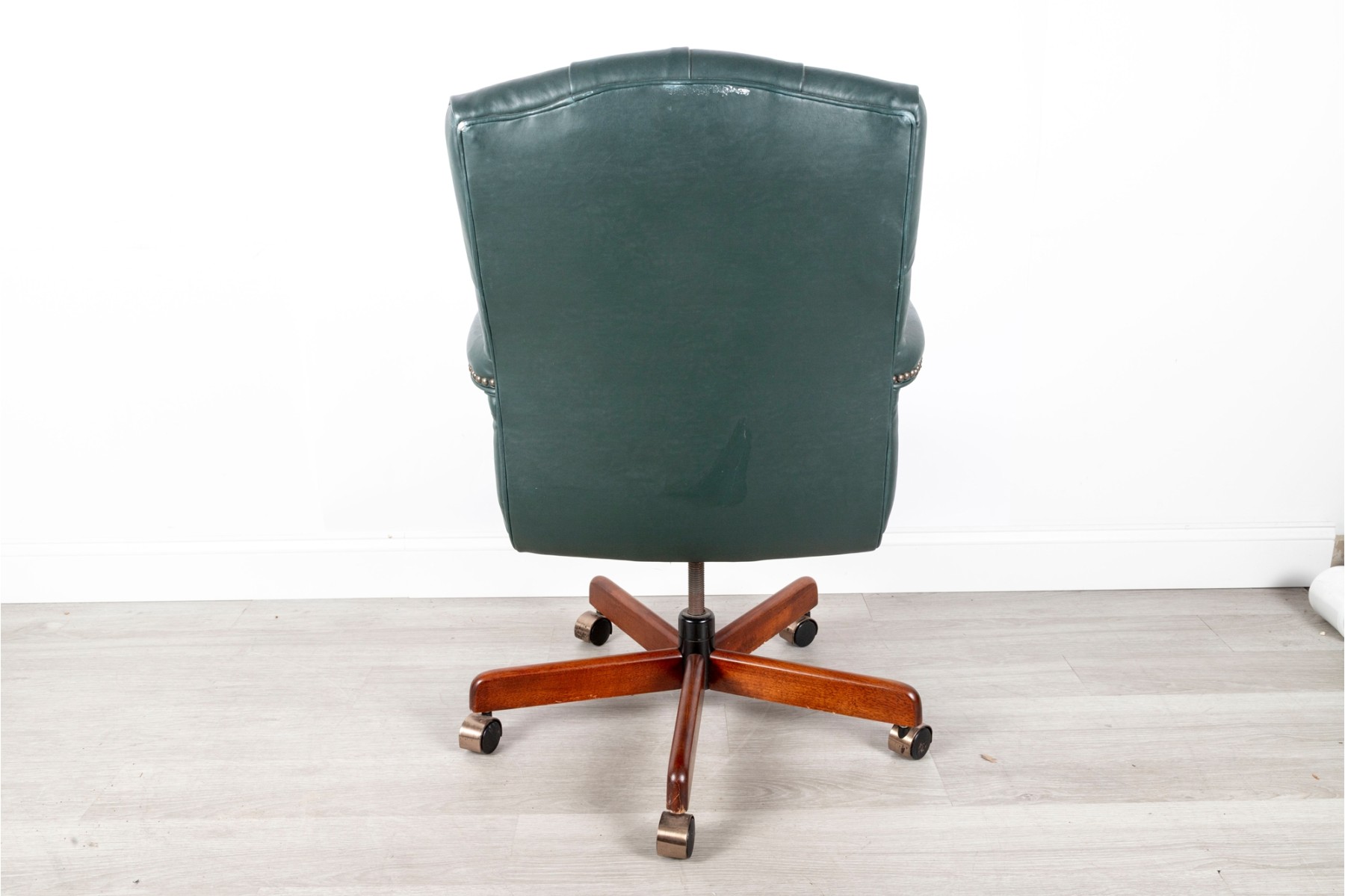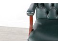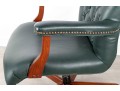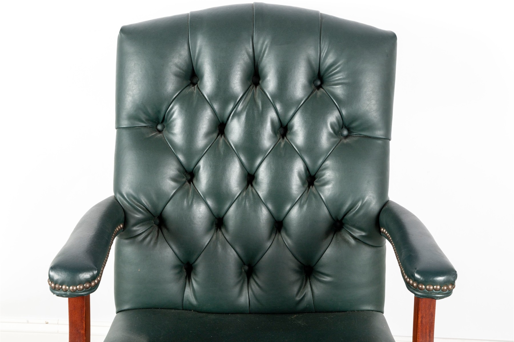 A Fairfield Furniture green vinyl office chair featuring a classic design with a padded seat and backrest, button tufted and upholstered in green vinyl tacked with brass nailhead trim.