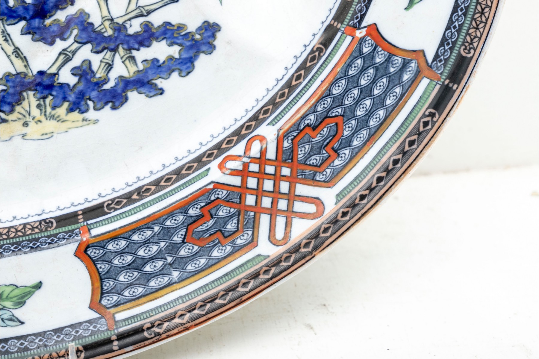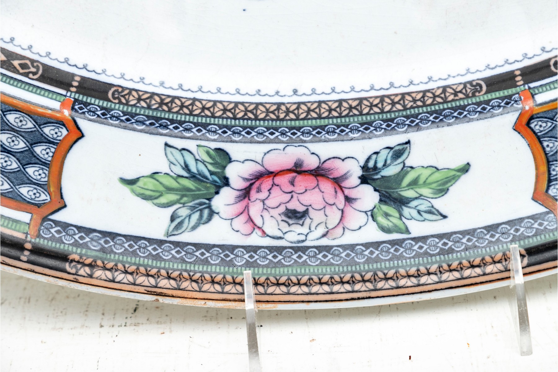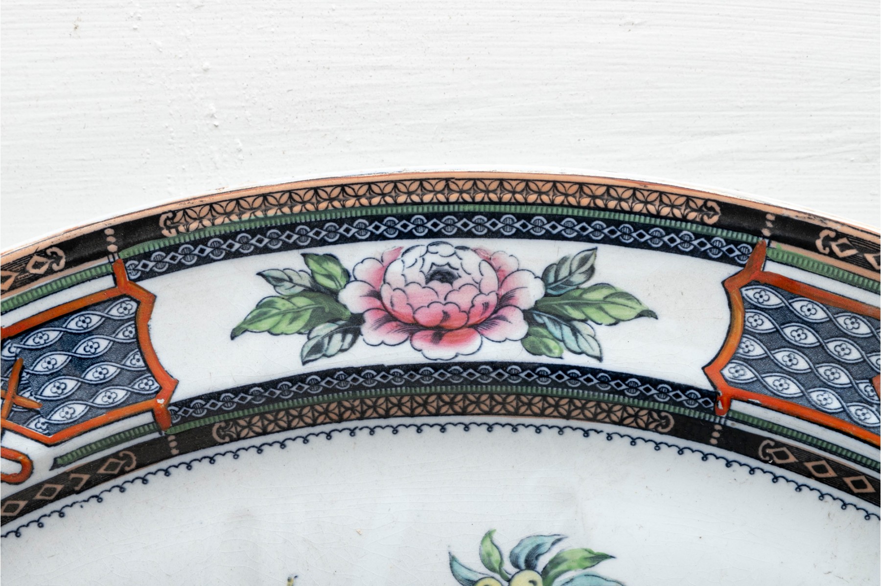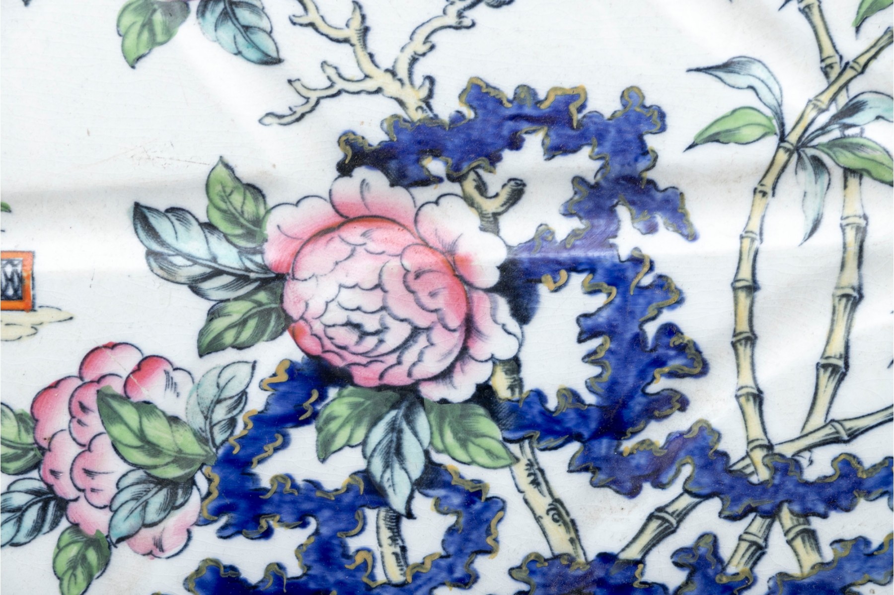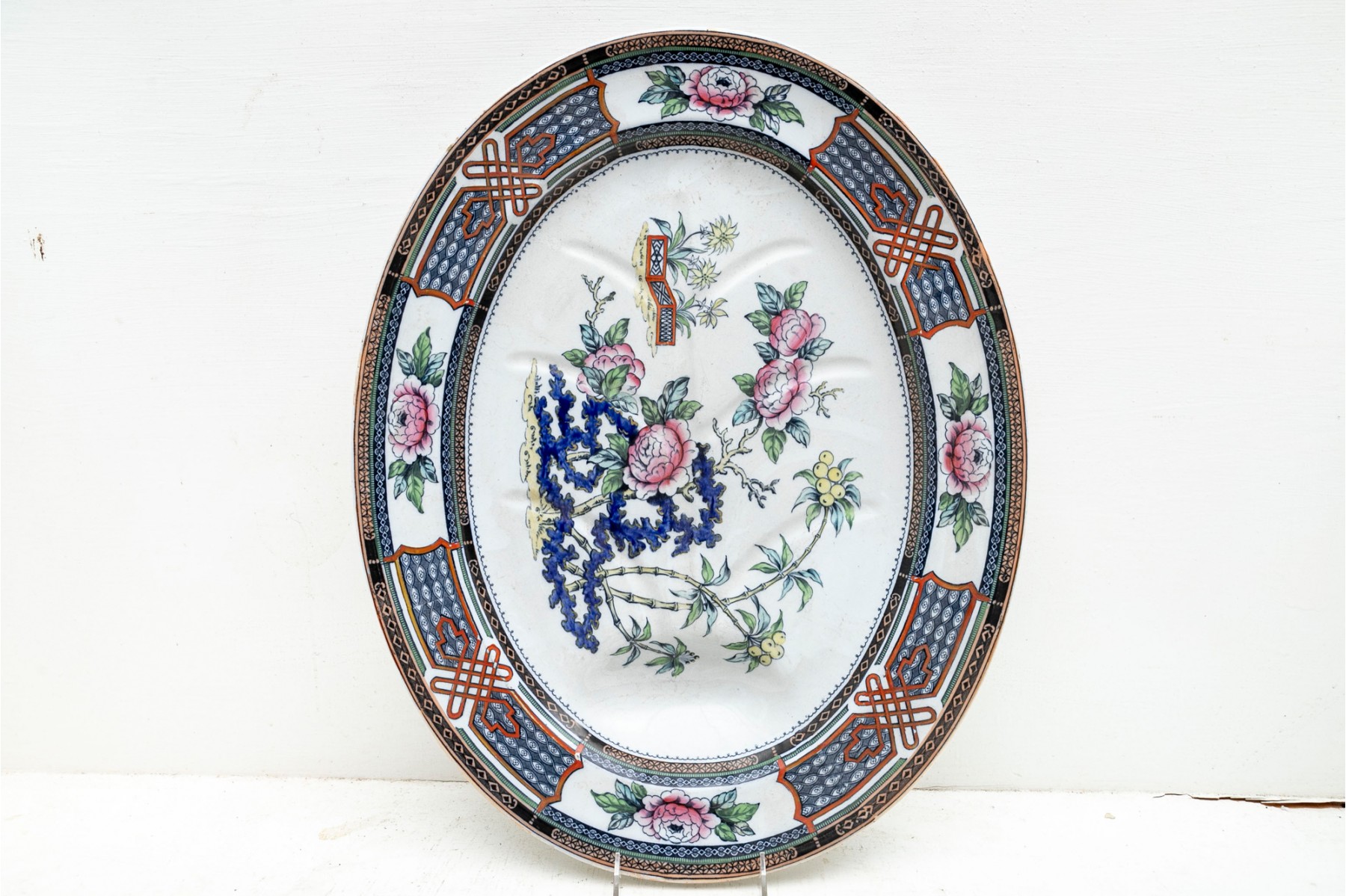 A beautiful large oval ceramic platter with a subtle fishbone intaglio design overlaid by a central display of famille rose flowering and fruiting branches near a fence. The rim is decorated with vibrant floral sprays alternating between blue and red lattices. Stamped on the underside, potentially appearing "PG Fernival."